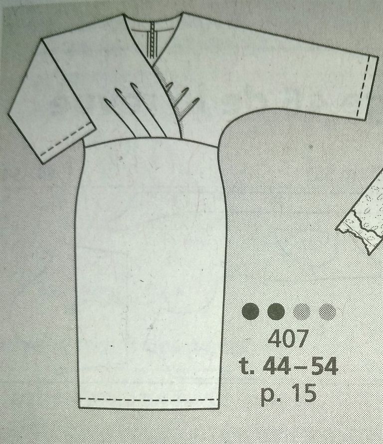 Cette robe est elle aussi très sexy! Il s’agit encore une fois d’une robe fourreau. Le buste est orné de découpes princesses. Il est croisé sur ces découpes, l’aisance est obtenue à l’aide des plis. Les manches sont coupées à même. La jupe comporte deux plis creux à la taille pour conserver un peu de confort. Elle va de la taille 44 au 54.