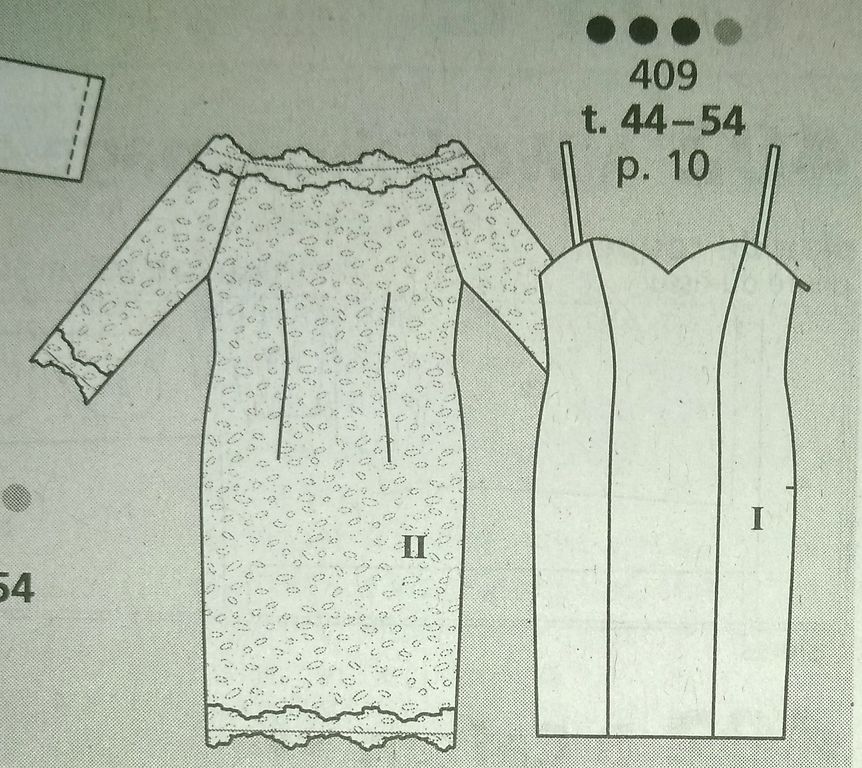 Cet ensemble est d’un charme fou! Il est composé d’un fond de robe bustier à découpes et avec des petites bretelles. Is se porte sous la robe fourreau réalisée en dentelle. L’encolure bateau, les bas de manches et l’ourlet du bas sont bordés d’une bande de guipure festonnée. Elle va de la taille 44 au 54.