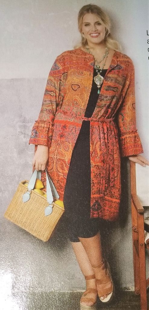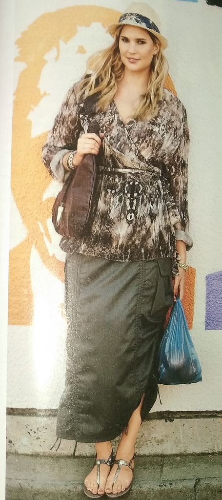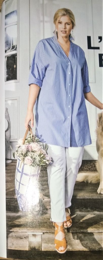 J’adore ce chemisier de forme cache cœur. Il se nouent sur le côté à l’aide d’un lien. Le pan du devant est orné d’un large volant. Les manches sont longues mais aussi élastiquées à distance du bas de manche. Elle va de la taille 44 au 54.