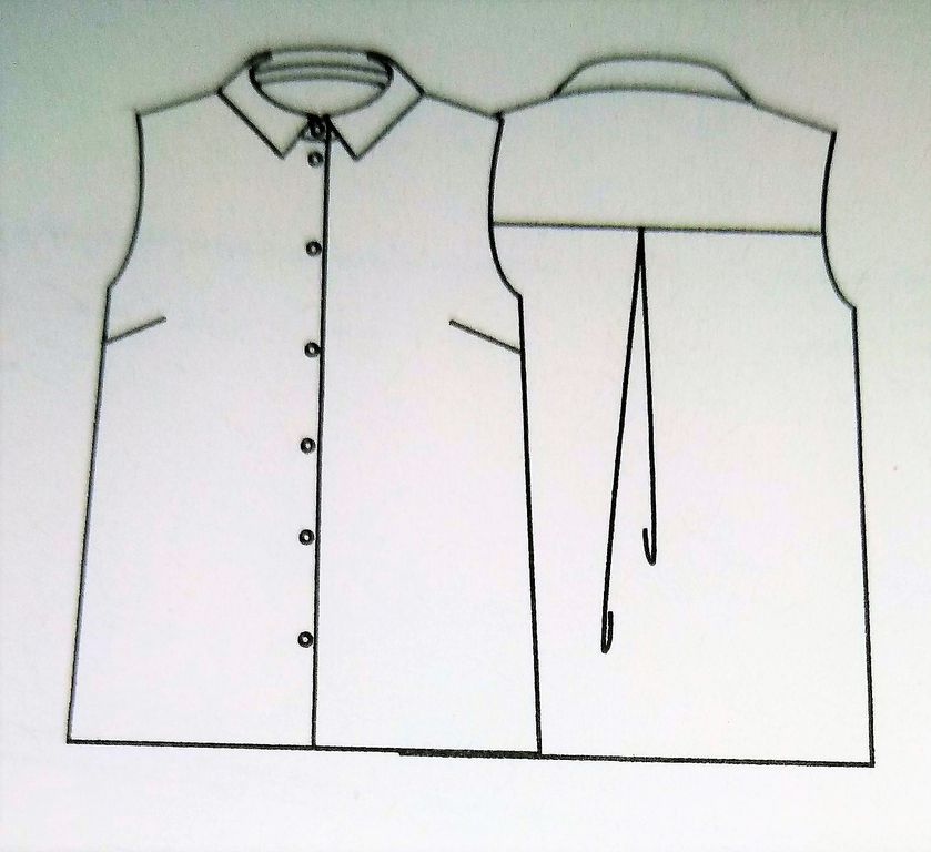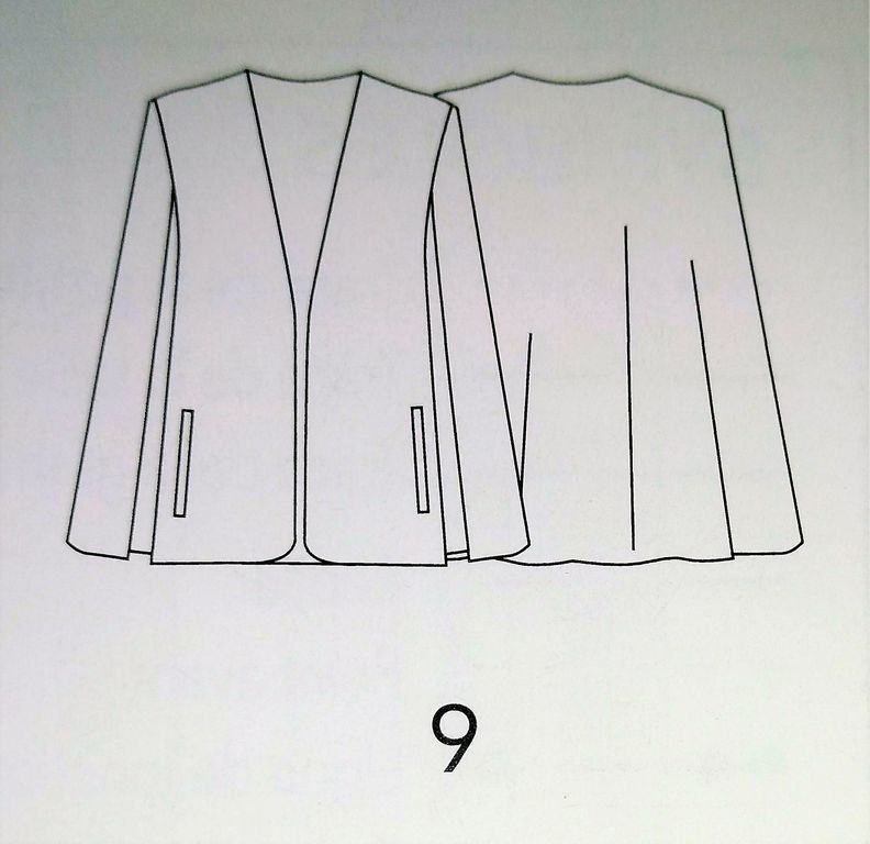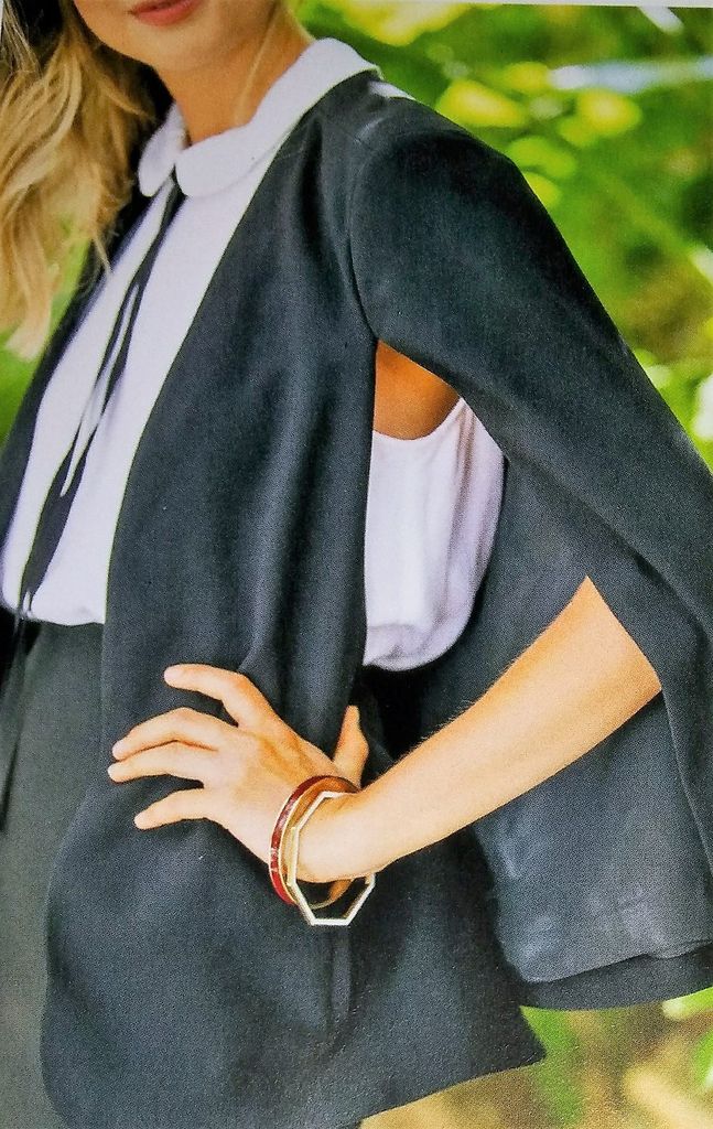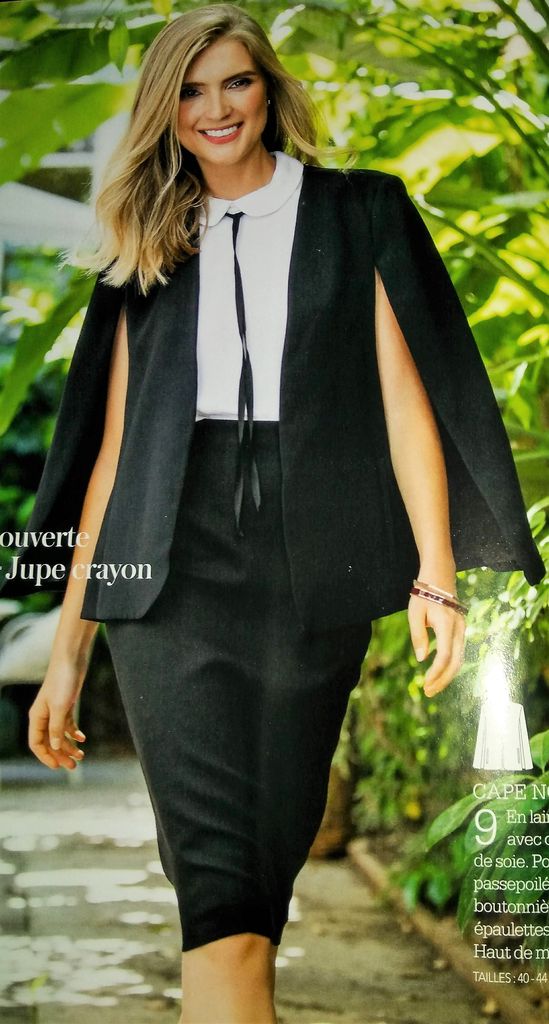 Cette cape de mi-saison est très élégante. Vue de face on dirait une veste droite et simple avec deux poches passepoilées. Mais en regardant de plus prés, les « manches » n’en sont pas elles se prolongent dans le dos en cape. Elle est en tailles 40 – 44 – 48.