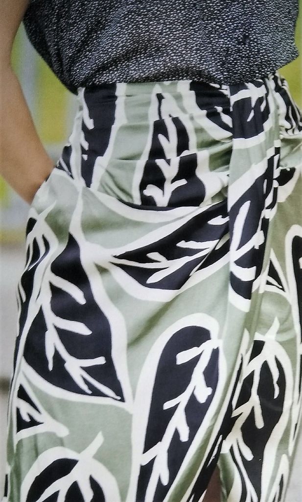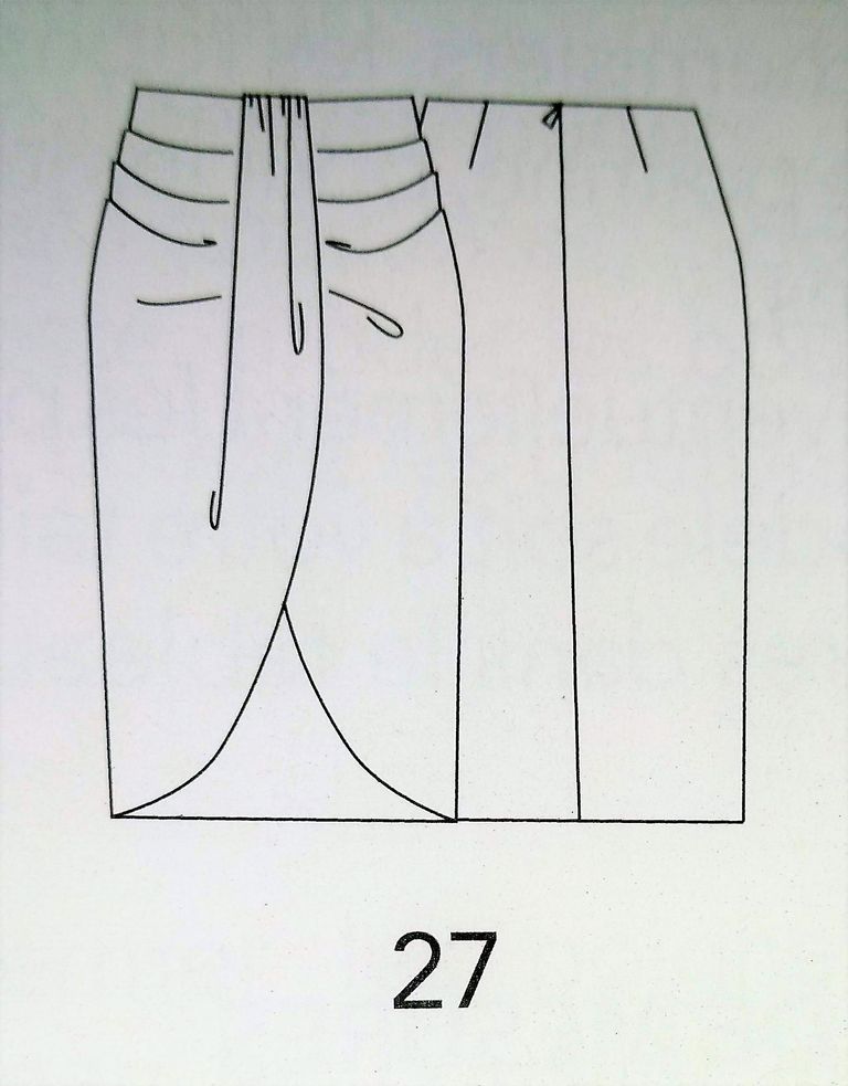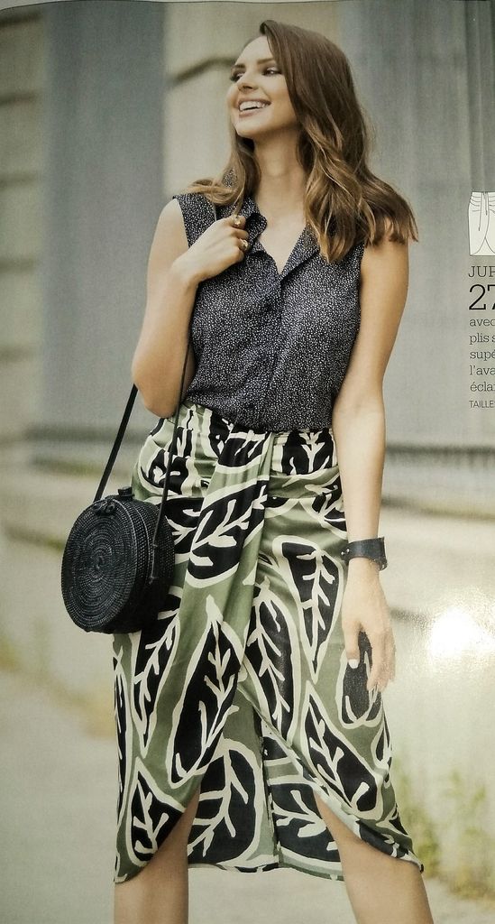 J’adore cette jupe! Je la trouve parfaite pour l’été et je la verrai bien dans un tissu hawaïen! Elle est ornée de plis drapés sur les côtés. De plus elle est croisée sur le devant avec un pan qui remonte jusqu’à la ceinture. Elle est en taille 40 – 44 – 48.