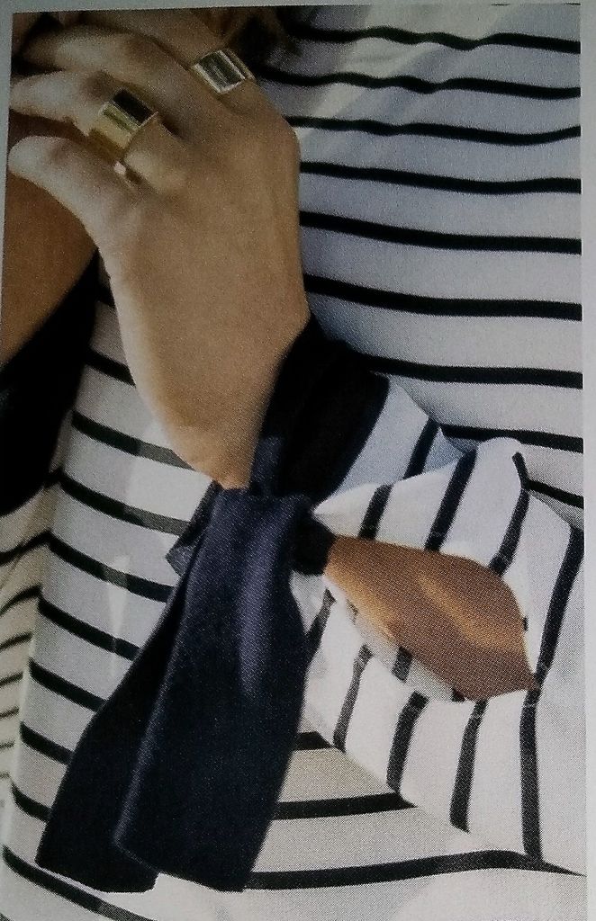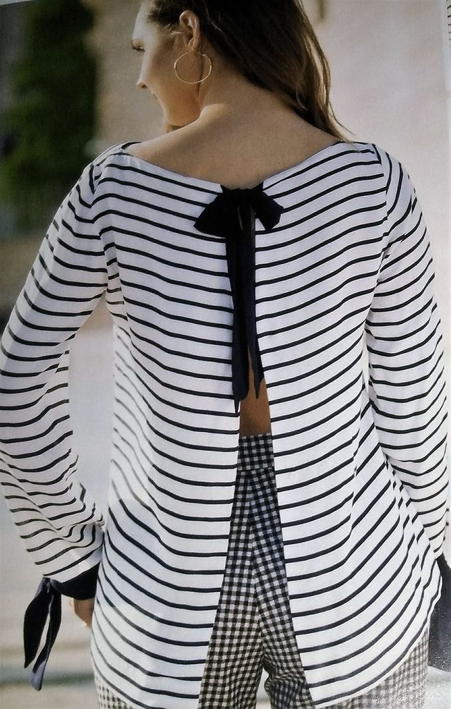 Cette marinière est originale! Elle est classique sur le devant, avec comme fantaisie les poignets noués contrastants. Le dos lui est ouvert sur toute sa hauteur. Il est fermé à l’encolure avec un ruban à nouer. Elle est en tailles 40 – 44 – 48.