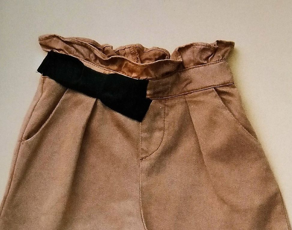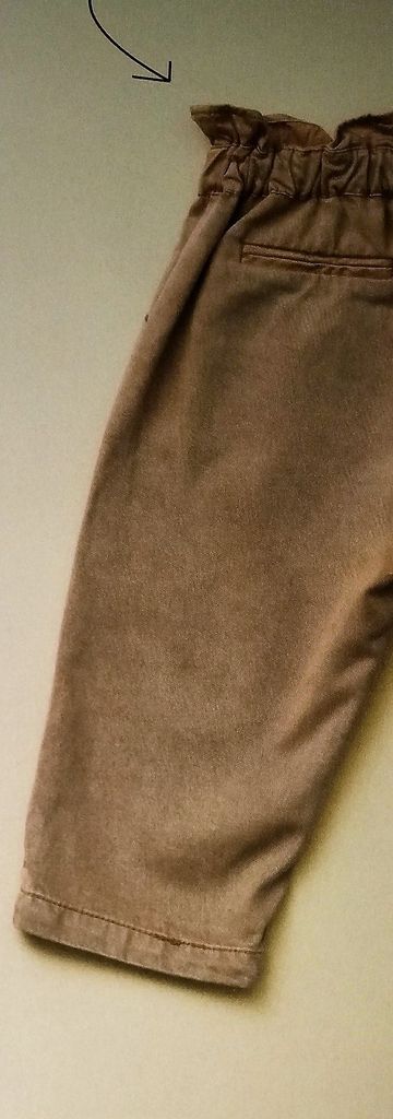Mon dernier coup de cœur est pour un pantalon bébé! Il sort de l’ordinaire mais aussi très élégant. La ceinture élastiquée est de forme paper-bag. Le devant est agrémenté d’un petit nœud mais aussi de deux plis ainsi que des poches de côté. Il est en taille 12 -18 – 24 mois.
