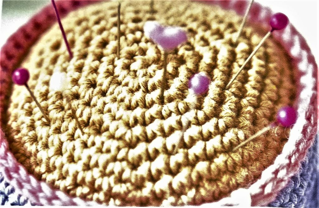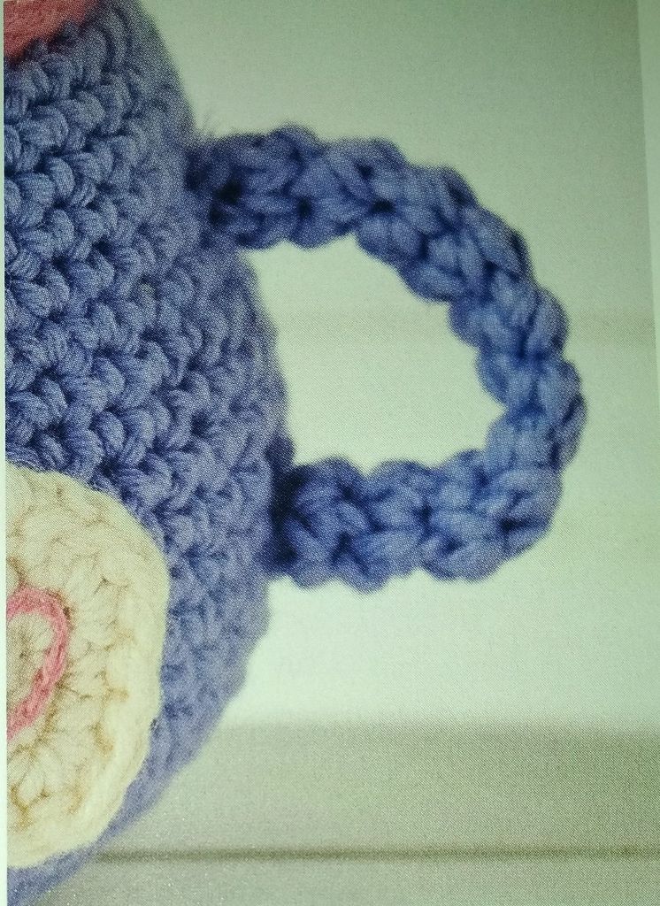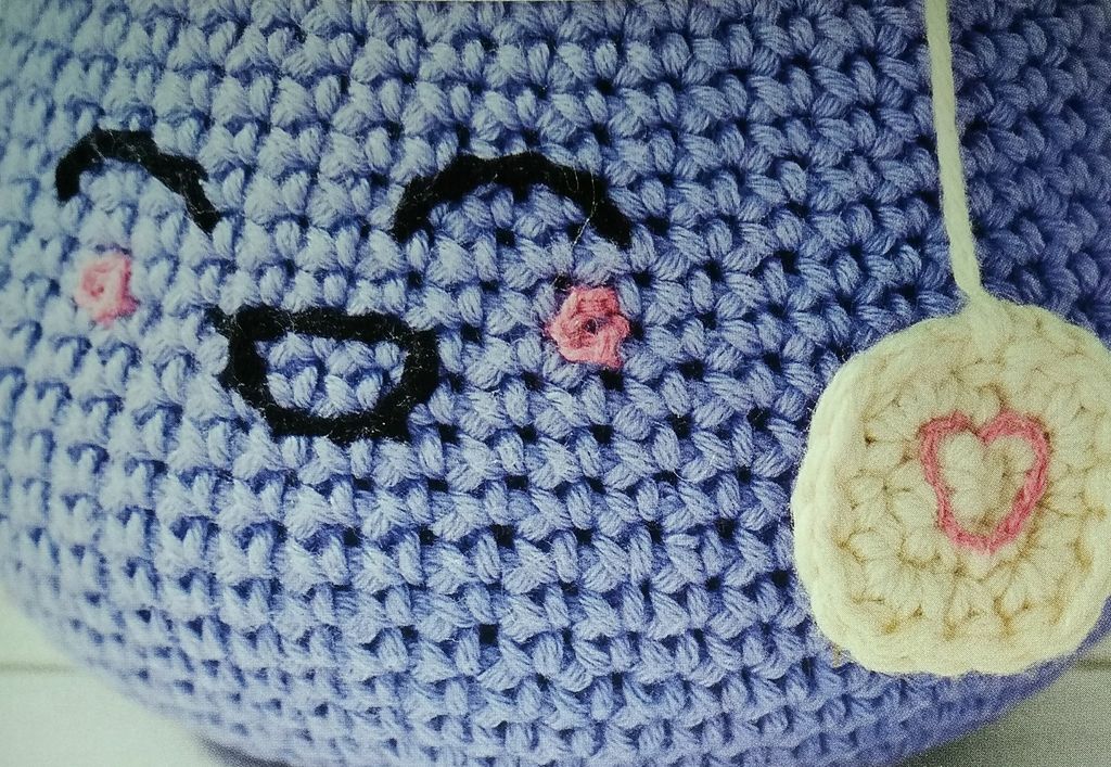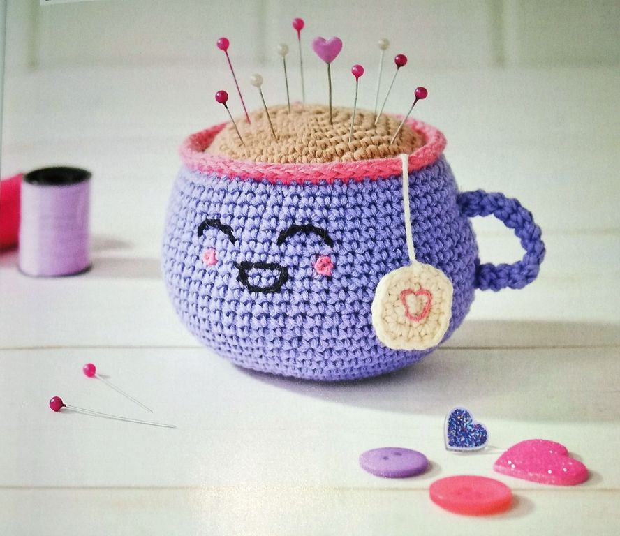 J’adore cette tasse porte épingle, elle peut trouver sa place dans l’atelier d’une couturière sans problème. Elle est crochetée en rond, je dois avouer que ce n’est pas la méthode que je préfère. Un sachet de thé est représenté, et la tasse est ornée d’un visage souriant.