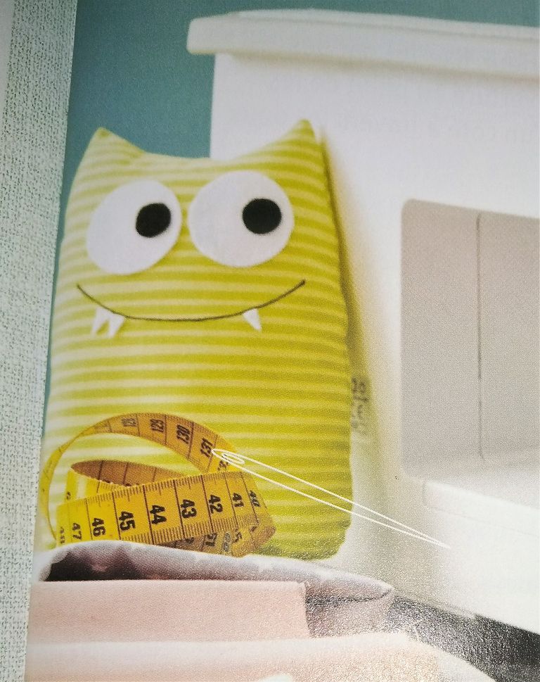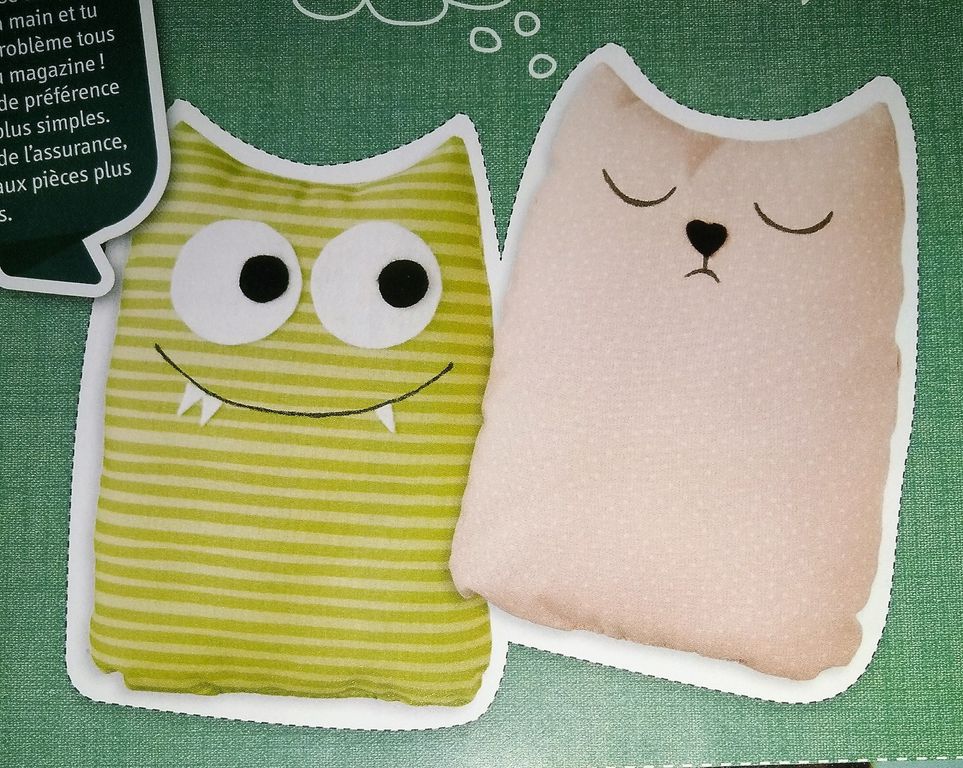 Simple, efficace, et très chou, j’adore ce coussin chat. Je le verrais bien, avec de quoi le lester dans le bas, il servirait de cale-porte. Les yeux sont ou brodés ou en feutrine à vous de choisir.