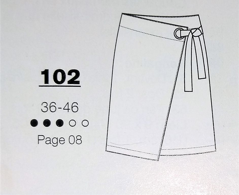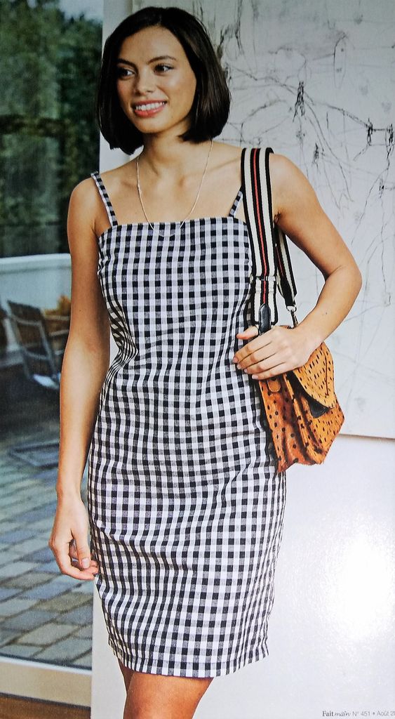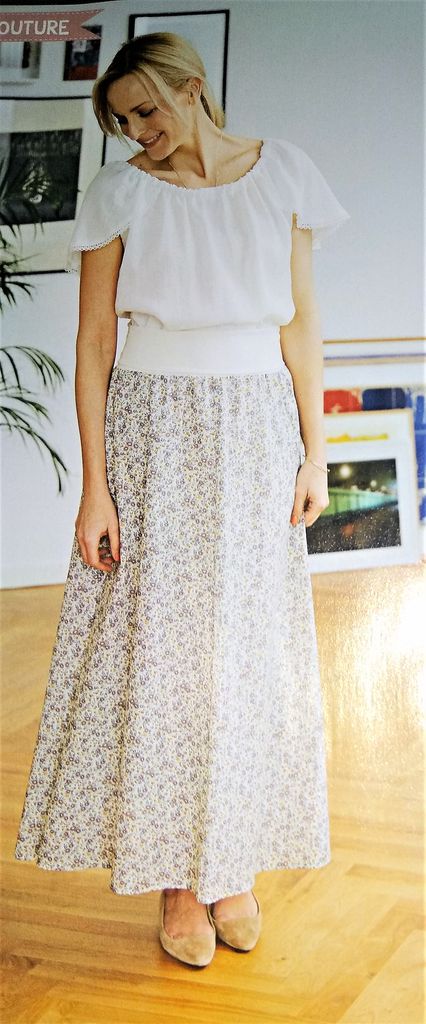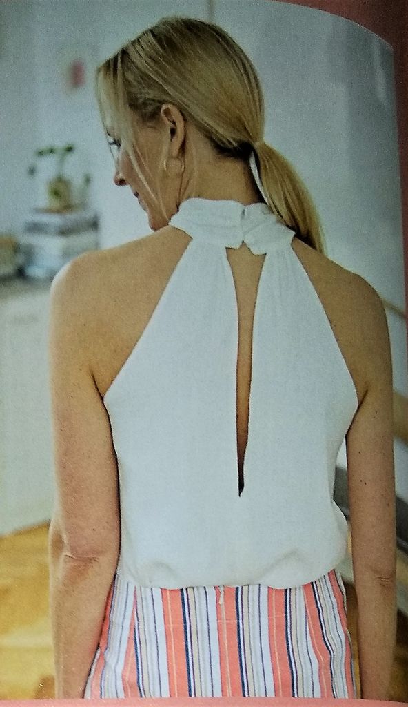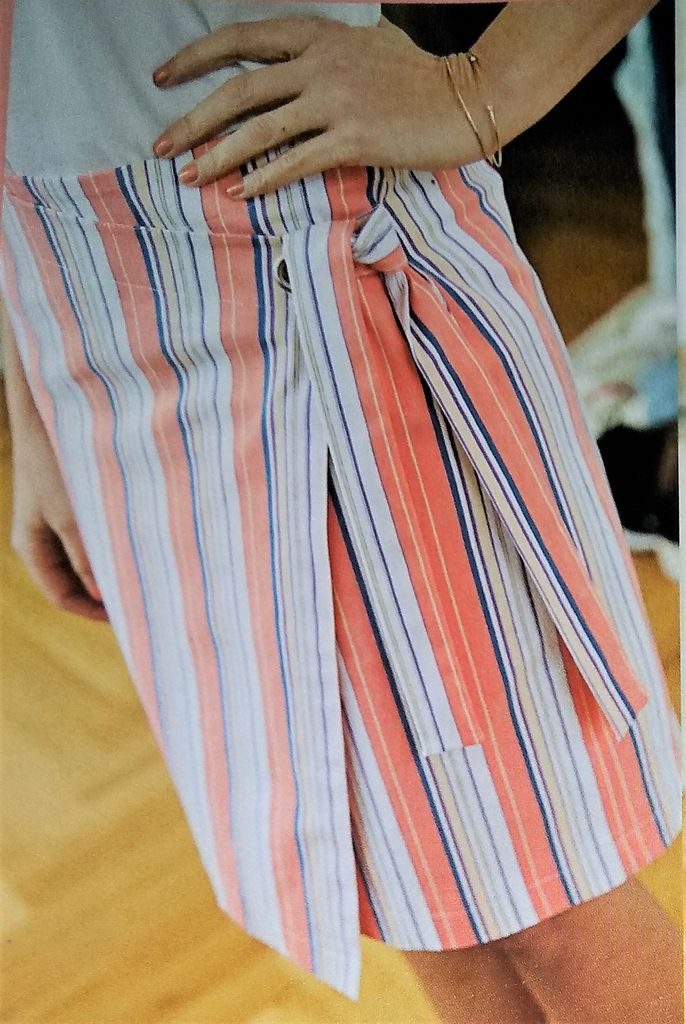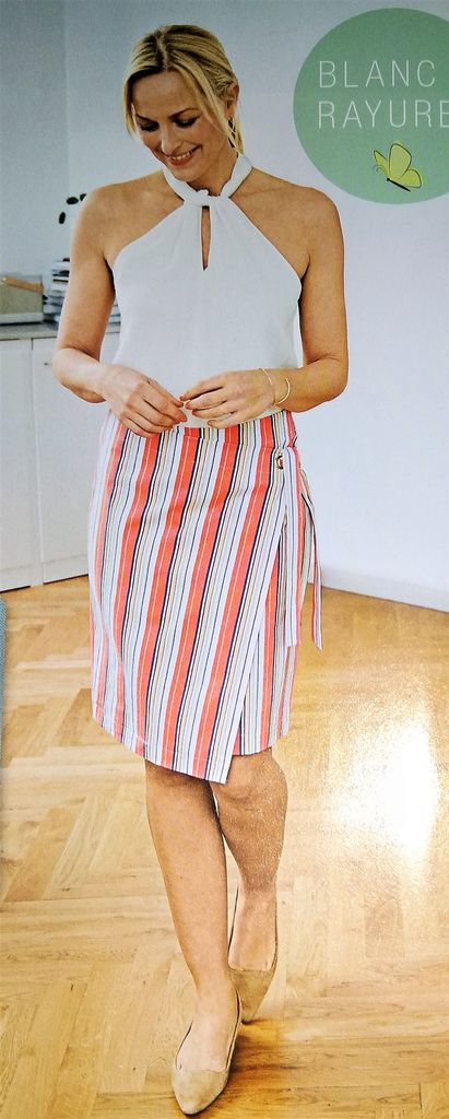 J’adore cet ensemble composé d’une jupe porte-feuille et d’un top sans manches. Le point de mire de celui-ci est son col fendu et noué sur le devant. Il se boutonne sur l’arrière en laissant une grande ouverture jusqu’au milieu du dos. La jupe possède un pan à attacher sur le devant, il est asymétrique. Les rayures verticales sont particulièrement adaptées pour ce modèle. Ils vont de la taille 36 au 46.
