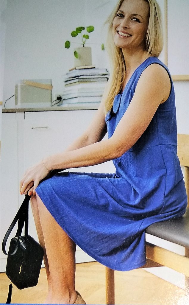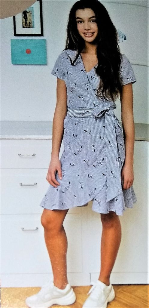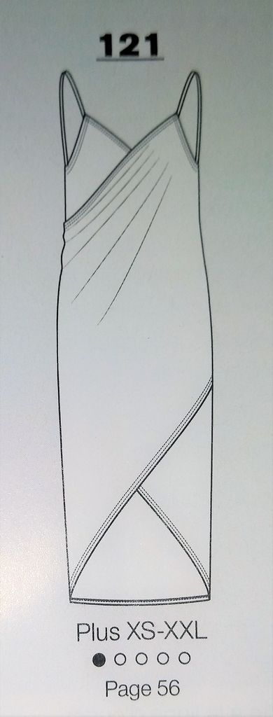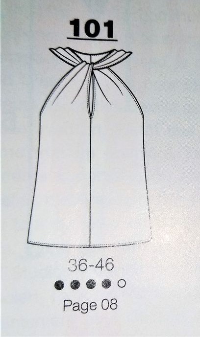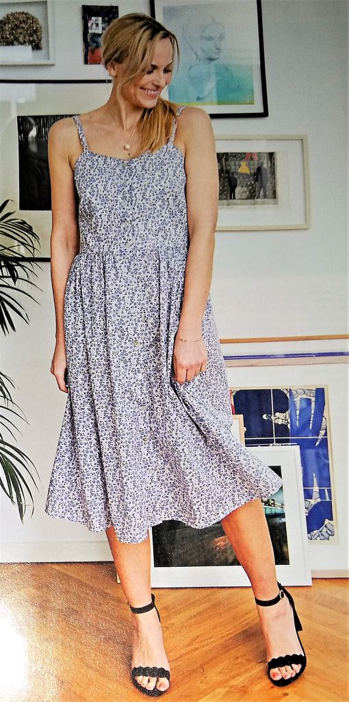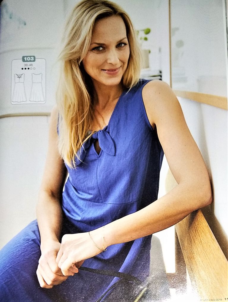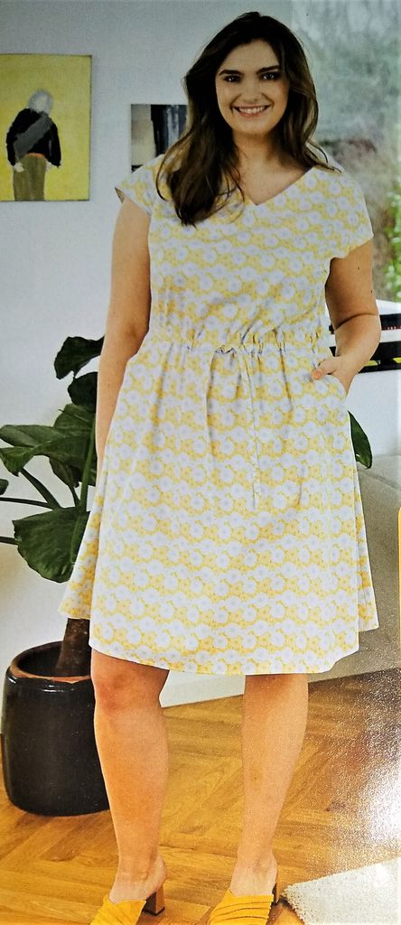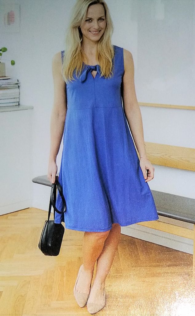 J’aime beaucoup la simplicité qui se dégage de cette robe. Son buste cintré est noué à l’encolure. Il est sans manches, la jupe est dansante. Elle va du 36 au 46.