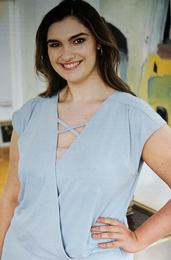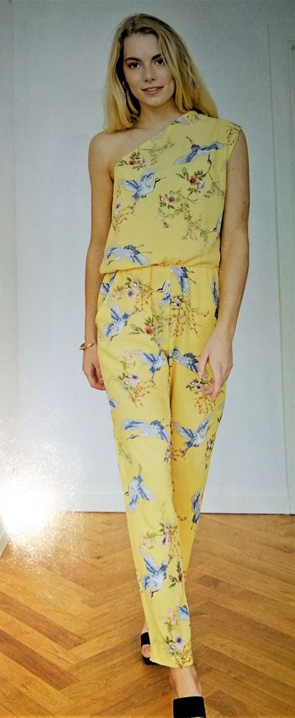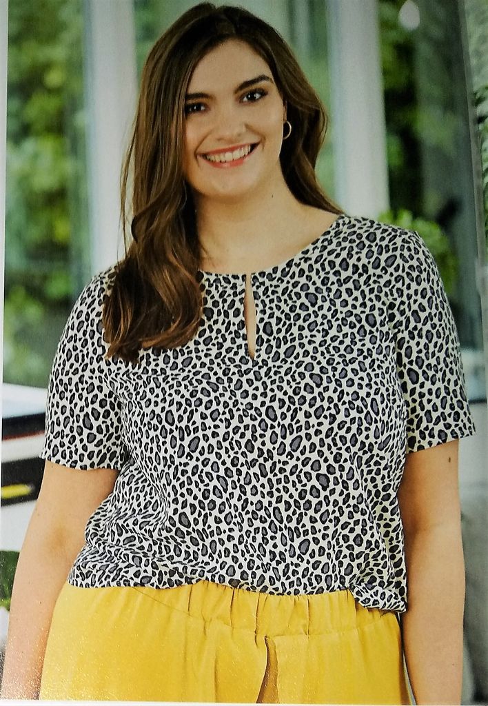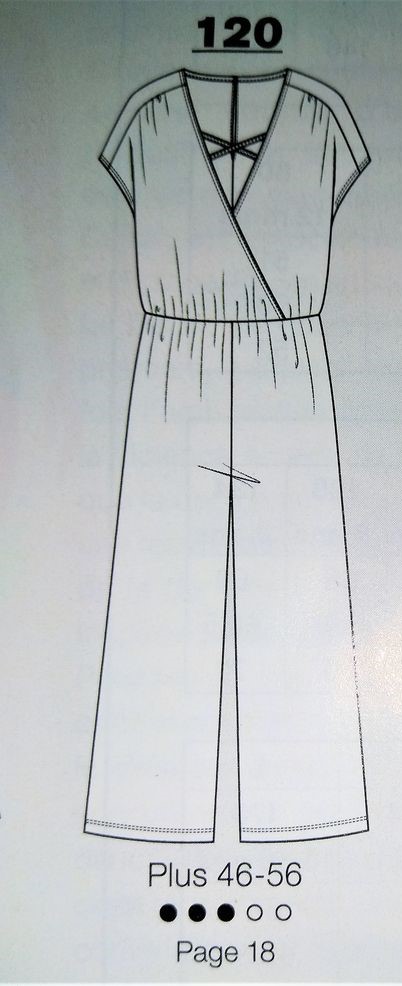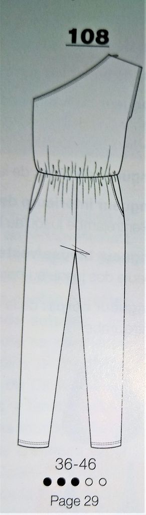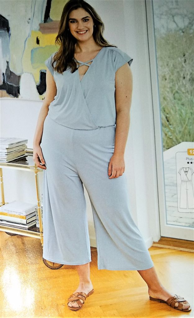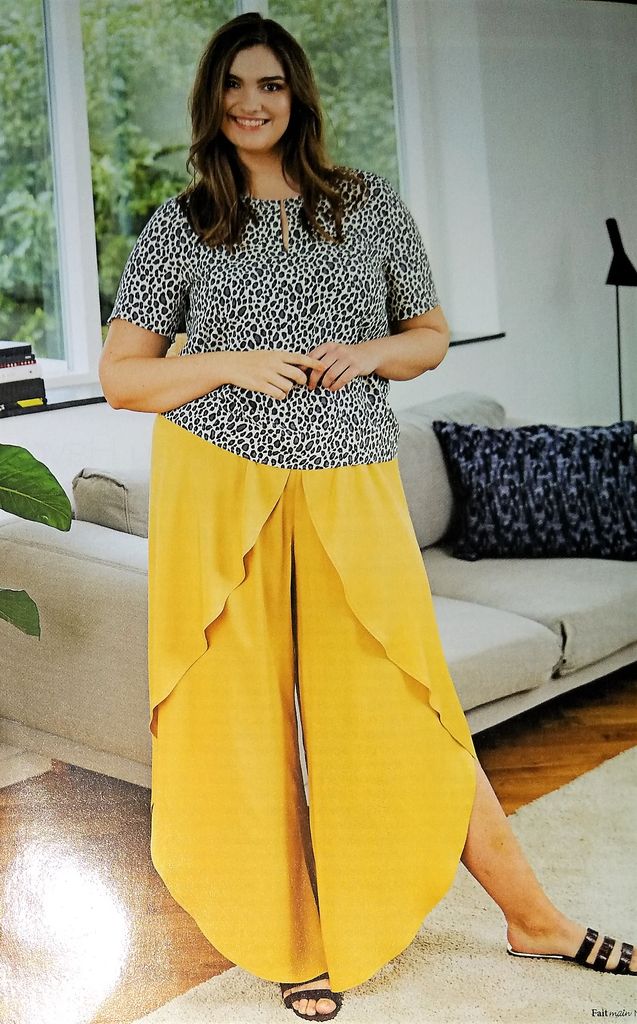 J’adore cette combinaison pantalon en grandes tailles. De plus elle est portée sur un mannequin plus size. Le haut blousant est de forme cache cœur avec deux petites brides pour éviter une ouverture trop lâche. La couture d’épaule est légèrement froncée sur le devant. Le dos dispose d’une ouverture fermée par un bouton. J’ai peur que pour l’enfiler ce soit un peu juste. Le pantalon est large et arrive à mi-mollet, j’aime moins le bas personnelement, je ne met plus rien qui soit large. Elle va du 46 au 56.