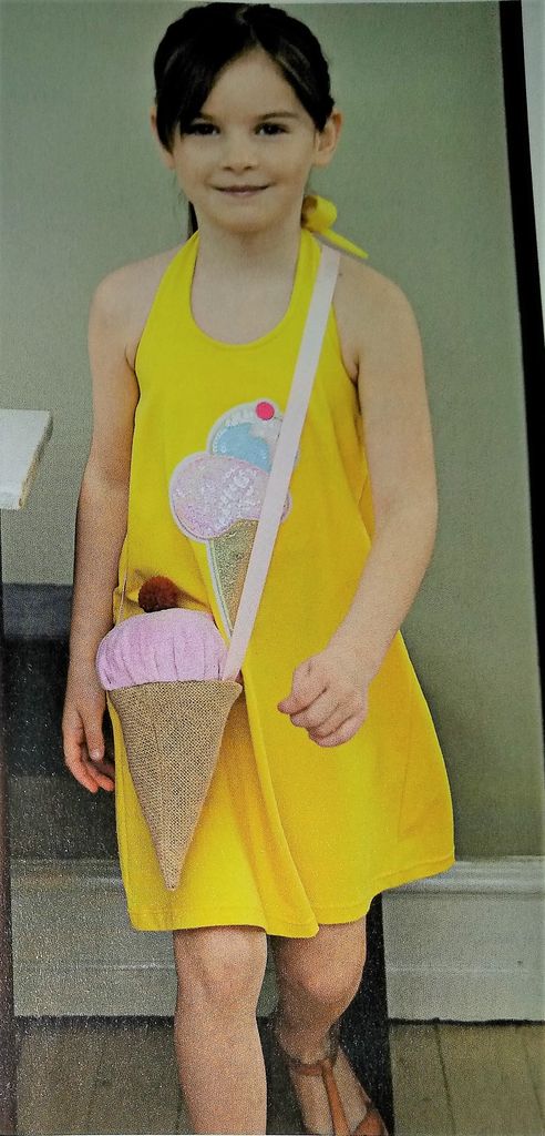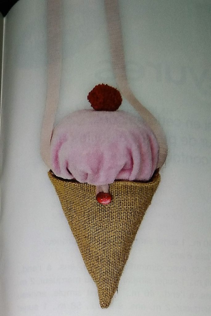 Je me suis limitée dans mes coups de cœur, car franchement il y en avait pas mal d’autres! Mon dernier est pour ce petit sac en forme de cornet de glace! Il est réalisé avec un cône en toile de jute. La boule de velours vient le fermer à l’aide d’un bouton.