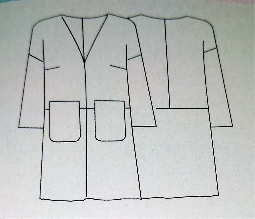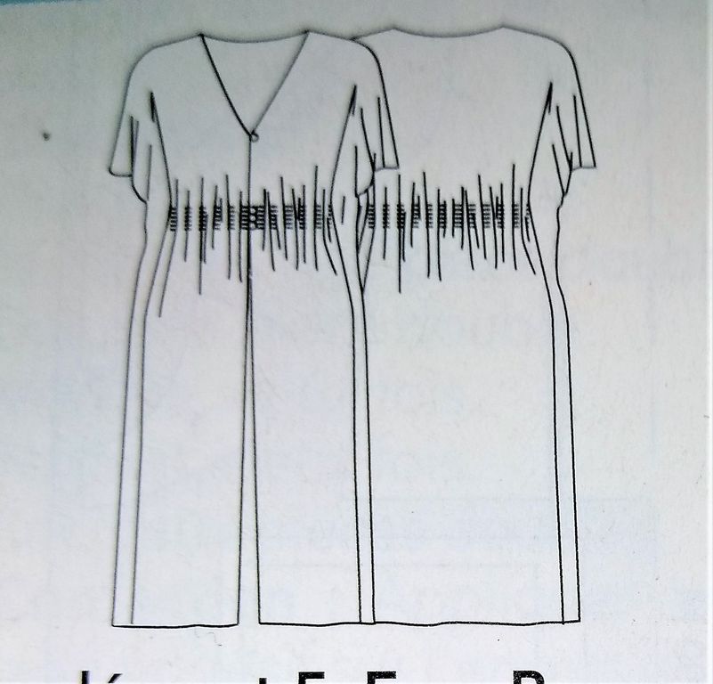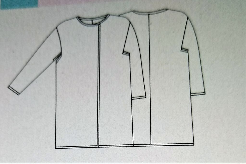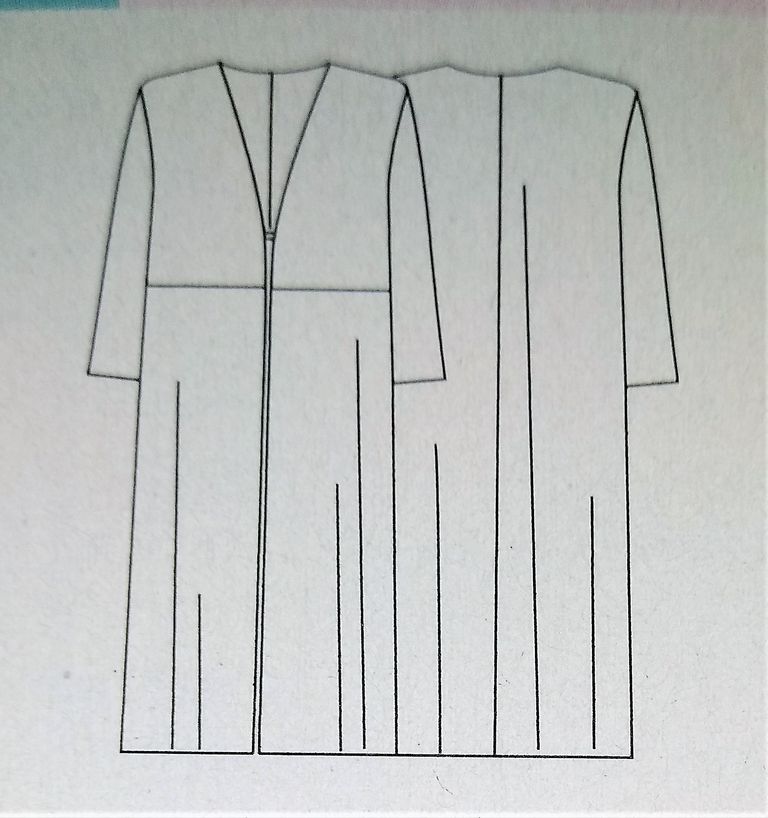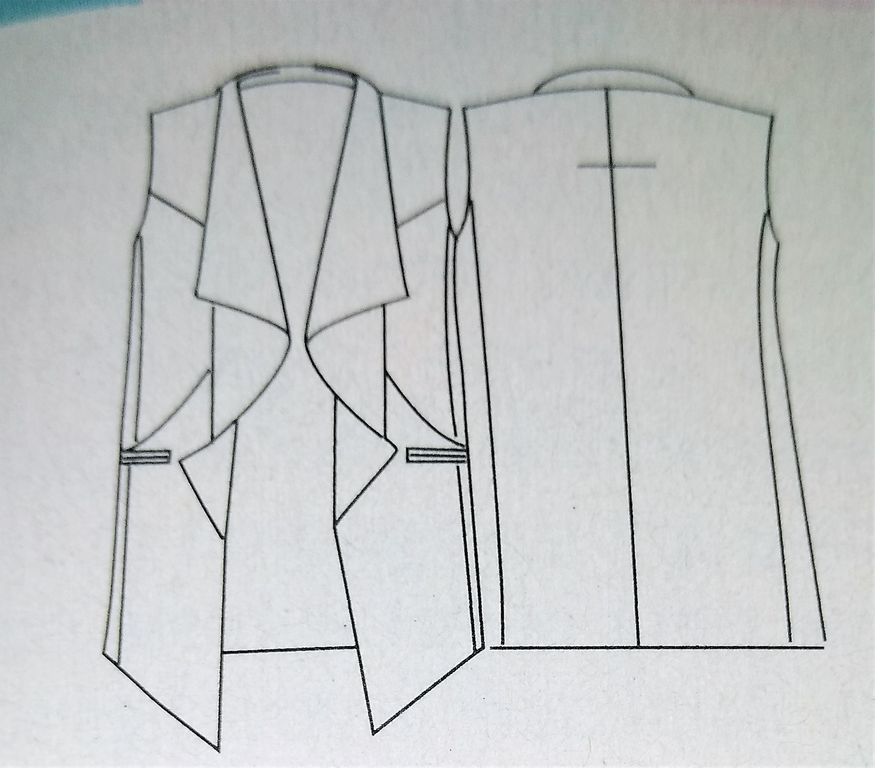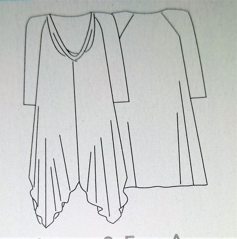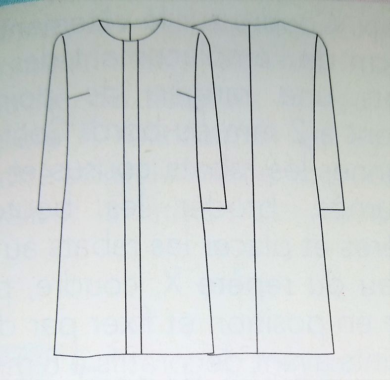 J’adore ces deux pièces mais séparément, en effet trop de volume tue le volume selon moi. Le gilet long est réalisé en maille, légèrement évasé. Le point de mire et son grand col qui tombe en cascade sur le devant. Les emmanchures sont échancrées. La robe saumon dansante est elle aussi confectionnée en maille. Ses manches trois quart sont raglans. Le devant dispose d’une couture au milieu devant ce qui permet d’avoir plus de volume et de finir les pans en pointe. Le col est façon bénitier avec une longue bande pliée en deux et cousue sur la profonde encolure ronde. Ils sont tous les deux en tailles unique taille 54.