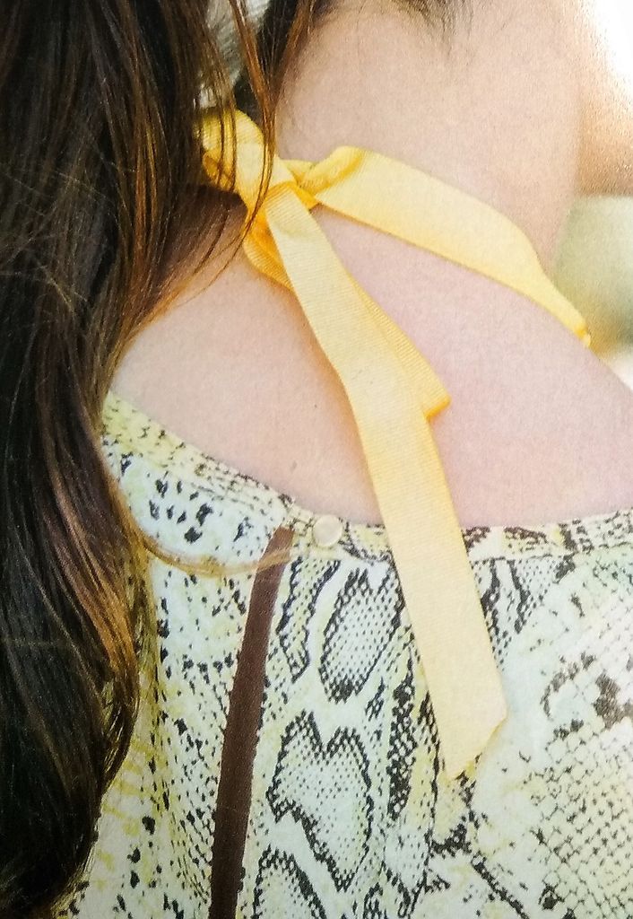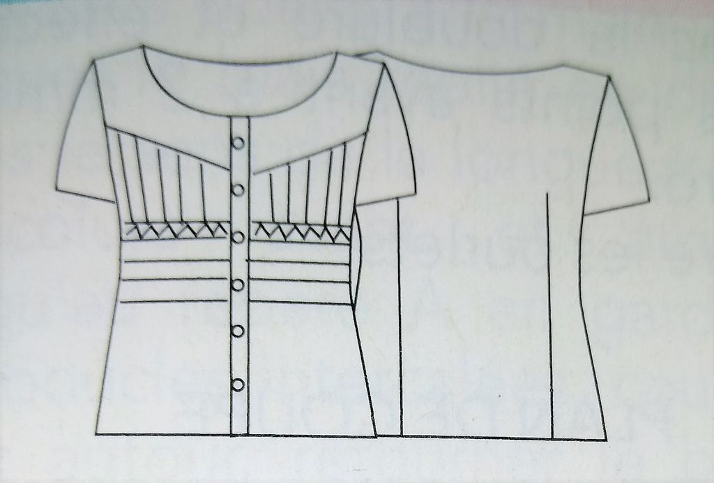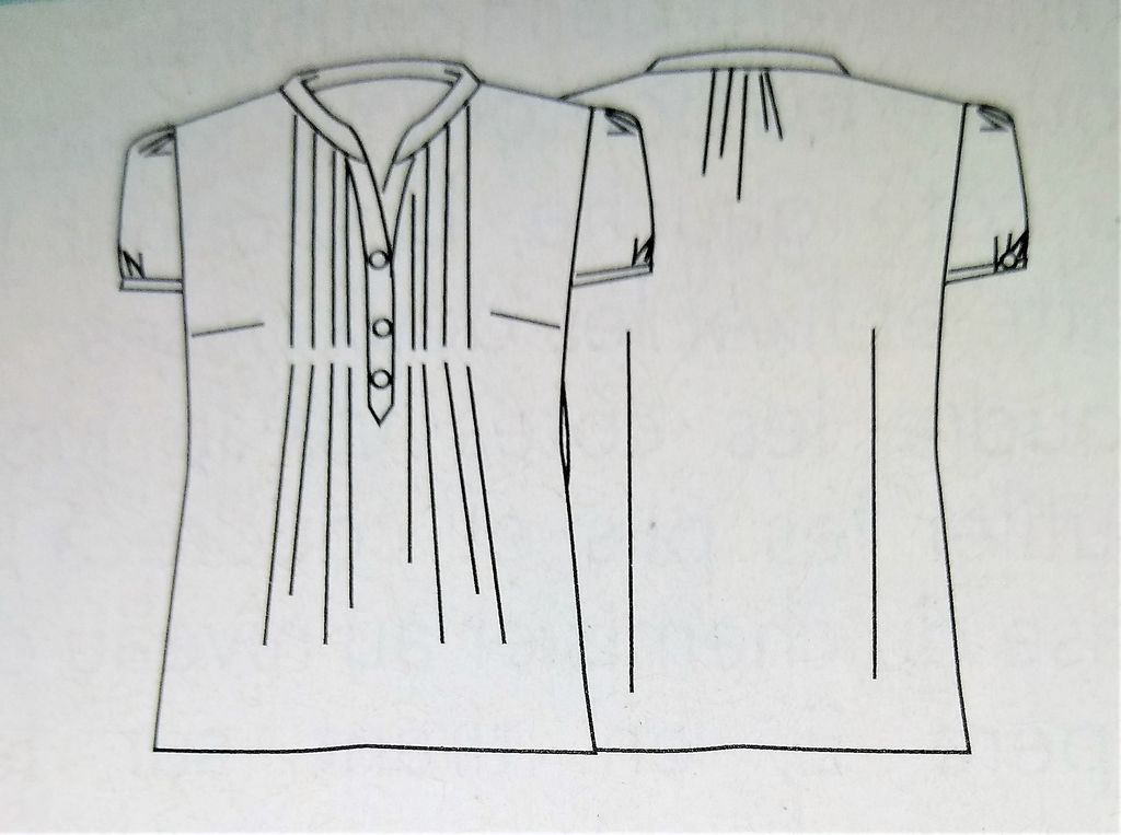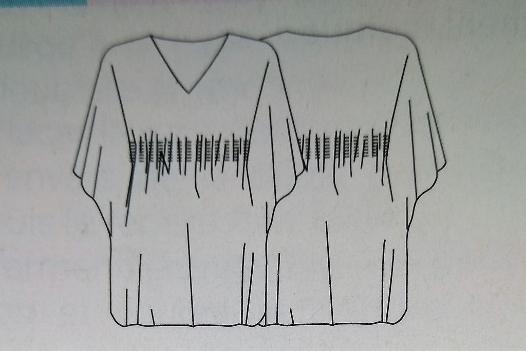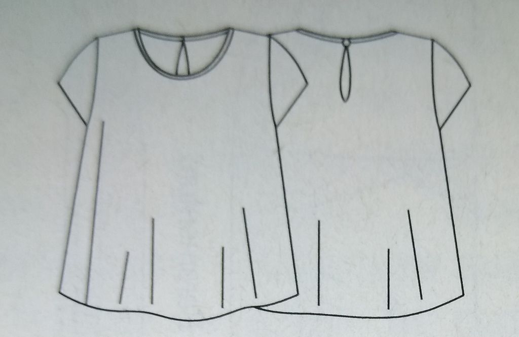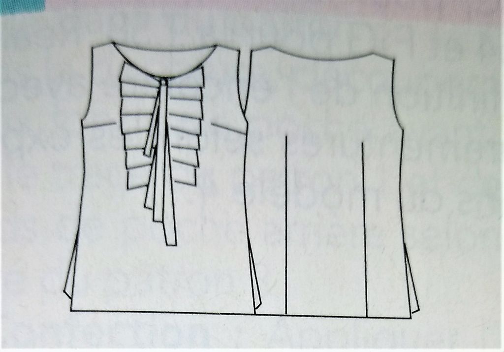 J’adore cette blouse Venca avec des plis. Elle est à manches courtes, avec une encolure ronde dégagée. Une patte de boutonnage et sa bande de bouton permettent de la fermer sur le devant. Celui-ci, est garnis de plis et de découpes qui me font penser à un petit corset.