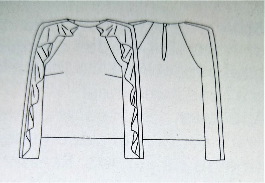 J’aime beaucoup le charme qui se dégage de cette blouse H&M studio. Je la trouve très élégante. Ici aussi les manches longues sont raglans mais avec deux coutures sur le dessus de manche, afin de les structurer et d’insérer les larges volants. L’encolure ronde est fermée par une fente dans le dos ainsi qu’un bouton.