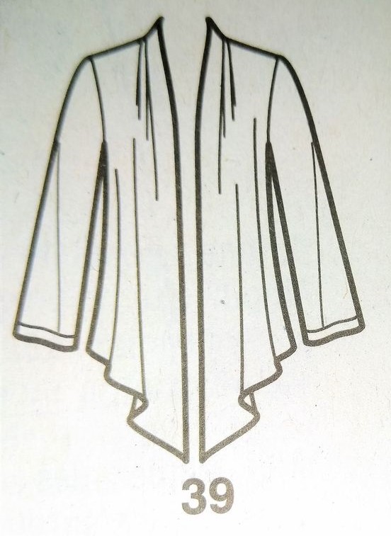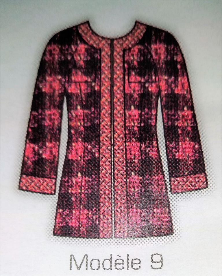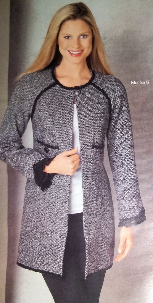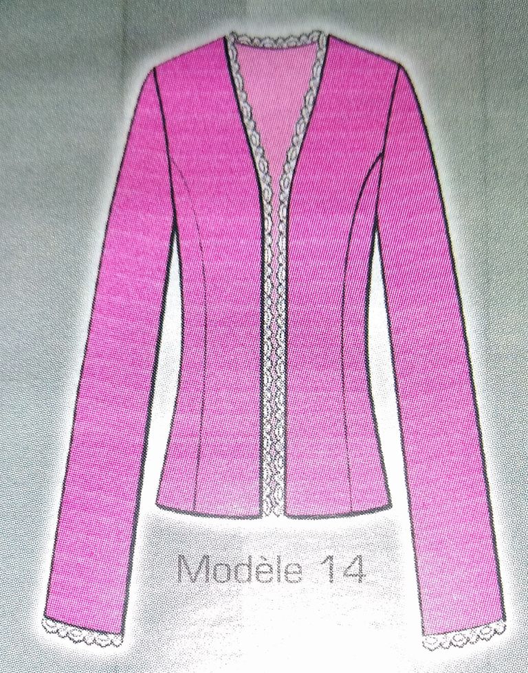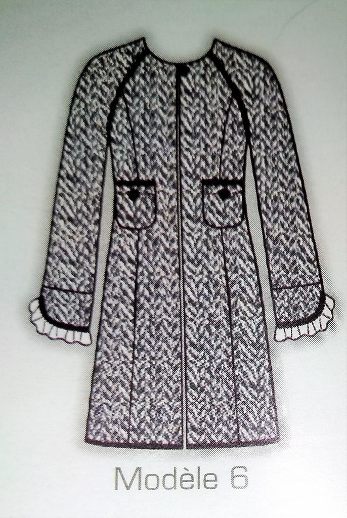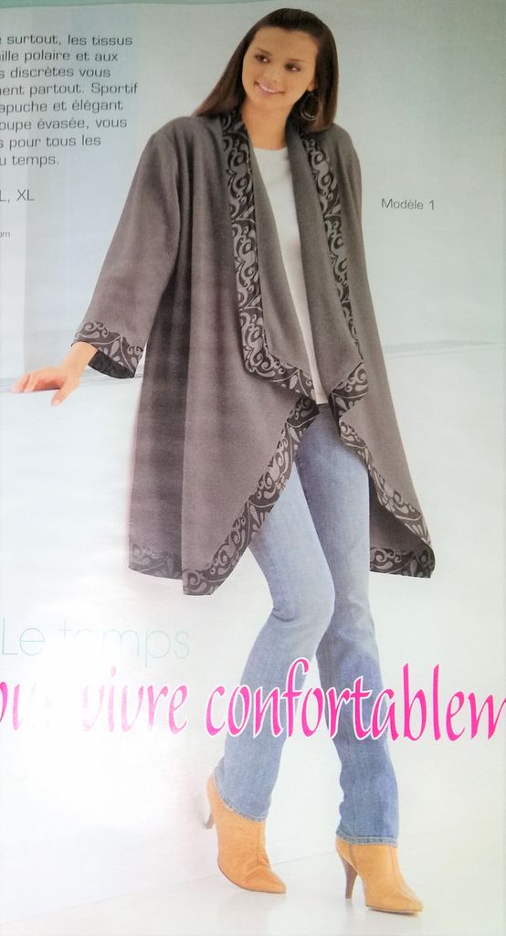 Bien que je lui trouve un air de déjà vu ce genre de veste, mais ça cartonne toujours. Les pans du devant sont évasés et flottants. Les manches sont longues. Elle est en taille 46/48 – 50/52 – 54/56. C’est un classique mais intemporels!