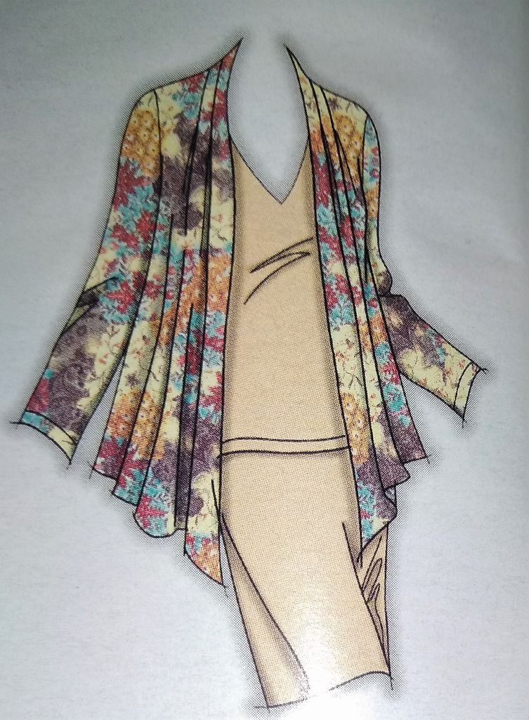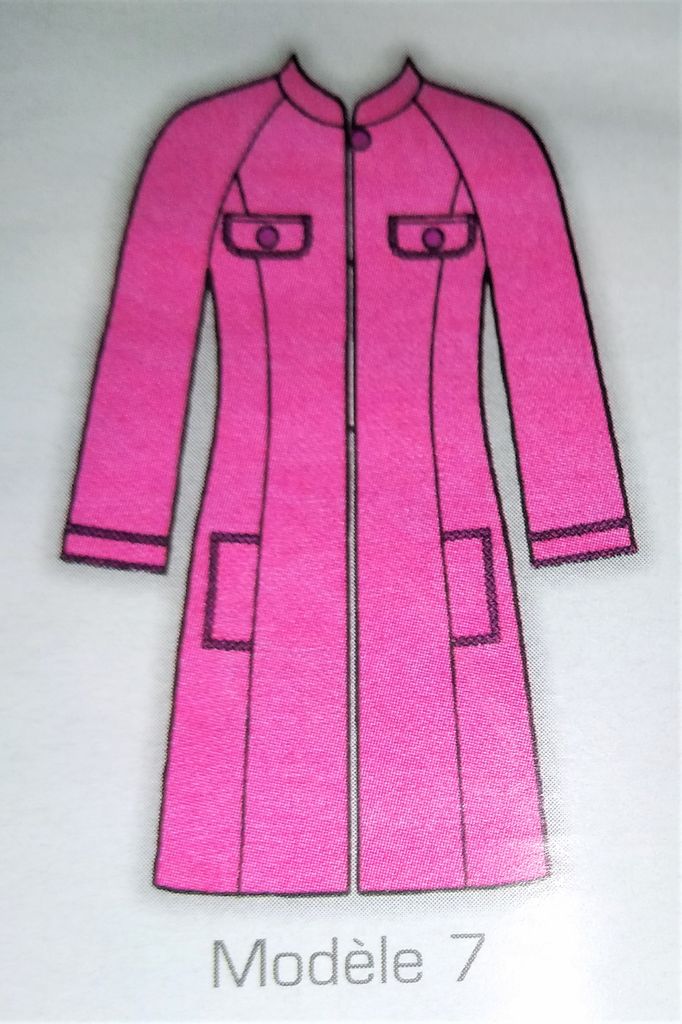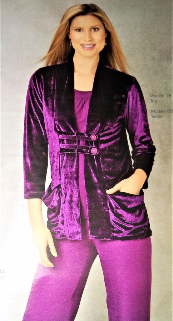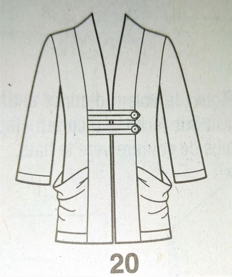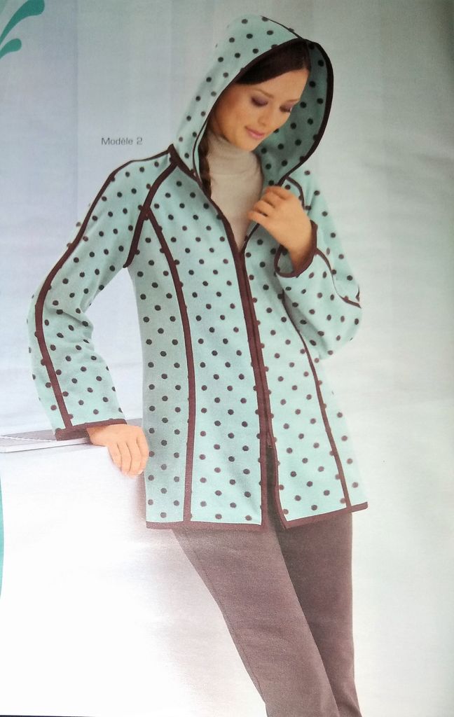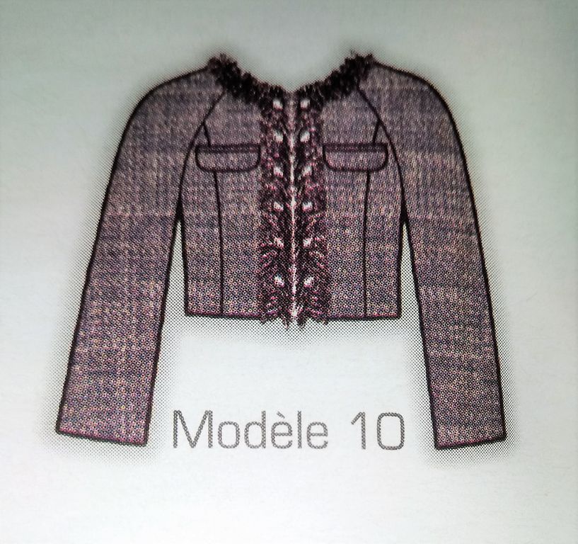 Bien que je lui trouve un air de déjà vu ce genre de veste, mais ça cartonne toujours. Les pans du devant sont évasés et flottants. Les manches sont longues. Elle est en taille 46/48 – 50/52 – 54/56. C’est un classique mais intemporels!