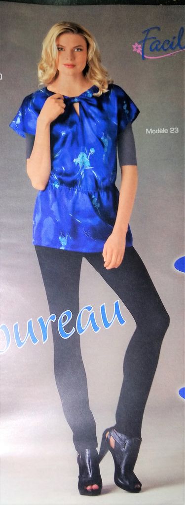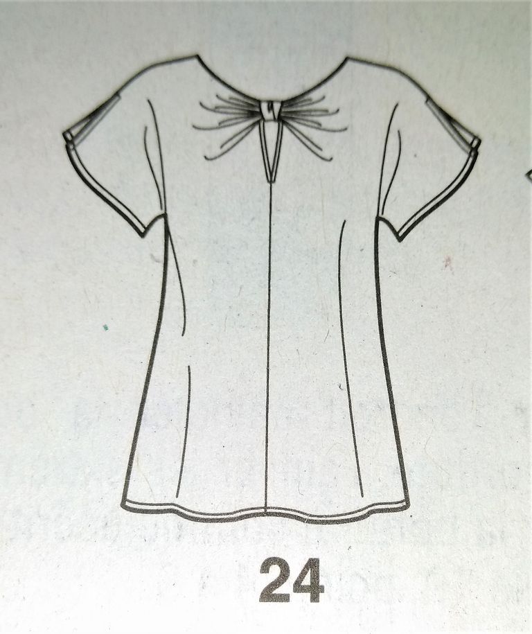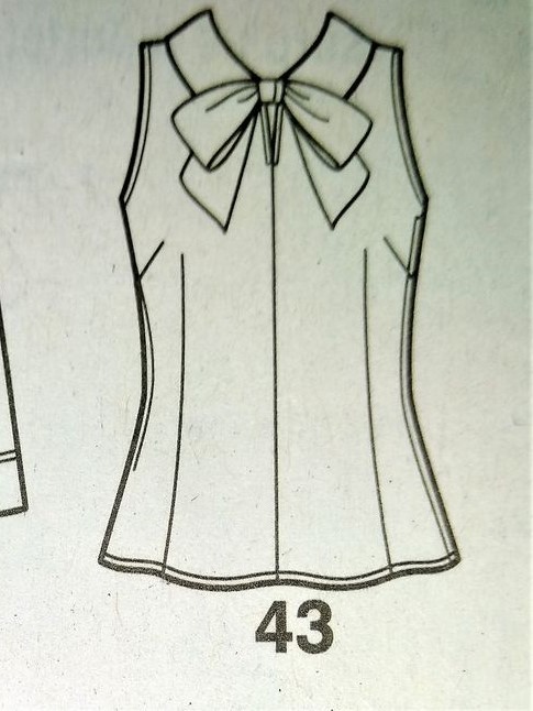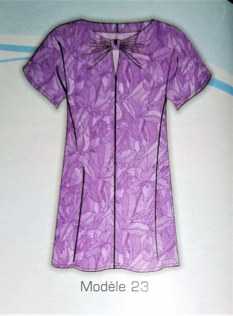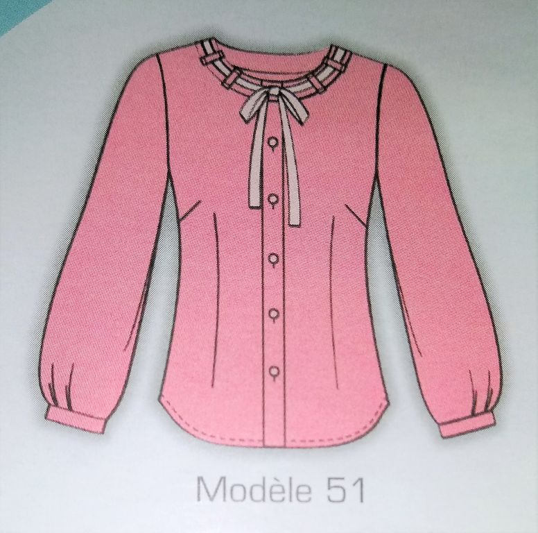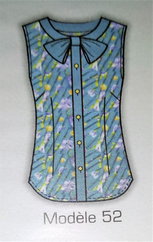 J’adore lorsque nous avons un modèle rétro c’est le cas ici. Il s’agit d’un chemisier sans manches avec lavallière à nouer sur le devant. Pour plus de confort nous avons une fente au col sur le dos et le devant. Il y a une fermeture à glissière invisible sur le côté. Le chemisier est en taille 38 – 40 – 42.