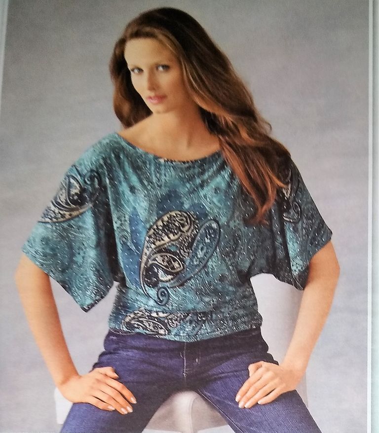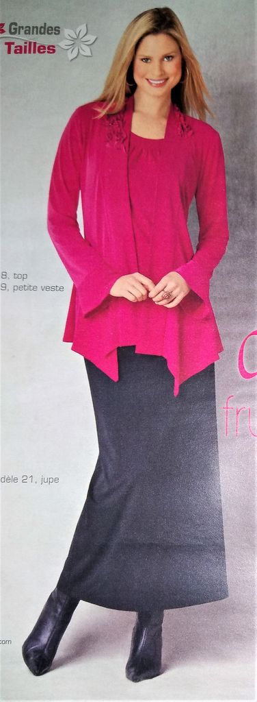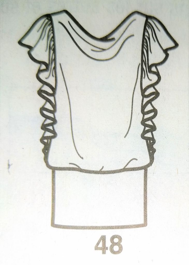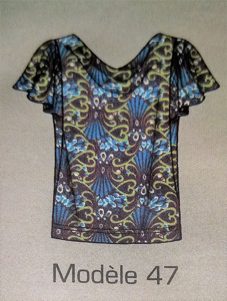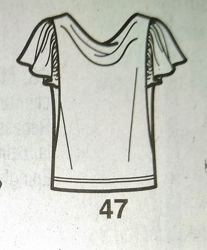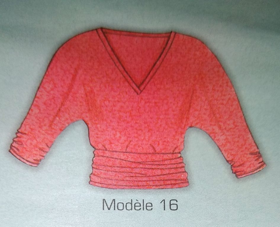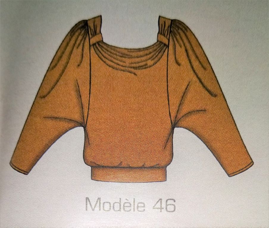 Encore un coup de cœur ou malheureusement pas de photos. Il s’agit d’un top sans manches avec un large volant façon manche papillon. L’encolure est de forme bénitier. Il est en taille 40/42 – 44/46 – 48/50.