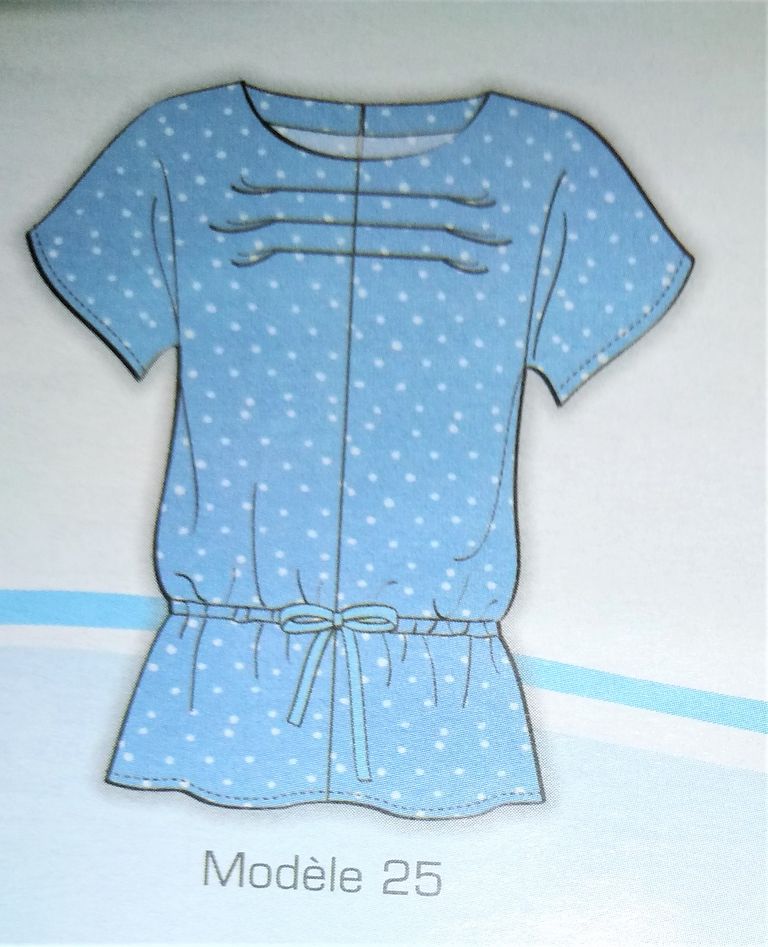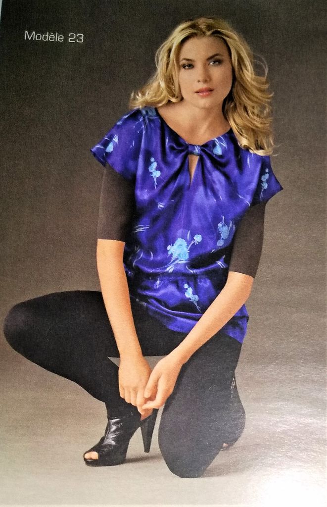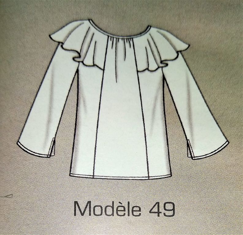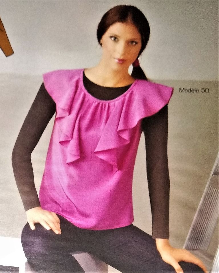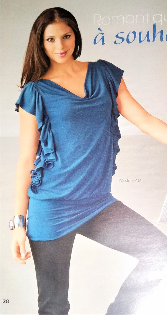 Mon dernier coup de cœur est pour une tunique qui part sur la même base que le précédent modèle. Les volants descendent bas en cascade et une large bande de jersey faisant office de mini-jupe vient faire blouser le top. Il est en tailles 40/42 – 44/46 – 48/50.