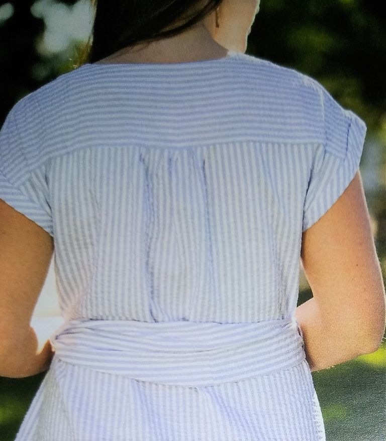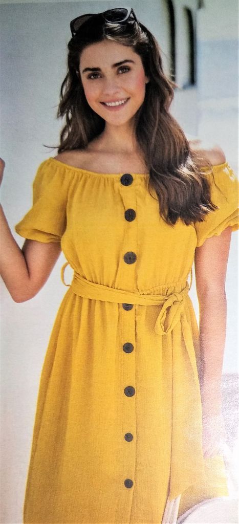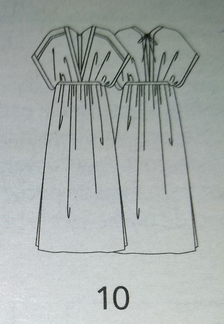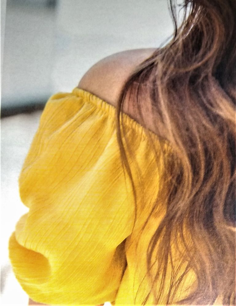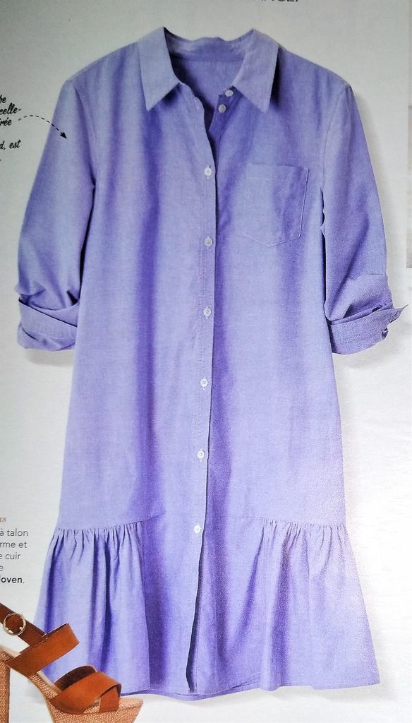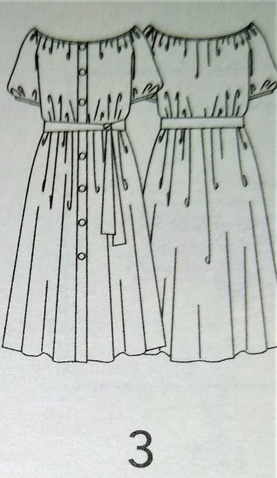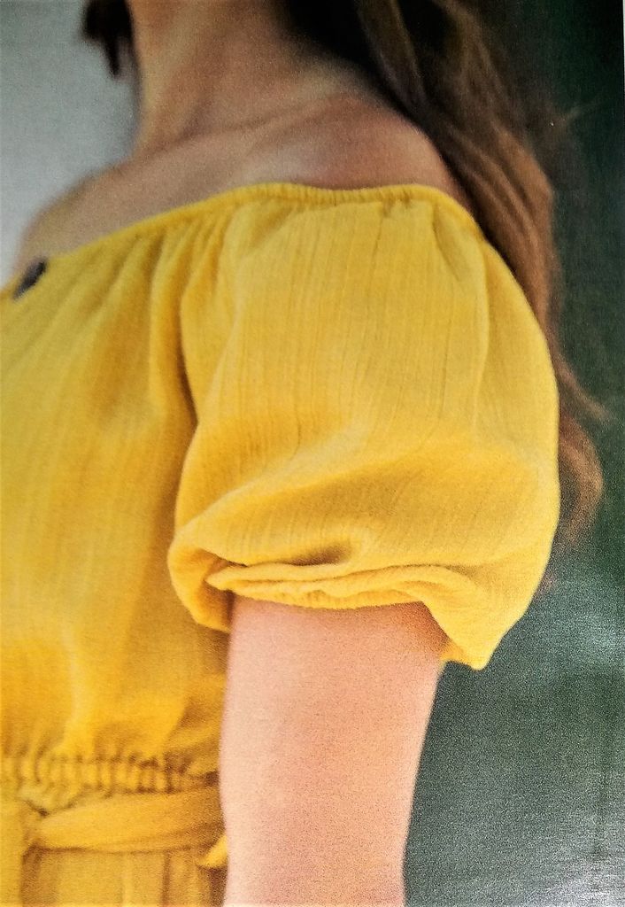 J’adore cette robe fluide, plus particulièrement son encolure ronde élastiquée façon Carmen. Elle permet de dévoiler plus ou moins les épaules. Les manches ballons sont courtes, resserrées par un élastique à l’ourlet,tout comme la taille elle aussi. Et oui c’est un trompe l’œil la robe ne se boutonne pas. Elle est en taille 38 – 42 – 46.