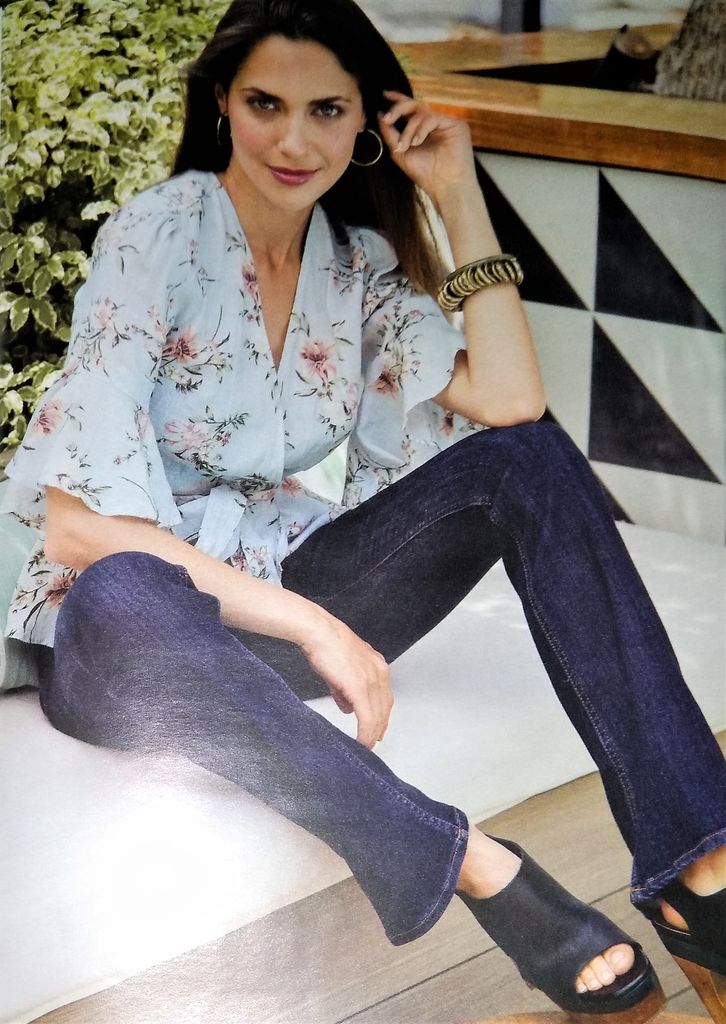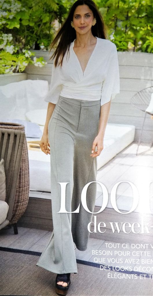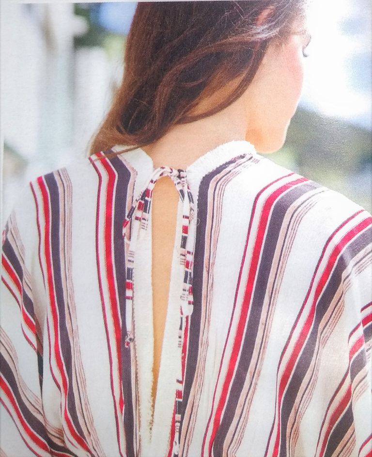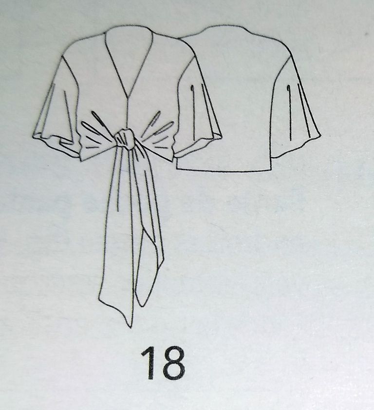 J’aime beaucoup ce chemisier! Son originalité? Des manches courtes et larges ainsi qu’à épaules basses. Le dos est court et s’arrête à hauteur de la taille. Les pans du devant sont longs pour pouvoir être noués et croisés sur le devant. Il est en taille 40 – 44 – 48.
