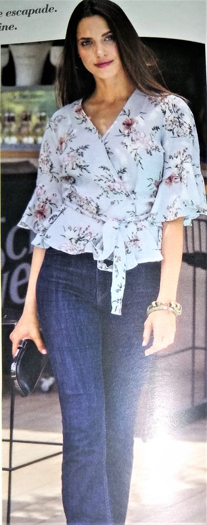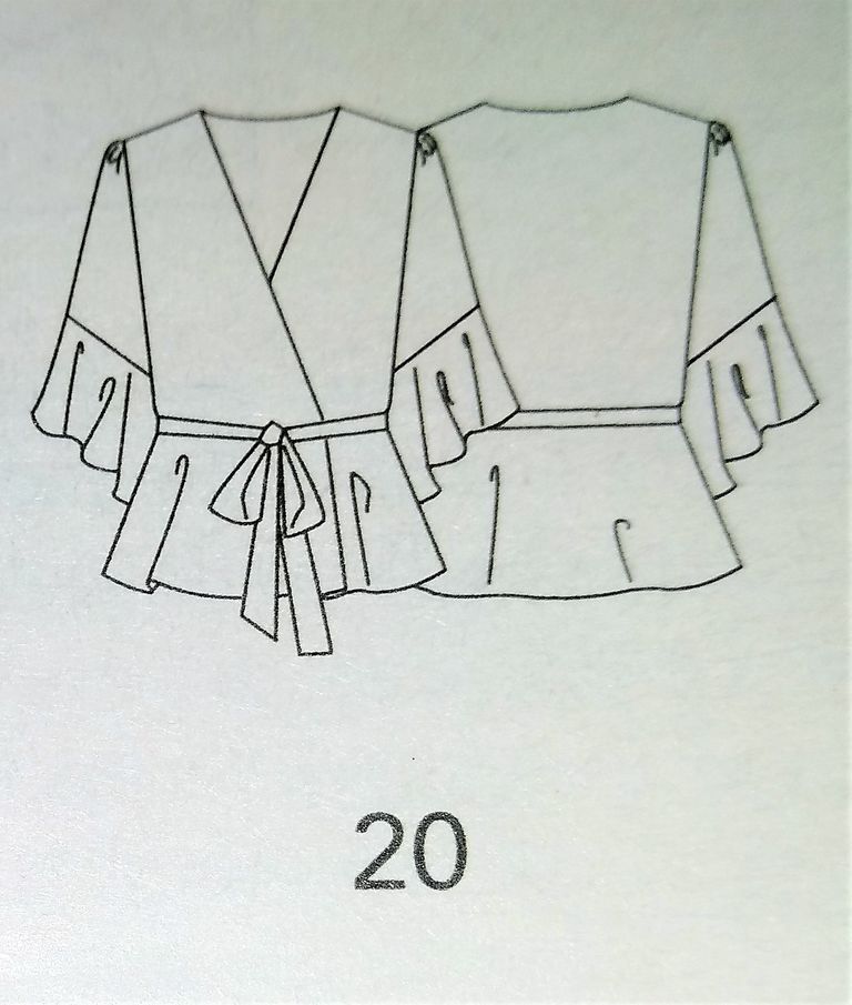 Vrai gros coup de cœur pour ce chemisier. Au passage le tissu est sublime. Il est de forme cache-cœur, et se ferme à l’aide d’une ceinture à nouer. Les manches courtes sont garnies d’un large volant. Un basque flottante vient finir d’harmoniser le modèle. Il est en taille 40 – 44 – 48.