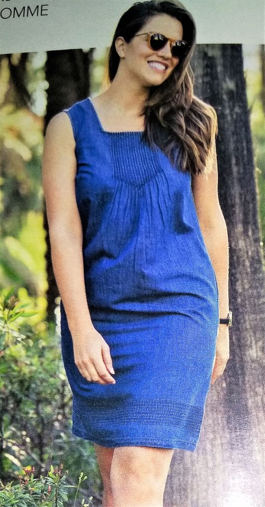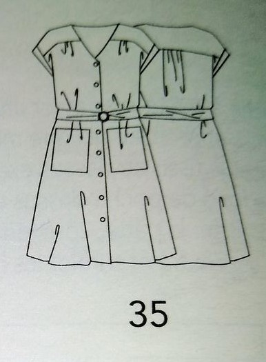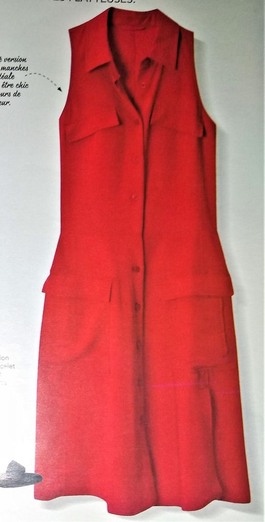 Je lui trouve un brin rétro à cette robe, elle me fait penser aux blouses de nos grand mères mais en plus raffinée. Elle comporte des empiècements aux épaules et dans le haut du dos. Le buste est froncé et boutonné. La jupe est évasée et ornée de deux poches plaquées. Une ceinture à la taille resserre l’ampleur de la robe. Elle est en taille 50 – 54 – 58.