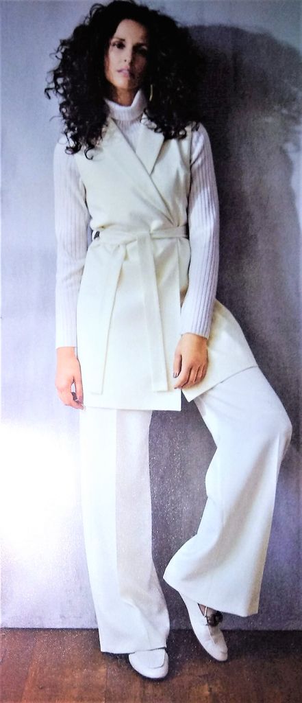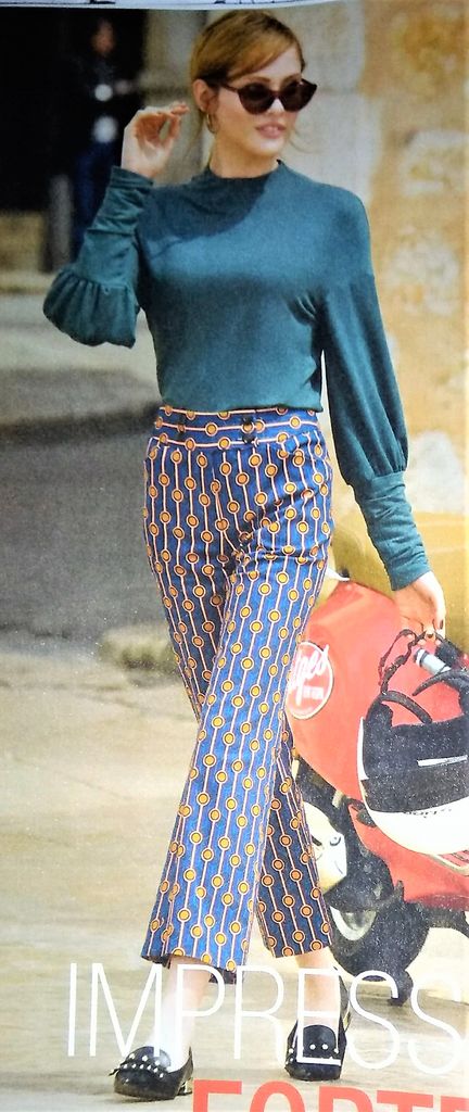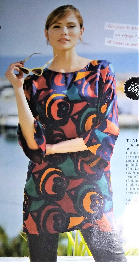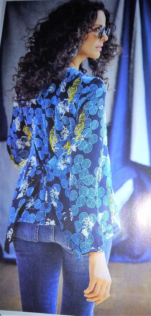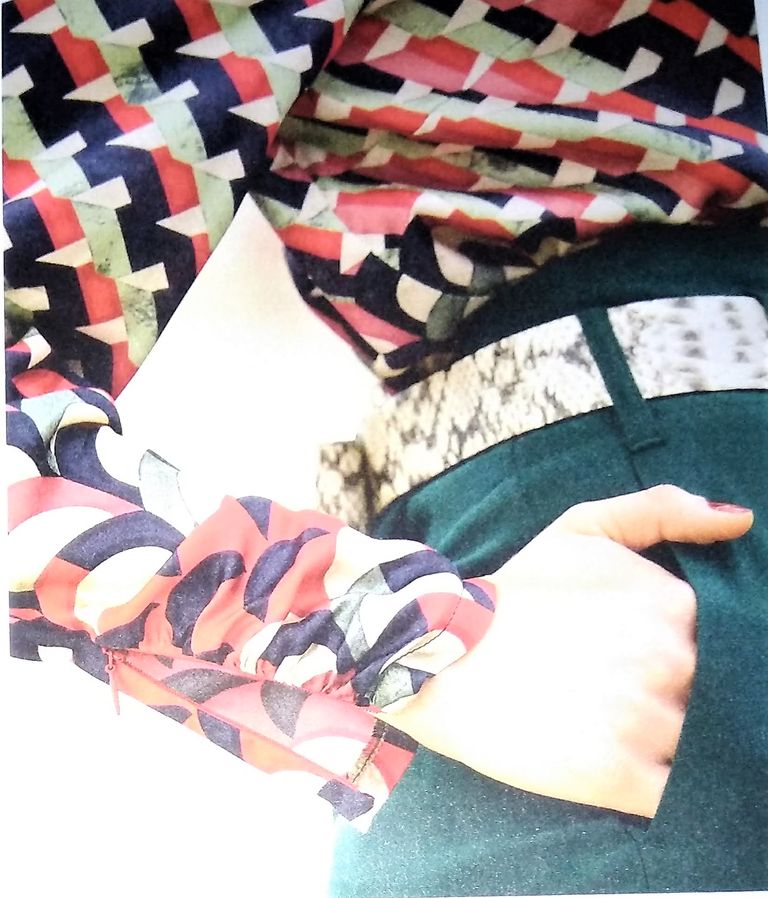 J’aime beaucoup le raffinement de cette superbe blouse. Le motif graphique va à ravir avec ce modèle. L’encolure est montante avec une fente pour une touche sexy. Les manches sont longues, drapées et terminées par une fermeture à glissière. Elle va de la taille 36 au 44.