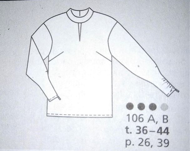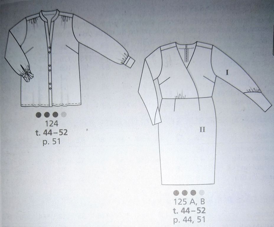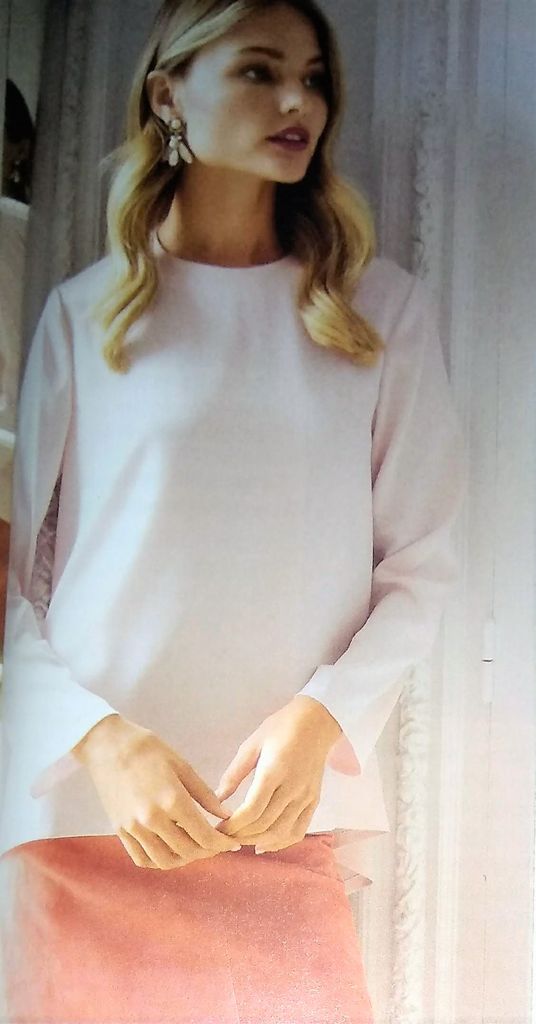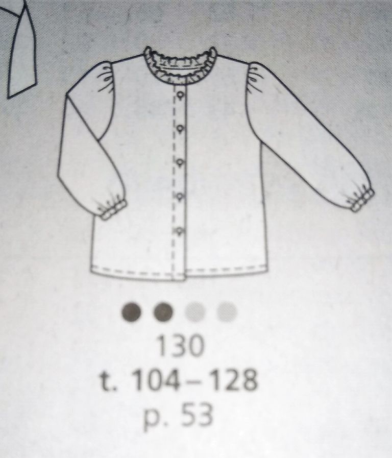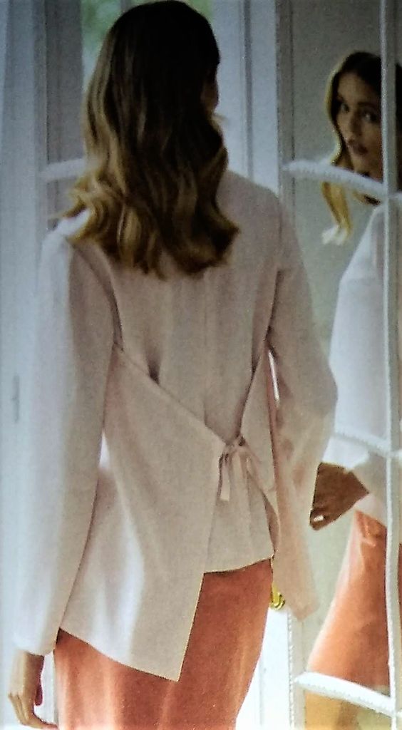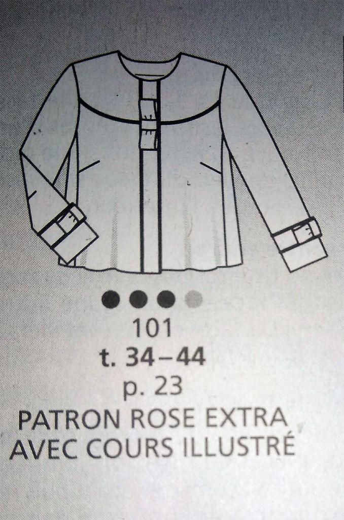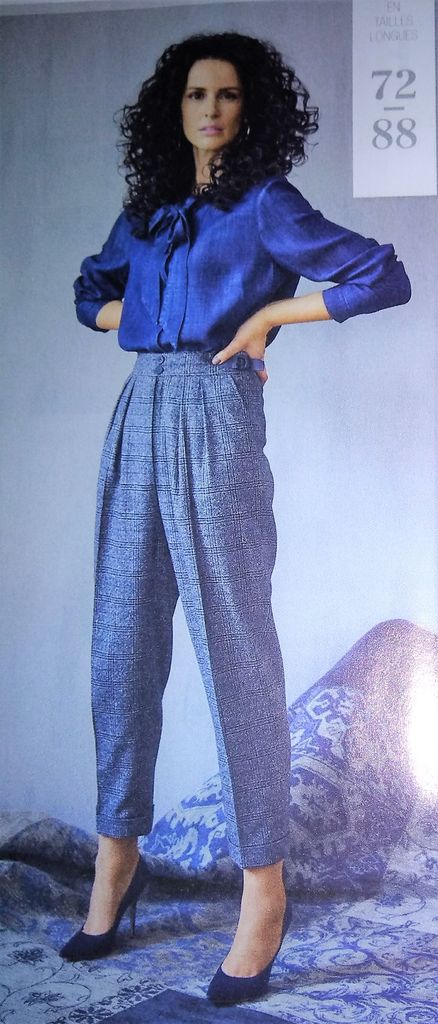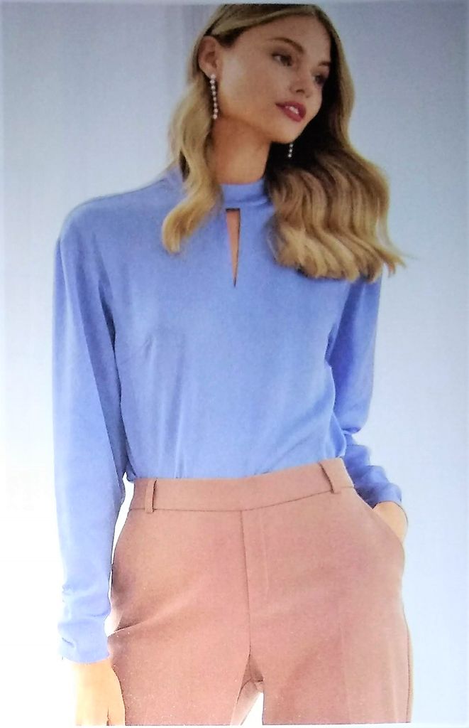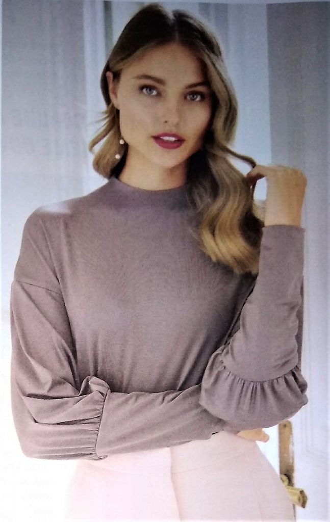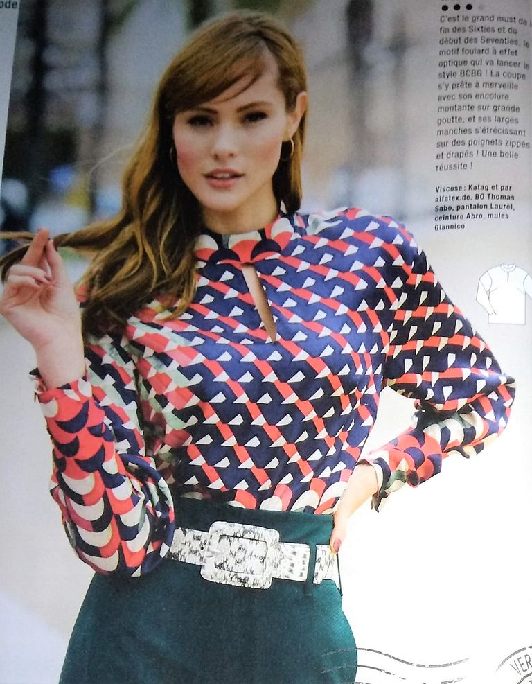 Encore une jolie blouse! Le buste est garni d’un col calice. Les emmanchures sont abaissées, sur des manches longues froncées et terminées par de longs poignets. Elle va de la taille 36 au 44.