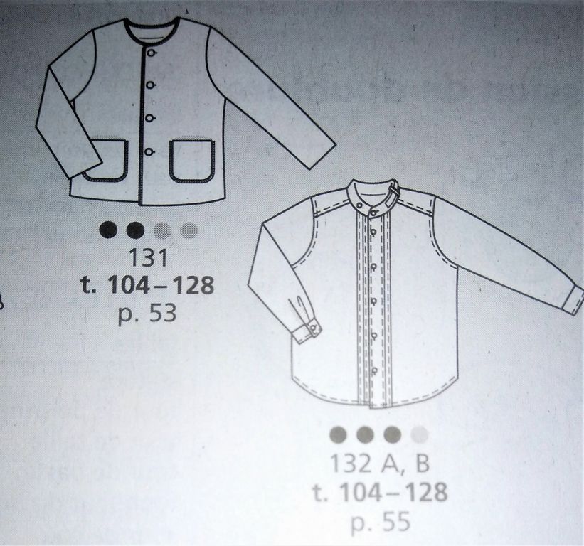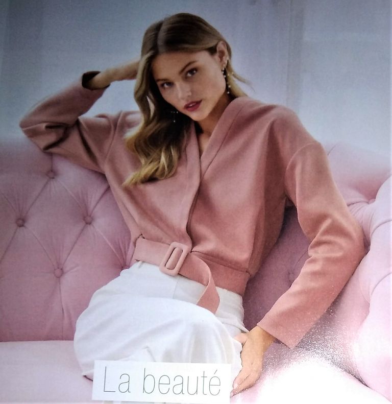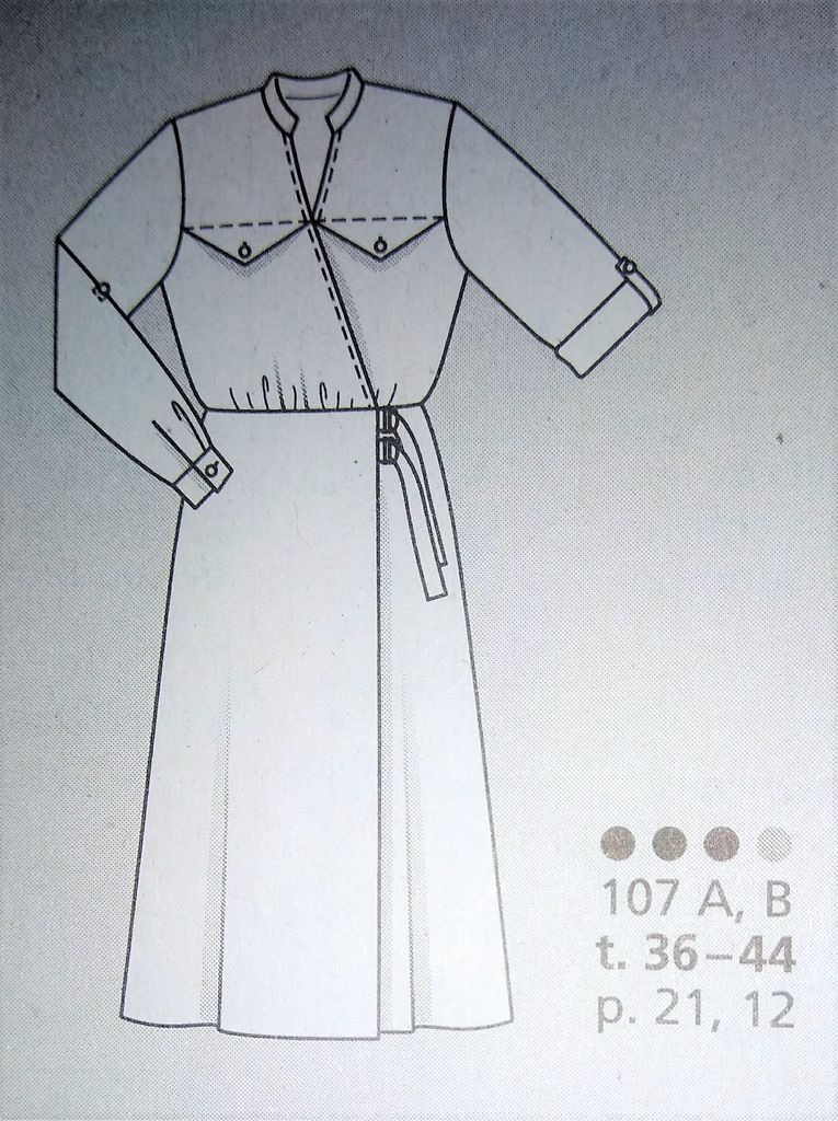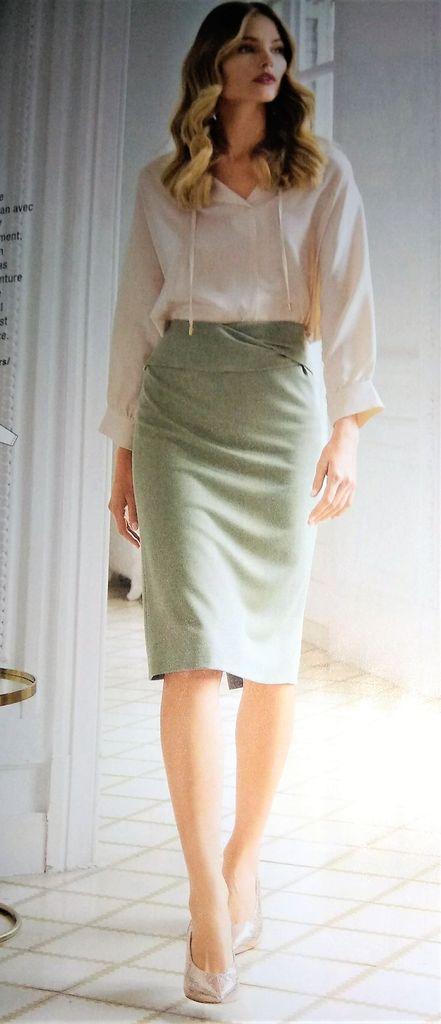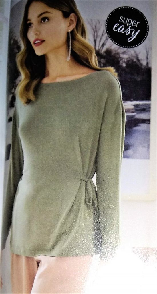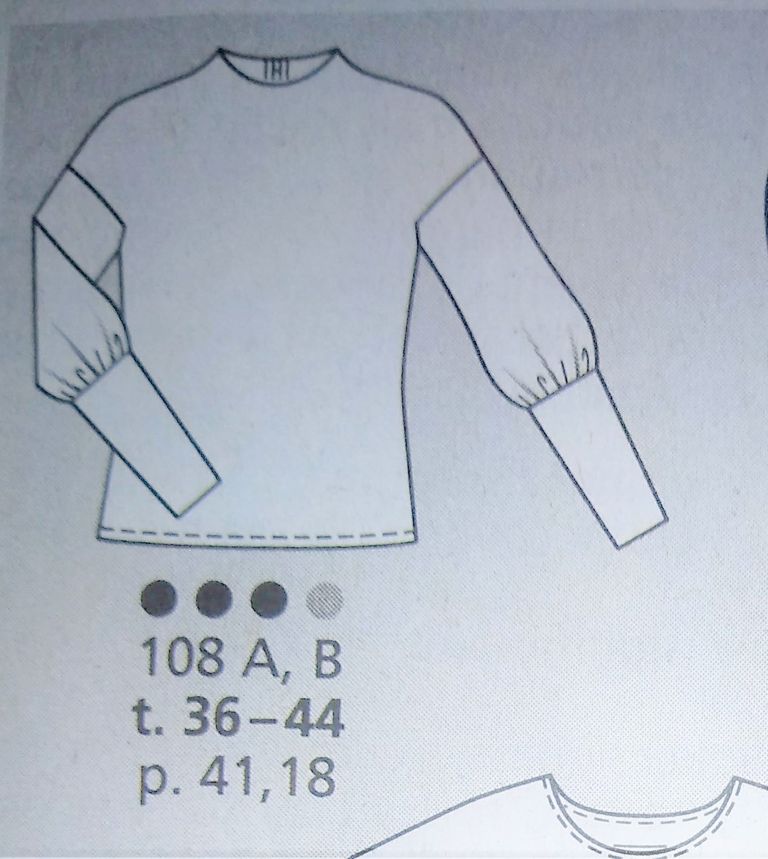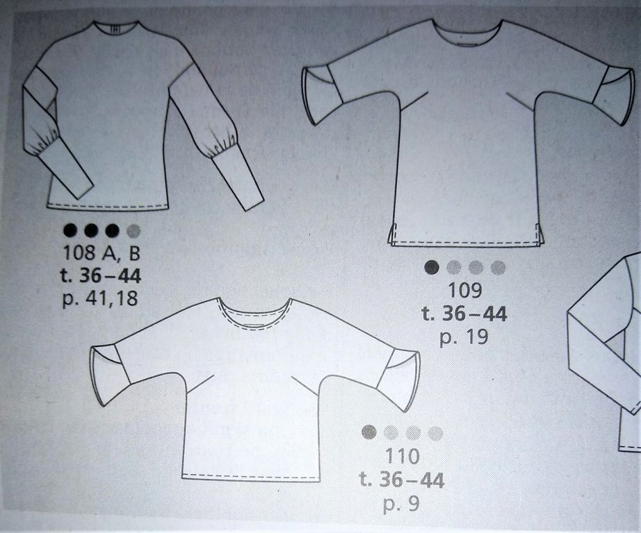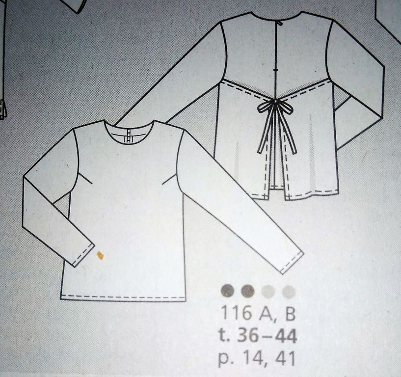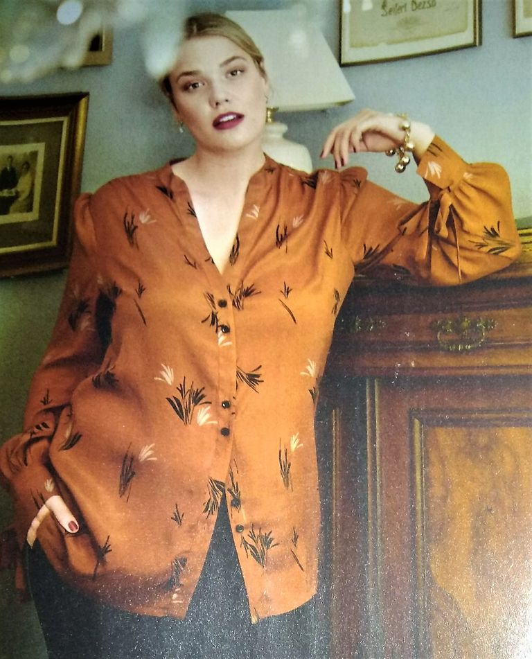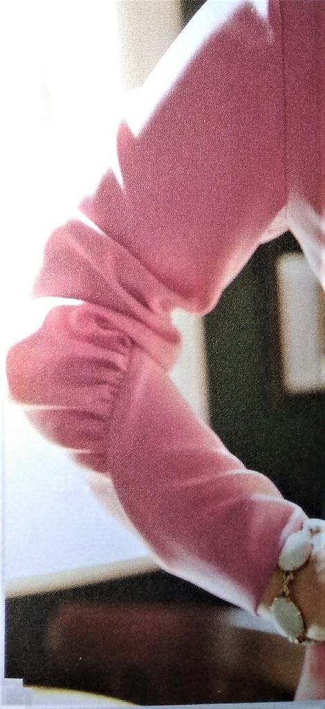 Encore une jolie blouse! Le buste est garni d’un col calice. Les emmanchures sont abaissées, sur des manches longues froncées et terminées par de longs poignets. Elle va de la taille 36 au 44.