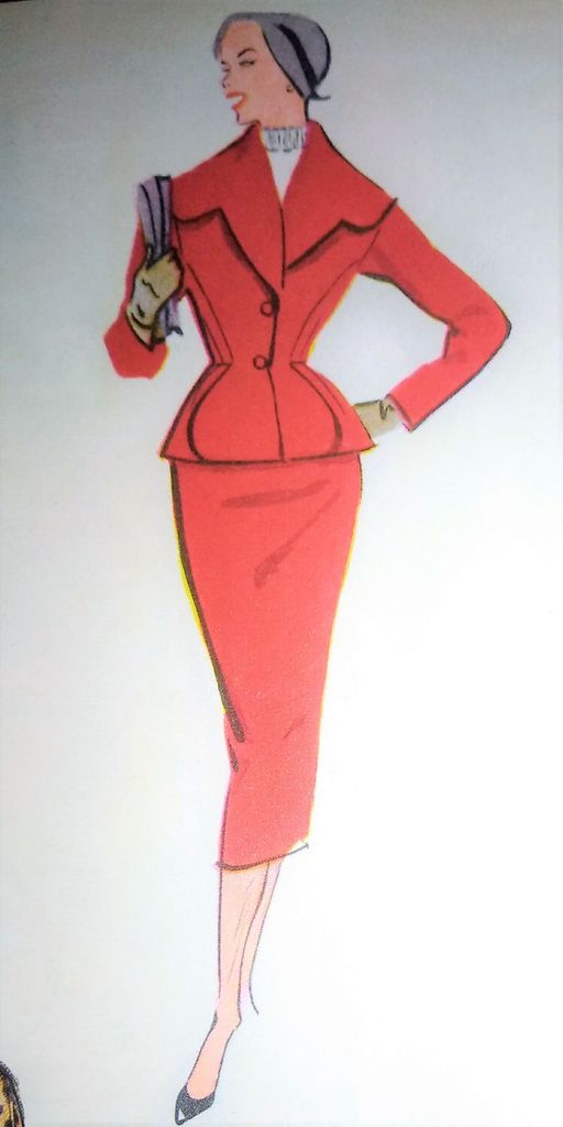 Que dire de ce superbe modèle rétro, ce tailleur digne de la haute couture. Le modèle originel est paru dans un Burda Automne/ Hiver 1955-1956. La veste épouse la silhouette, à l’aide de la basque et des découpes galbantes. Elle va de la taille 36 au 44. Le point de mire de cette pièce sont les poches arrondies. La jupe est de forme crayon, et va elle aussi du 36 au 44.