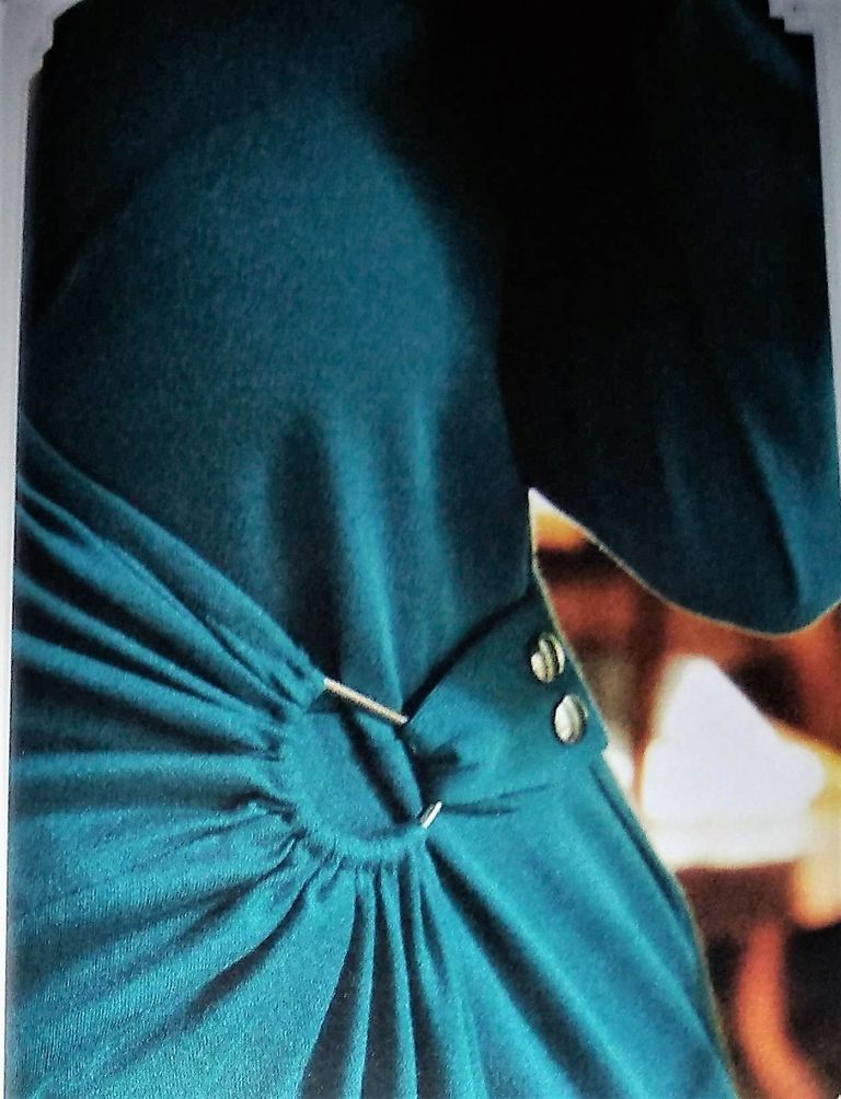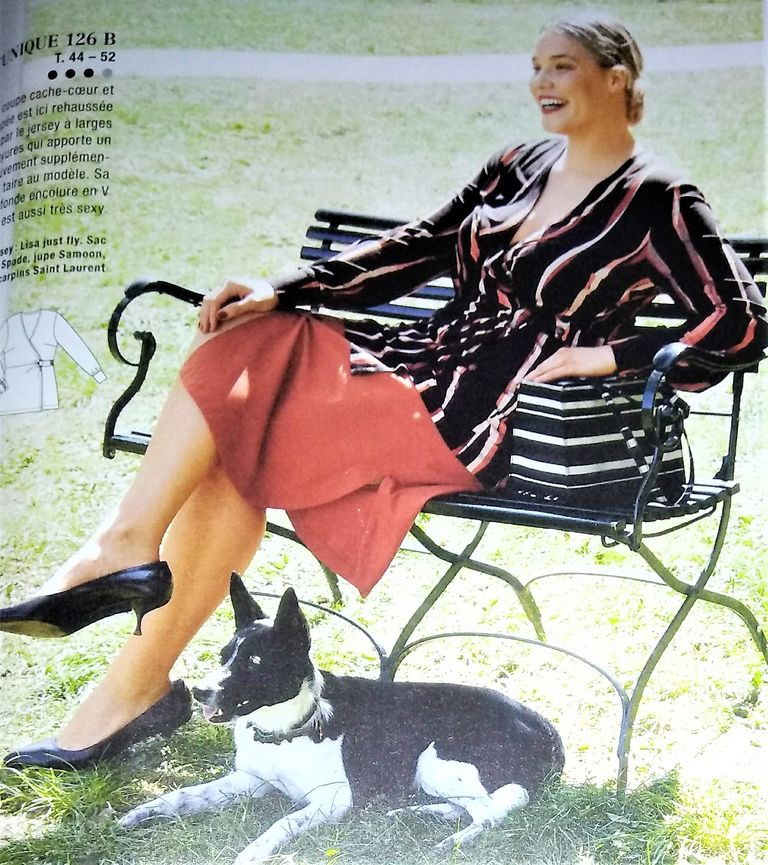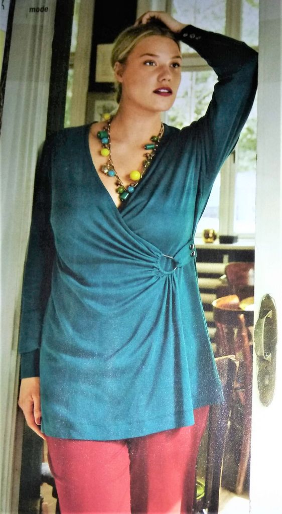 J’adore cette tunique, bon en plus c’est une grande taille aussi, ça aide. Elle est de forme cache-cœur, avec un mouvement drapé sous la poitrine. La tunique se ferme à l’aide d’une boucle retenue par une patte prise dans la couture de côté. Les manches sont longues et fermées par des poignets boutonnés. Elle va de la taille 44 au 52.