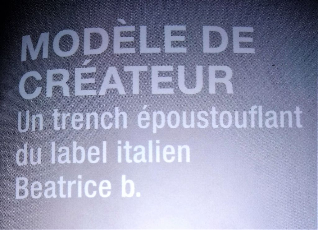 Je reconnais que le modèle de créateur sort de l’ordinaire, il s’agit de Beatrice B. qui nous propose un trench original.