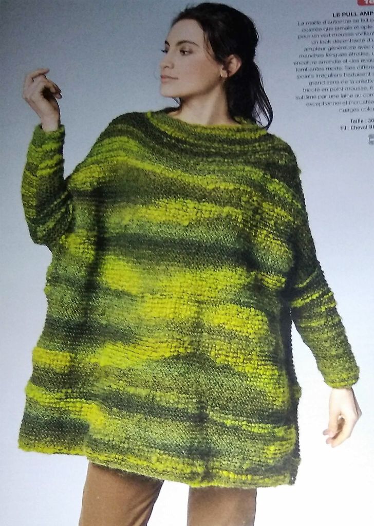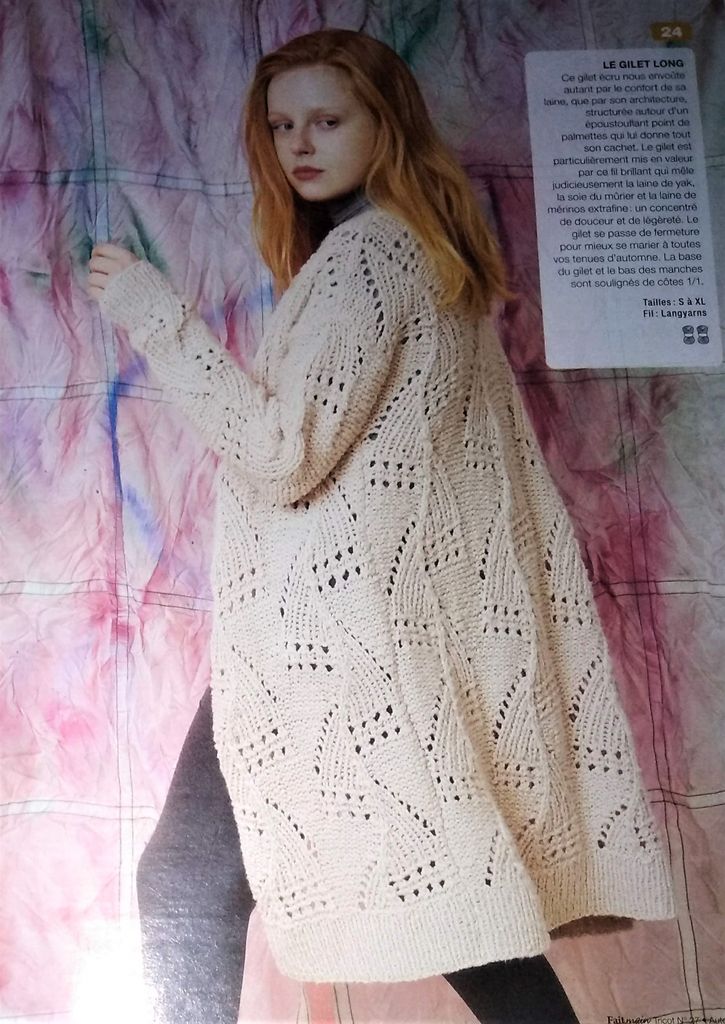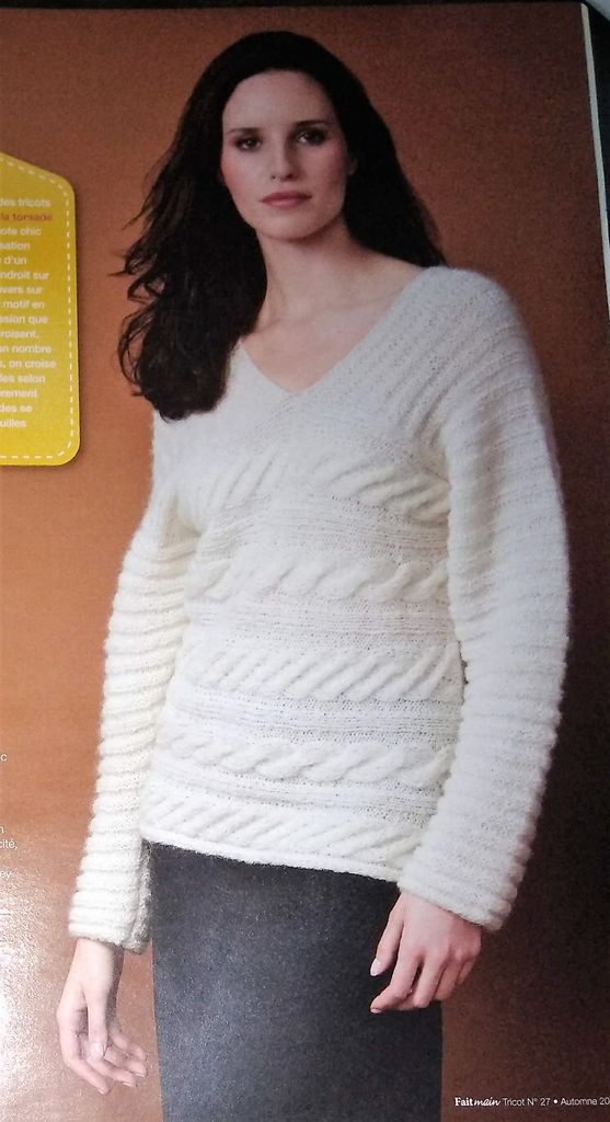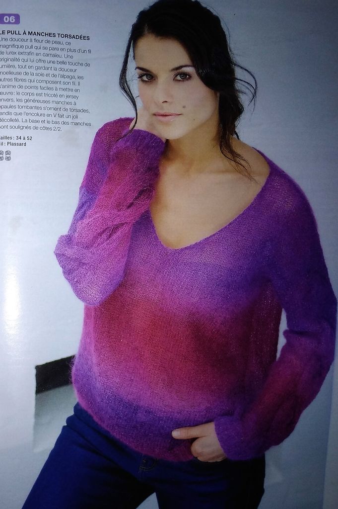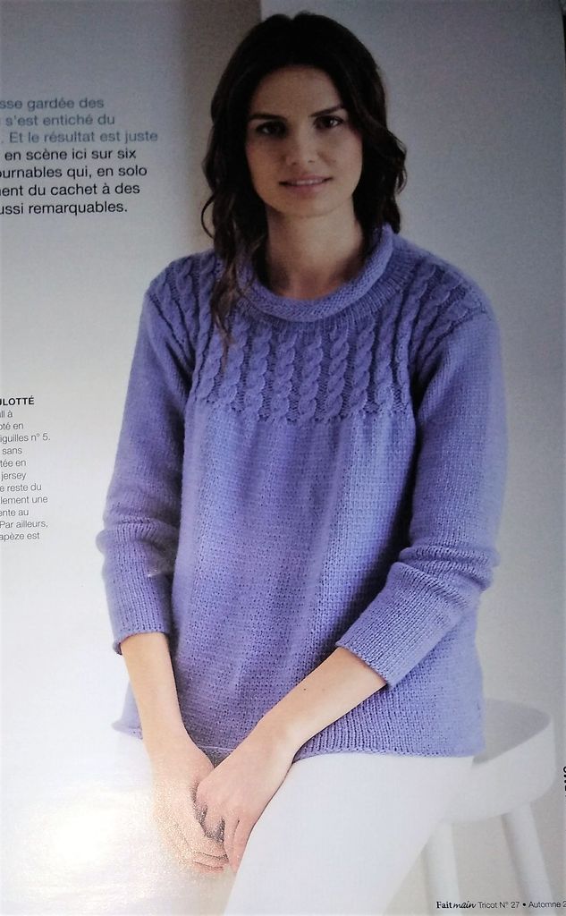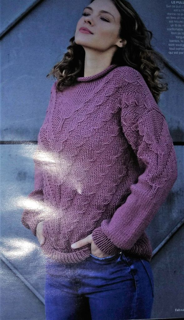 Ce pull fait preuve d’une élégance folle, légèrement transparent, les point de mires sont les torsades souples des manches. D’autant plus mis en valeur que tout le cors est tricoté en jersey. Le choix du fil convient parfaitement à ce modèle, et il va du 34 au 52.