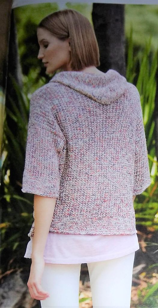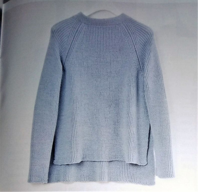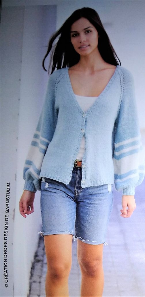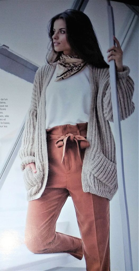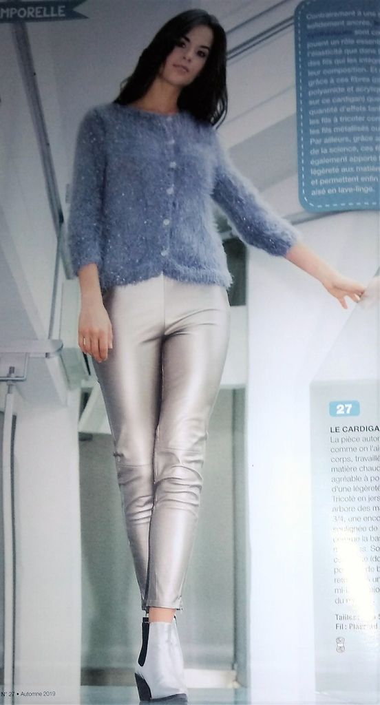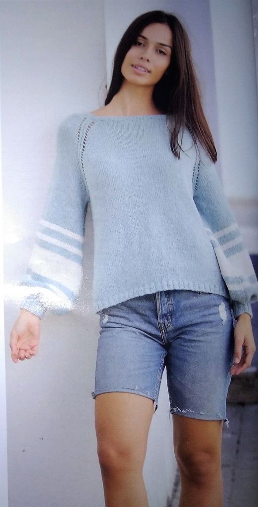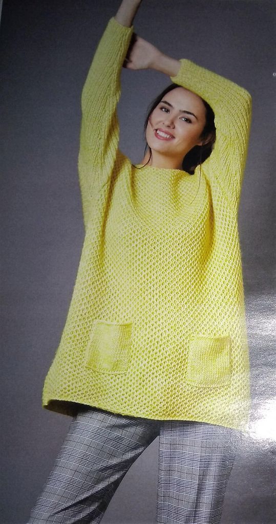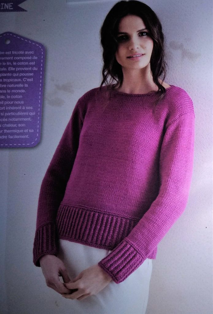 Ce pull fait preuve d’une élégance folle, légèrement transparent, les point de mires sont les torsades souples des manches. D’autant plus mis en valeur que tout le cors est tricoté en jersey. Le choix du fil convient parfaitement à ce modèle, et il va du 34 au 52.