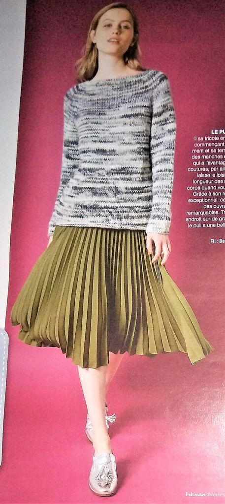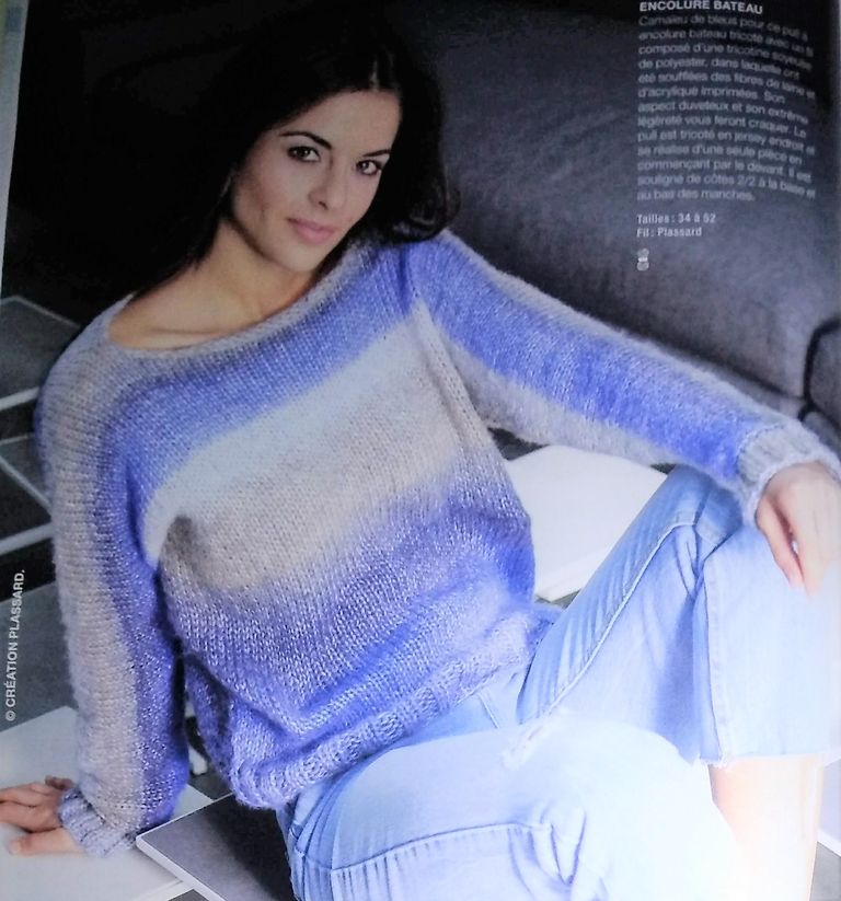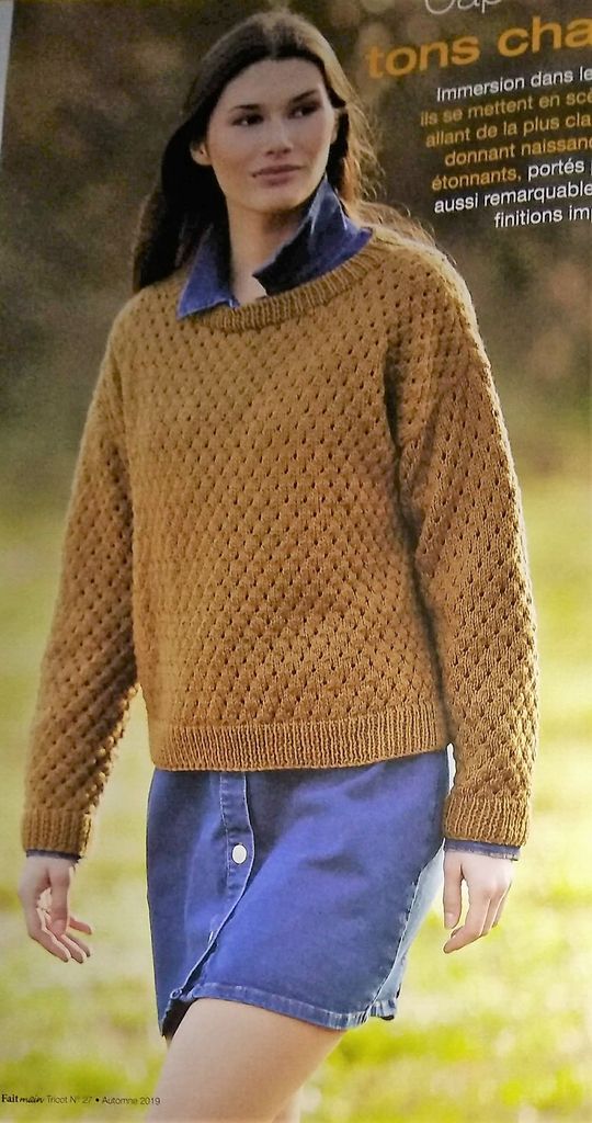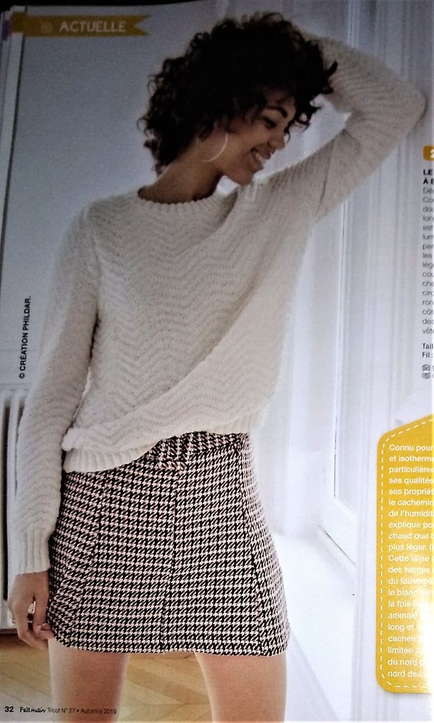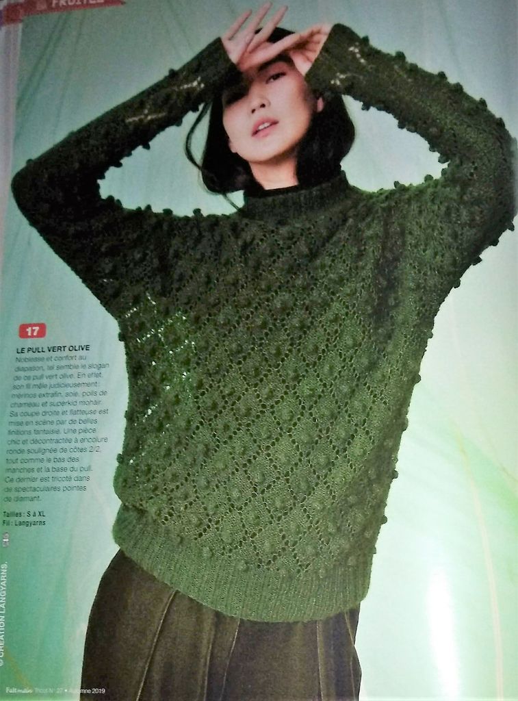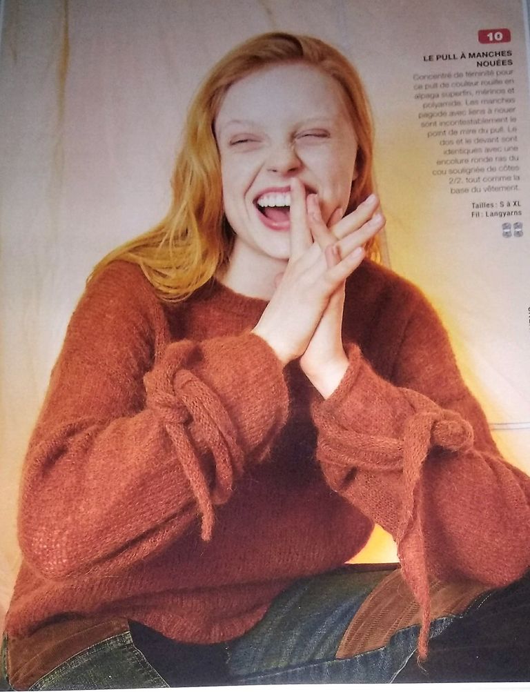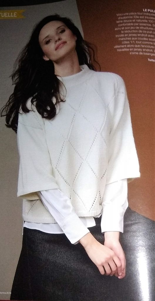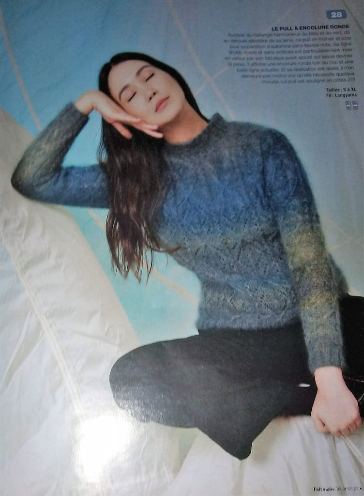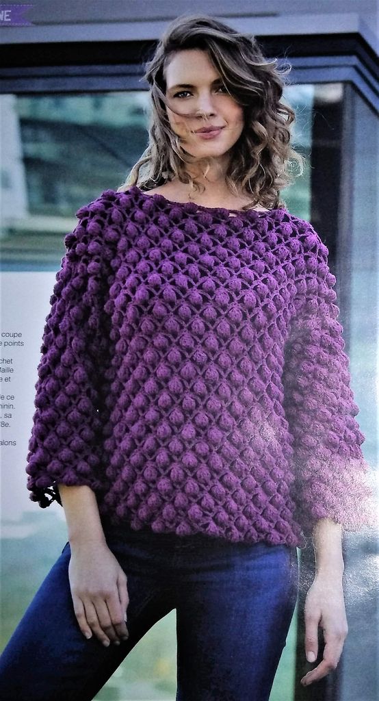 Il y a un pull au crochet, en plus il s’agit d’une pièce originale. Il me semble que c’est le point de nope, la rédaction l’appelle le point boule. Il donne tout son charme à ce pull, avec une encolure bateau et des manches 7/8eme. Il va de la taille 38 au 52.