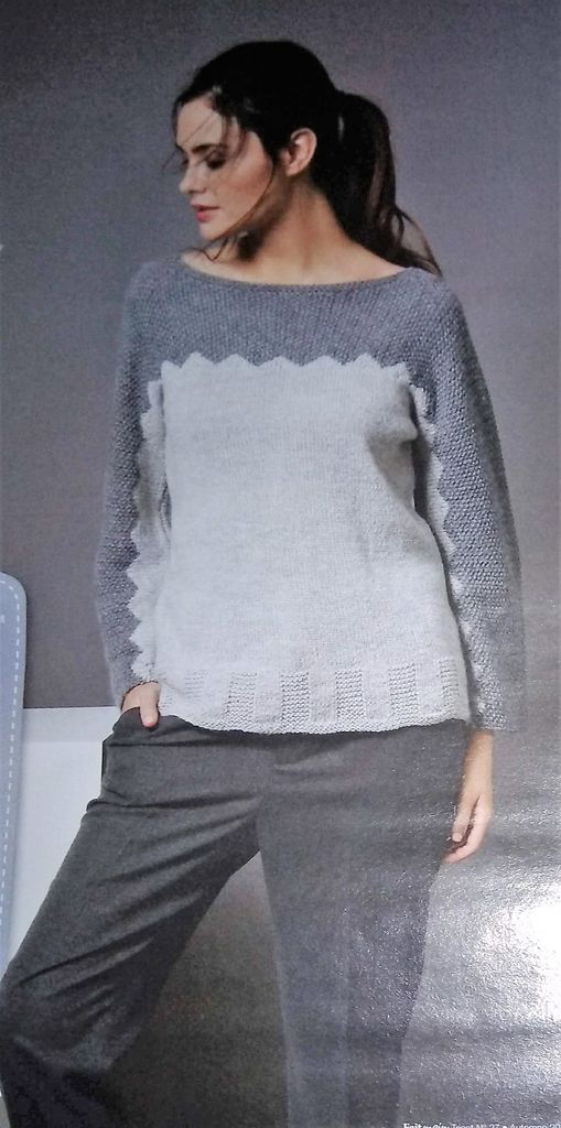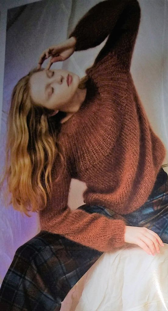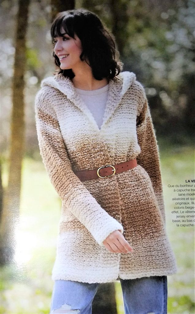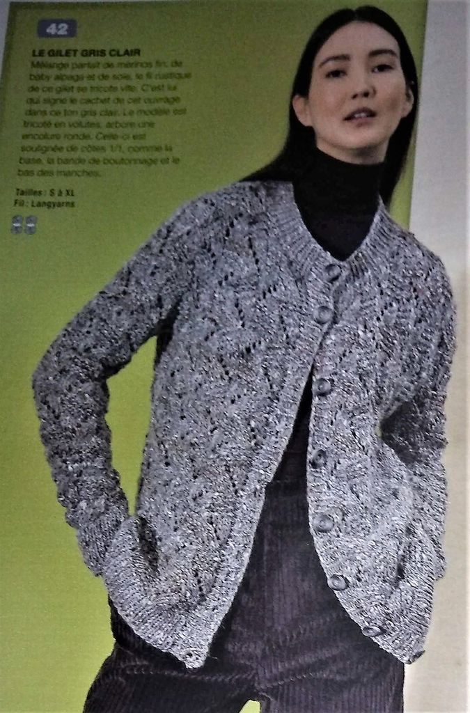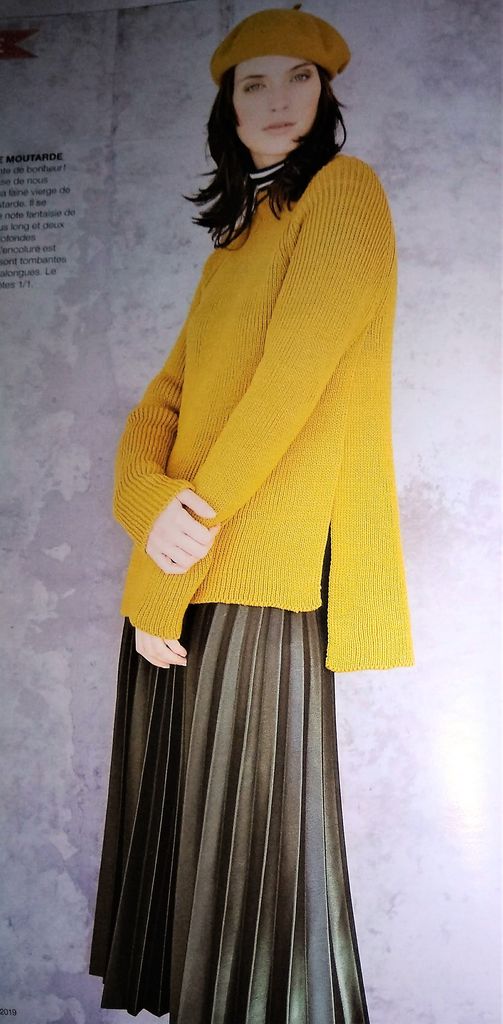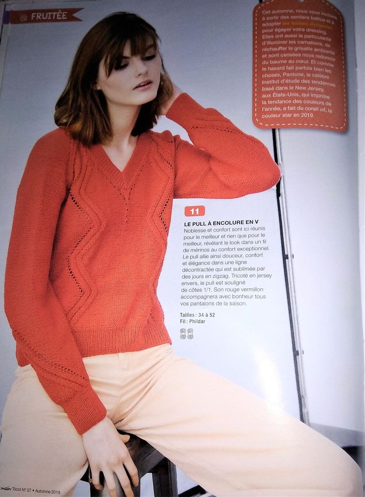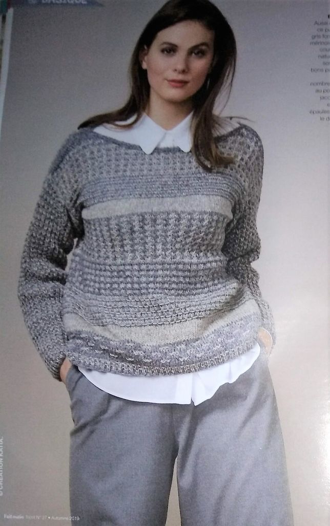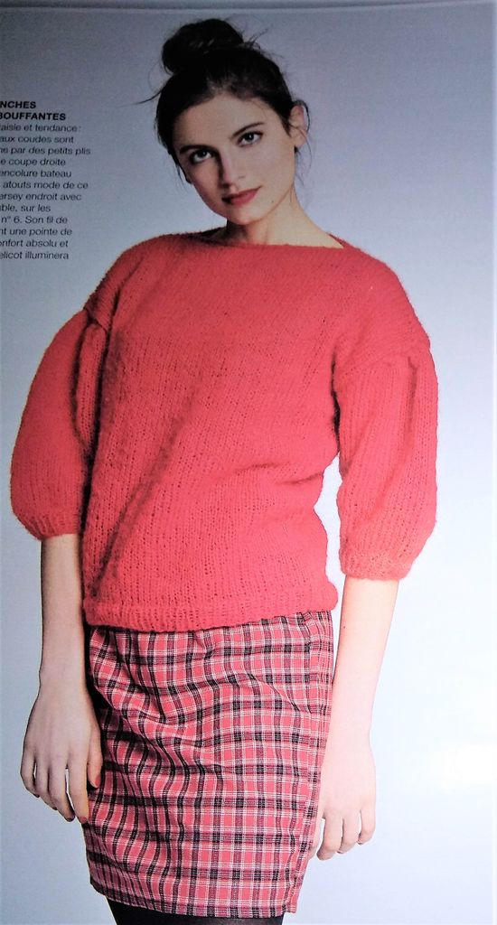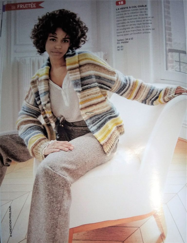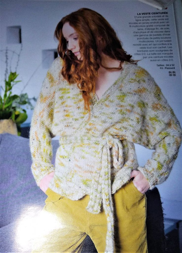 Il y a un pull au crochet, en plus il s’agit d’une pièce originale. Il me semble que c’est le point de nope, la rédaction l’appelle le point boule. Il donne tout son charme à ce pull, avec une encolure bateau et des manches 7/8eme. Il va de la taille 38 au 52.