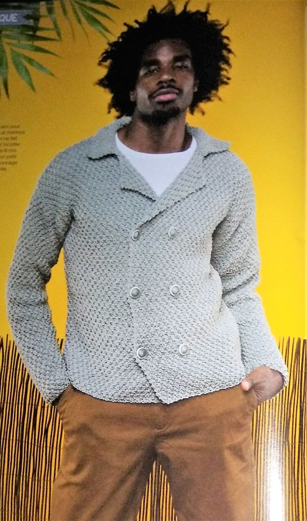 J’ai souvenir de ma maman de cœur et de son cliquetis d’aiguilles à tricoter. Réaliser un tricot pour un homme n’est jamais chose facile, enfant je me rappelle qu’elle avait relevé le défi avec succès… Ici nous avons une superbe veste pour homme, elle est tricotée au point de blé avec le fil en double. J’ai même cru au départ que c’etait du crochet. Les manches sont bien entendu longues, elle possède un double boutonnage sur le devant ainsi qu’un col de veste. Elle va du S au XXL.