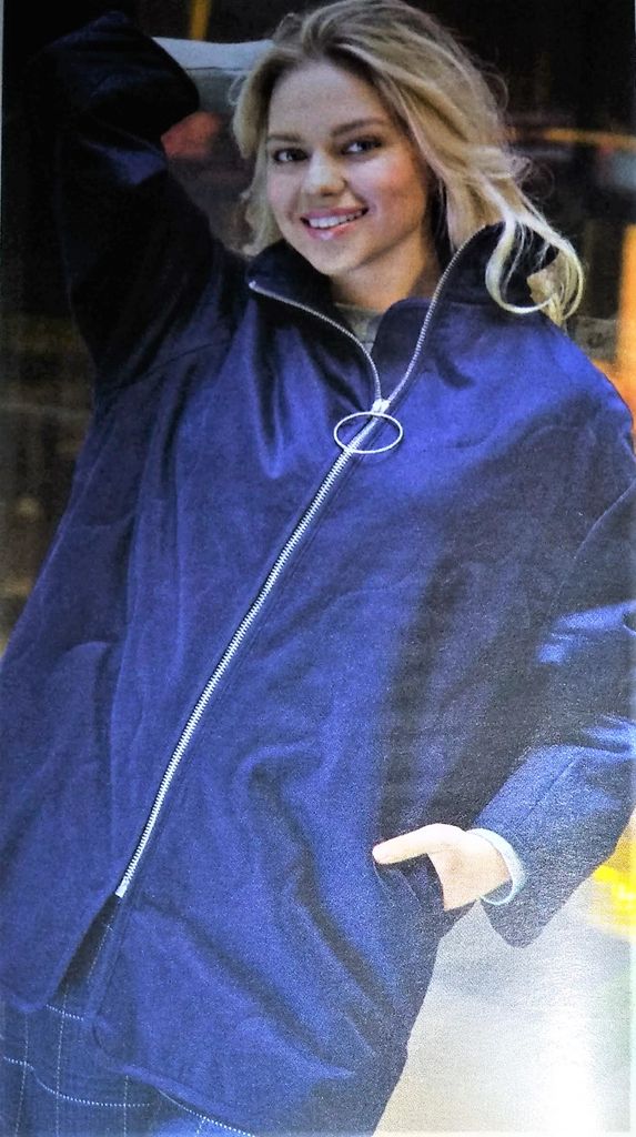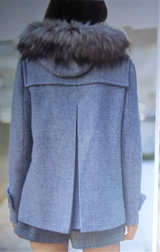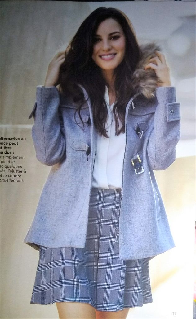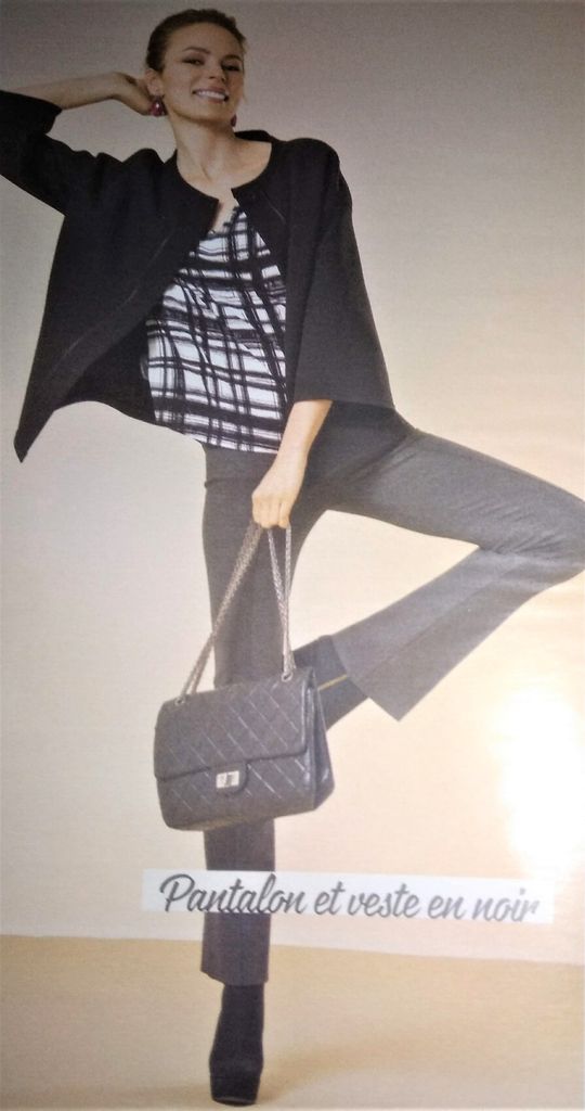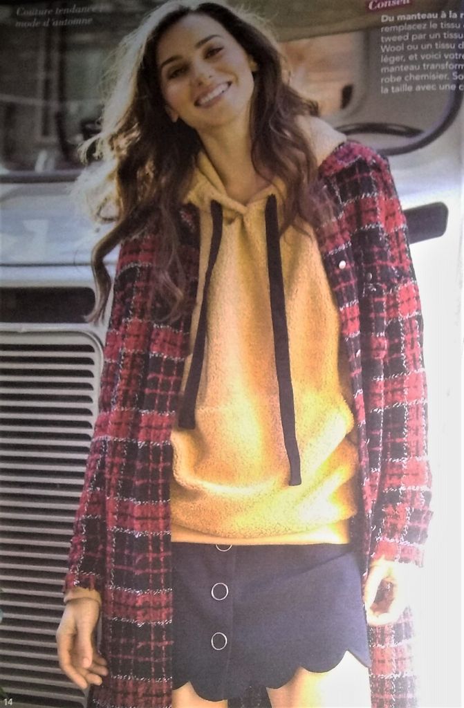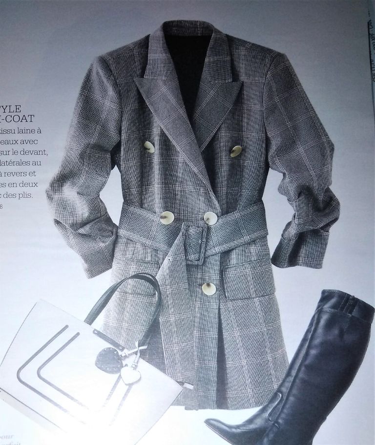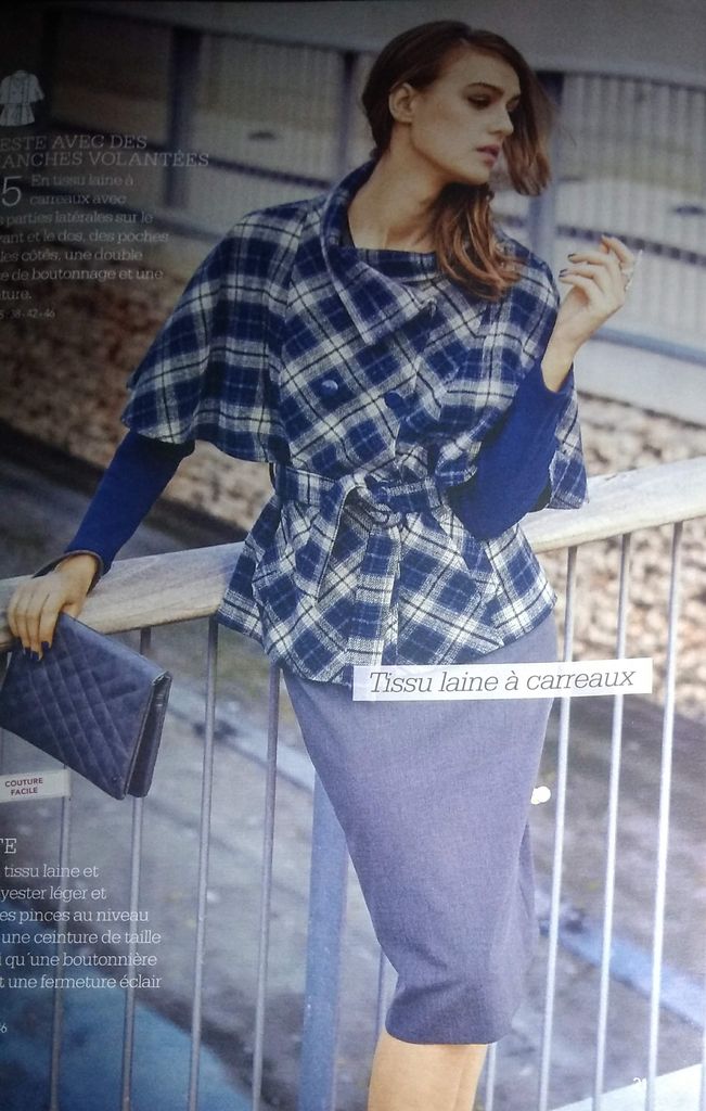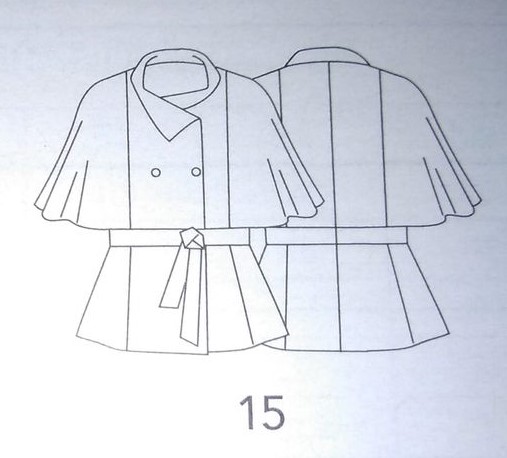 Il est rare que j’ai un coup de cœur pour un vêtement qui ressemble de prés ou de loin à une cape. Mais la, je suis amoureuse de cette veste avec ses manches volantées. Elles donnent l’illusion d’une cape justement. Le devant comporte une double patte de boutonnage, un col montant et une ceinture. Elle est en tailles 38 – 42 – 46.