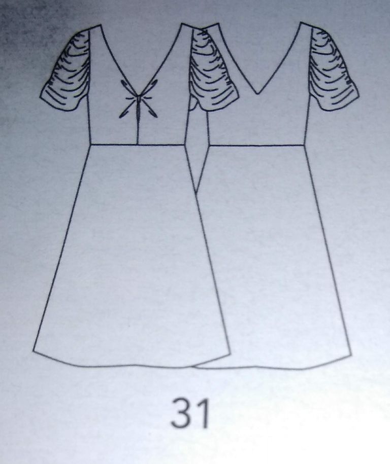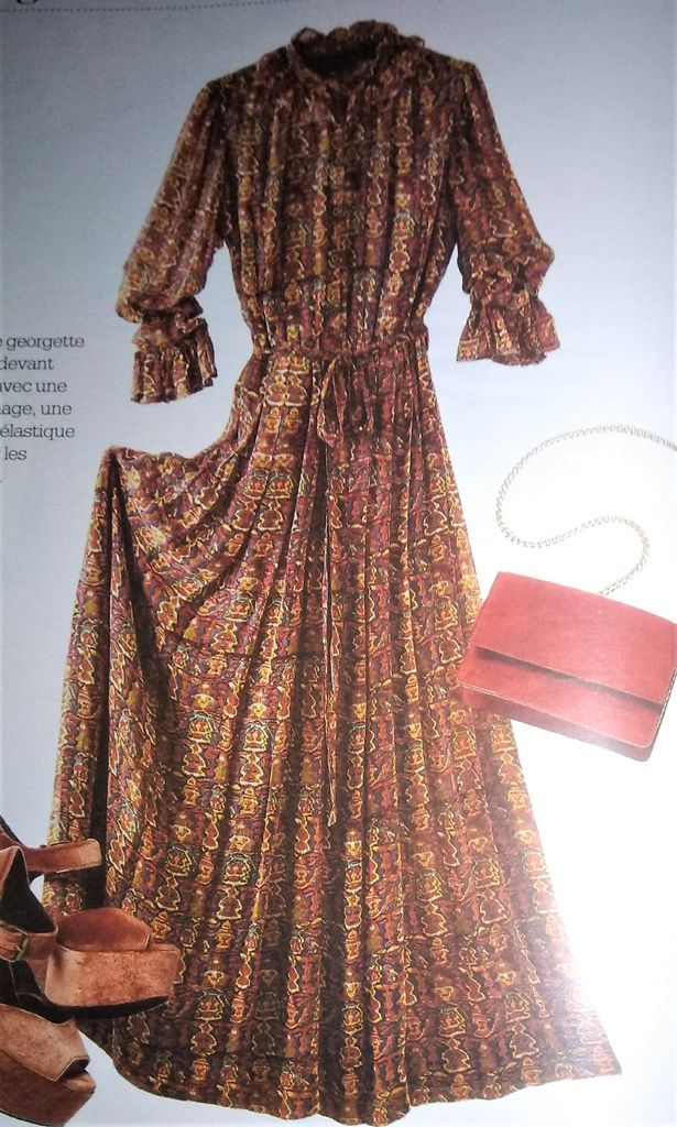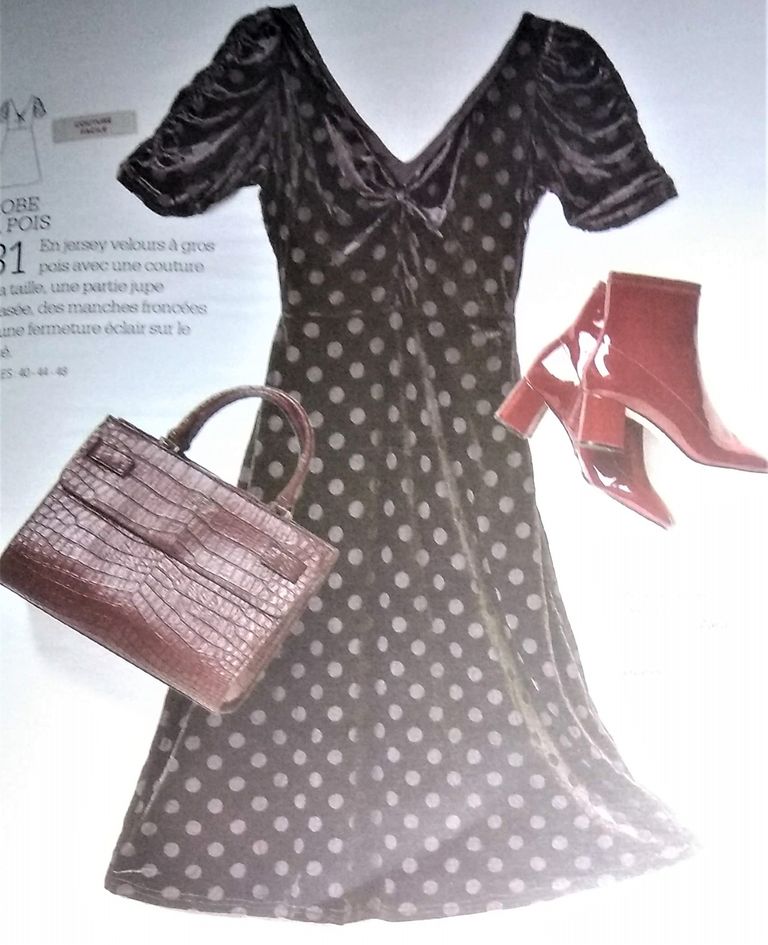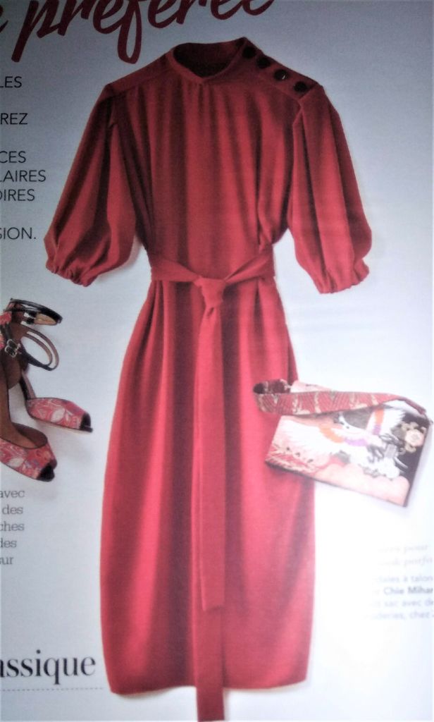 Mon premier coup de cœur est pour une robe, surprenant n’est ce pas! Alors, je lui trouve un petit air années 40 malgré qu’elle soit en jersey velours. Elle est estampillée couture facile. Les manches courtes sont froncées sur leur longueur. L’encolure devant est en V profond et elle aussi plissée en son centre. La jupe est évasée. Elle est en taille 40 – 44 – 48.
