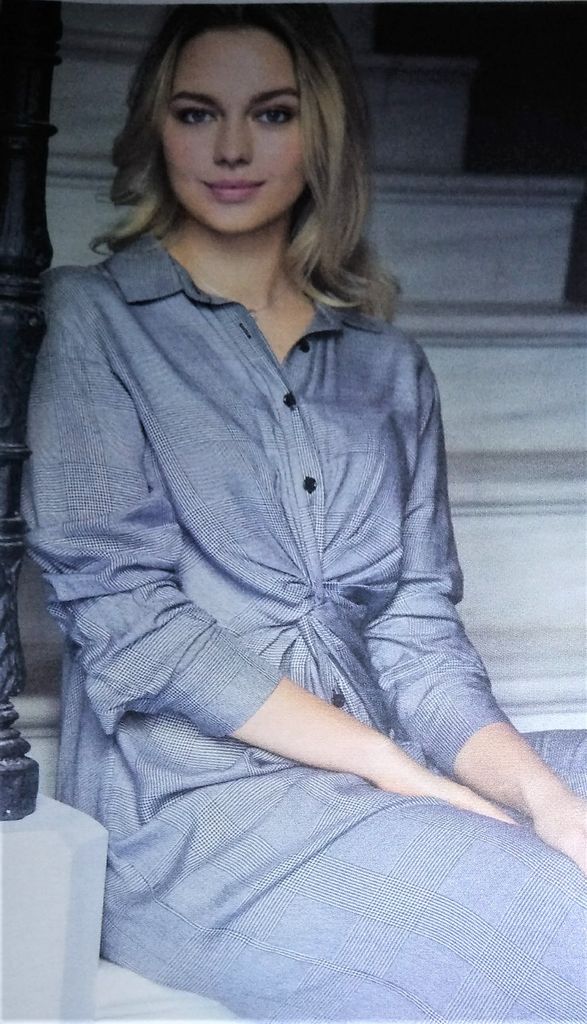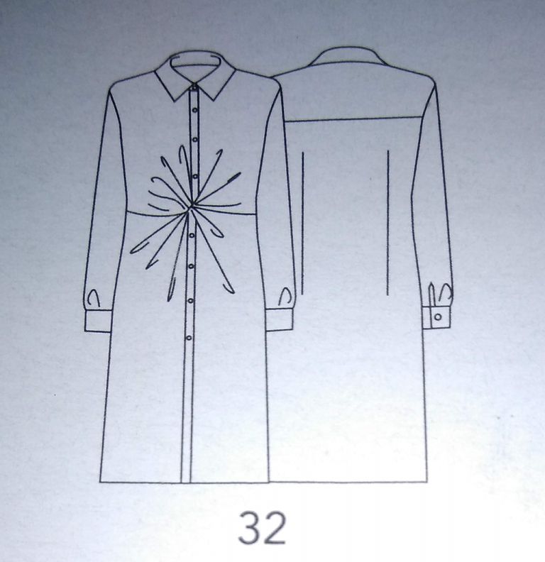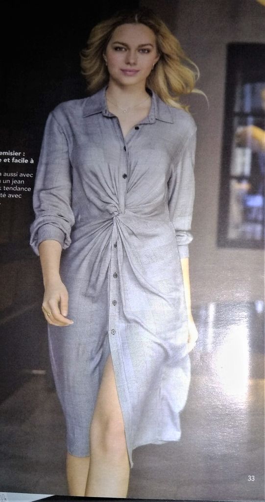 J’adore cette robe chemisier revisitée. Elle est croisée nouée sur le devant. Cela lui ajoute une belle touche d’originalité. Les manches sont longues et ornées d’une patte capucin sur le poignet. Elle est en tailles 50 – 54 – 58.