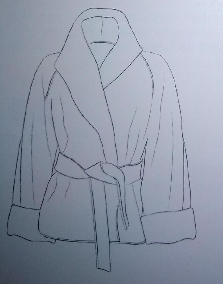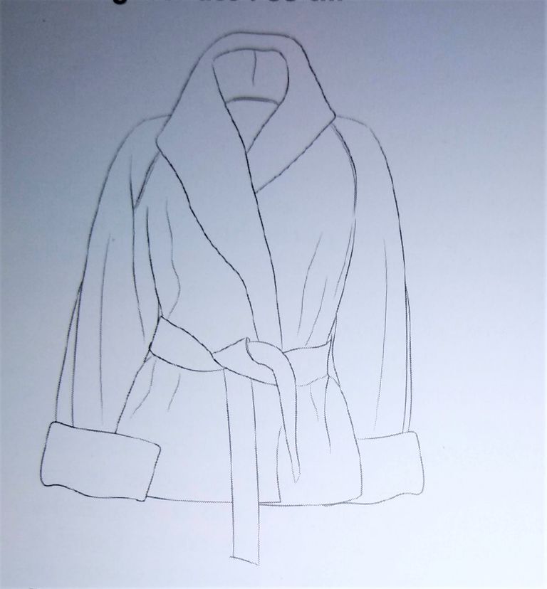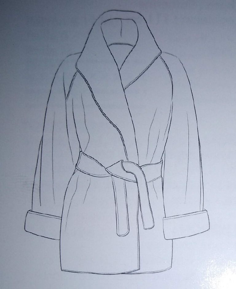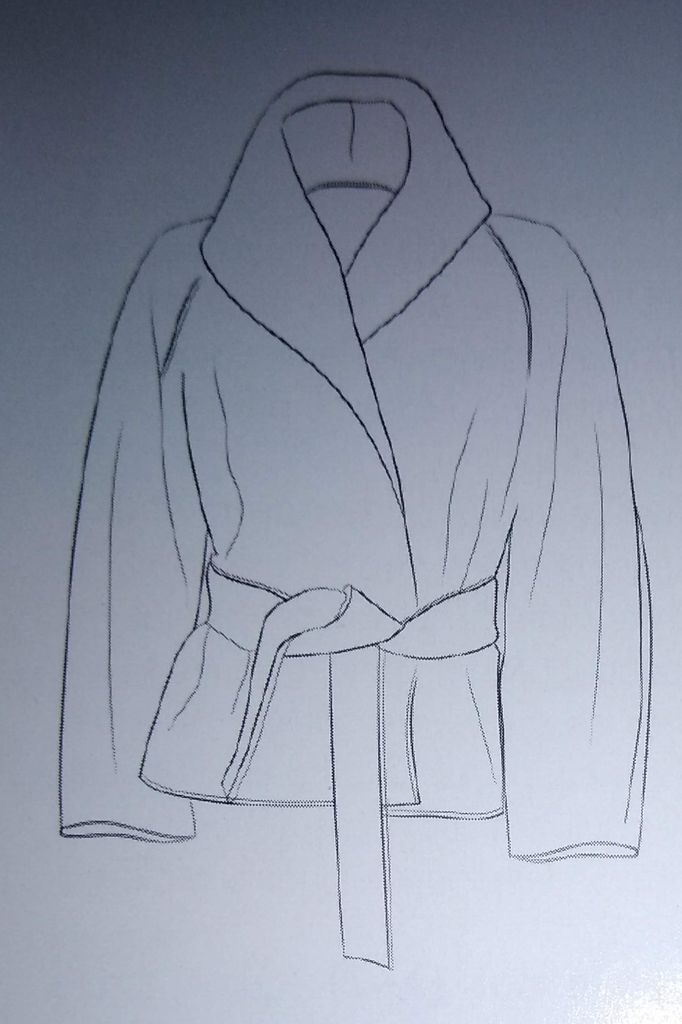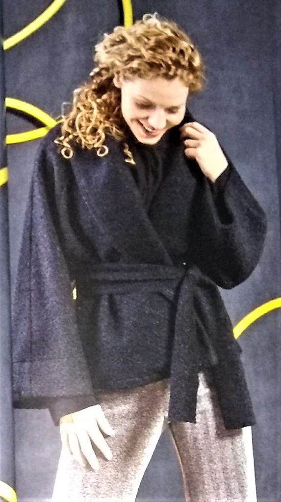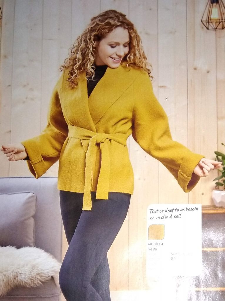 Mon dernier coup de cœur est pour cette veste que j’adore. Elle est réalisée en laine bouillie coupée à cru donc sans ourlets et non doublée. Pour une fois que je trouve une veste à nouer qui ne fasse pas robe de chambre je suis ravie. Elle se croise sur le devant et possède un grand col châle. Les bas de manches raglans sont retournés façon revers. Elle va de la taille S au XXL.