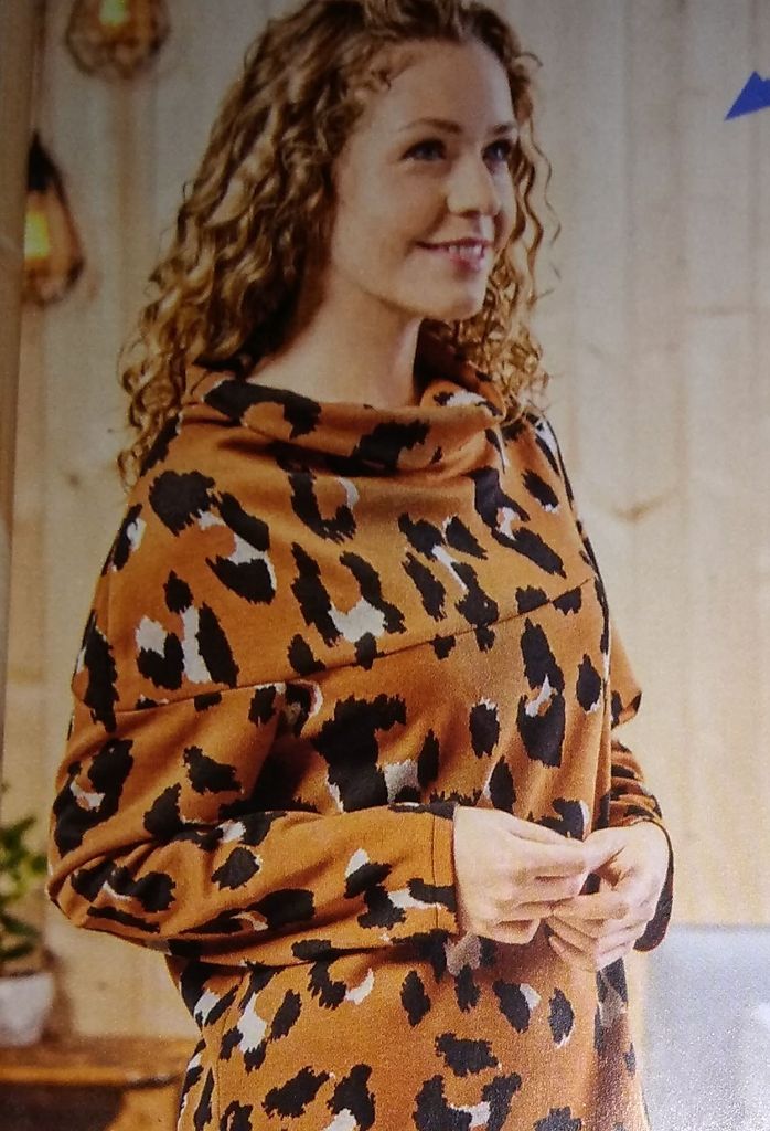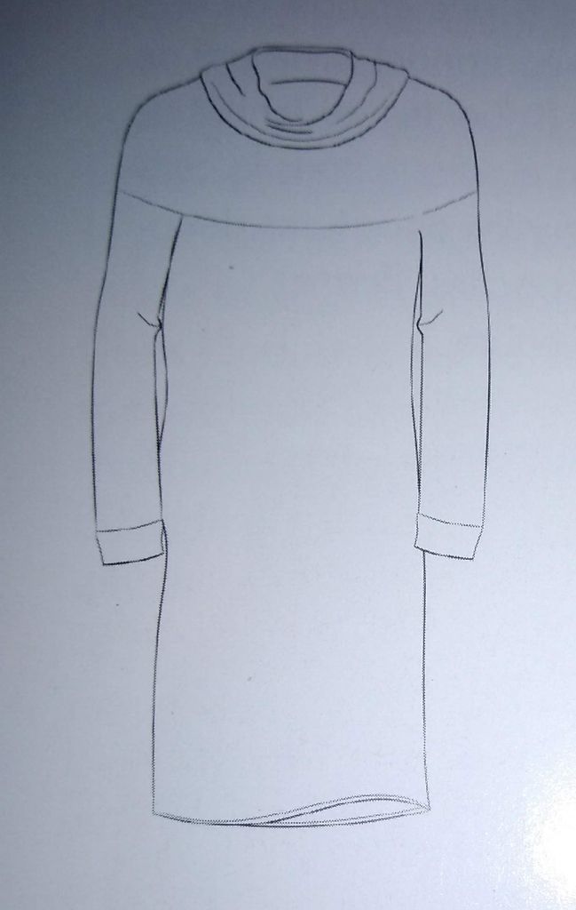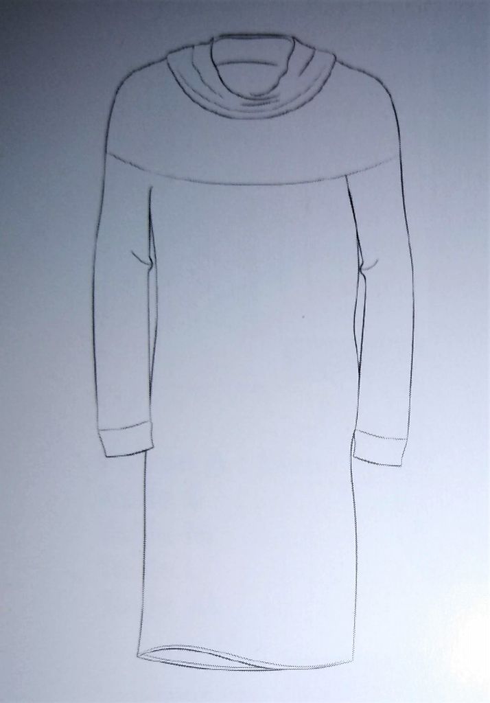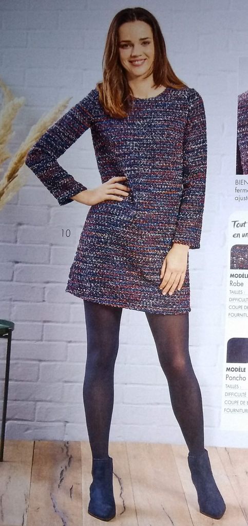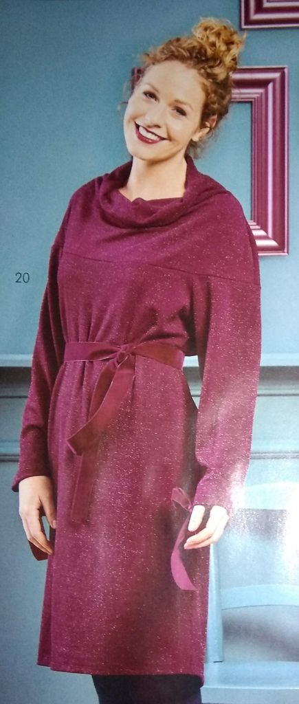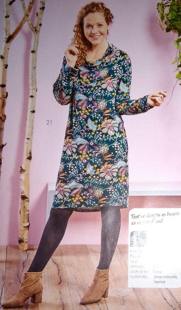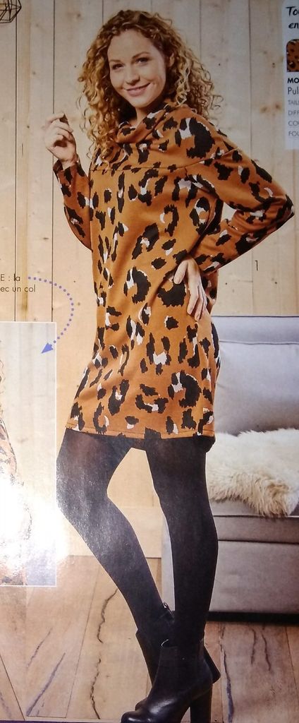 Mon deuxième coup de cœur est surtout pour le tissu. Ensuite la robe, qui est indiquée comme pull d’ailleurs… Elle est assez simple. Ses manches sont longues. Le grand empiècement arrondi est garni d’un col roulé. Elle va du S au XXL.