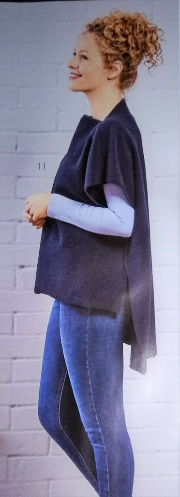 Ici nous avons un poncho plutôt sympa, vous ne trouvez pas. Le devant est twisté, il s’enfile par la tête. Il va de la taille S au XL.
