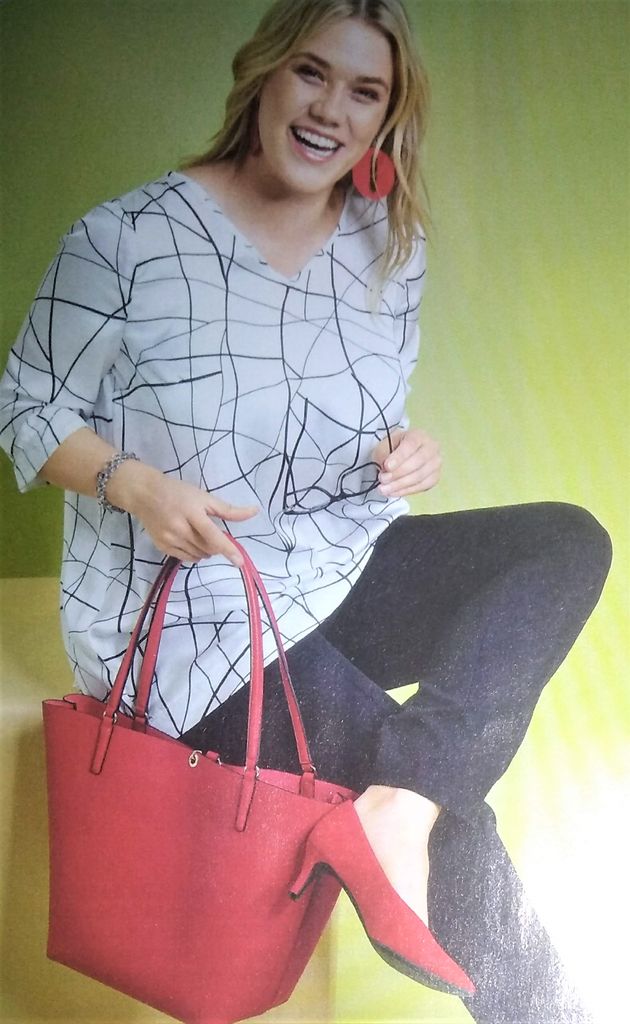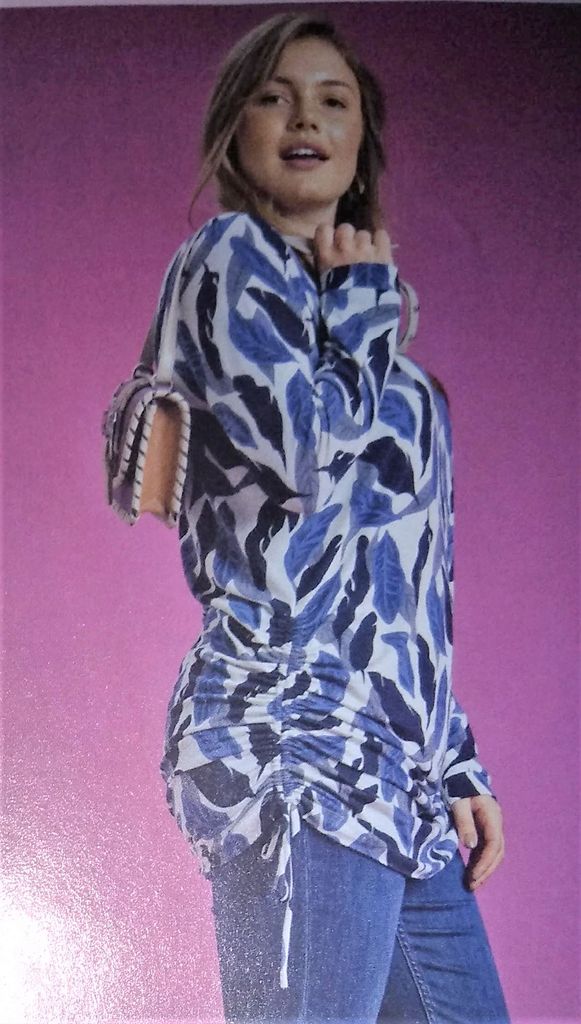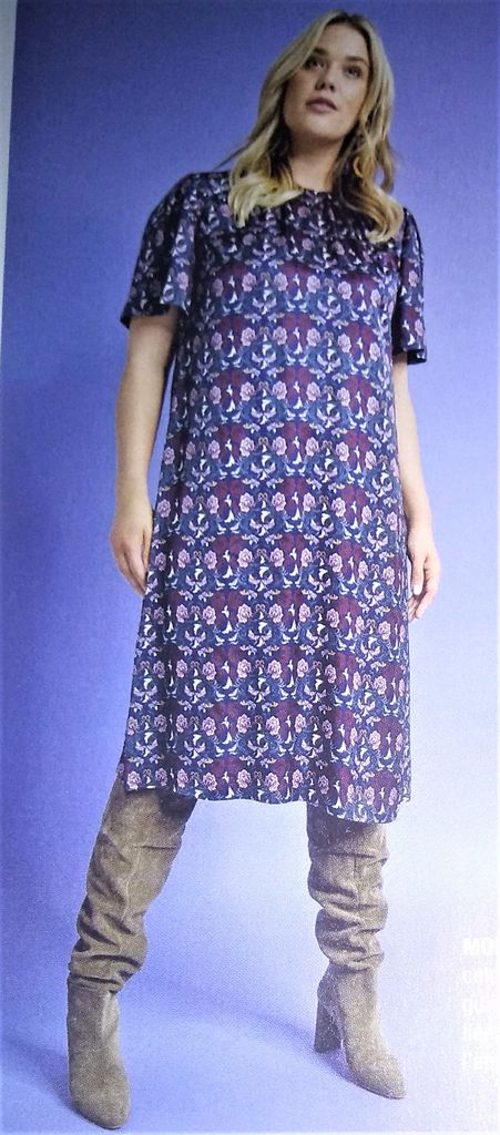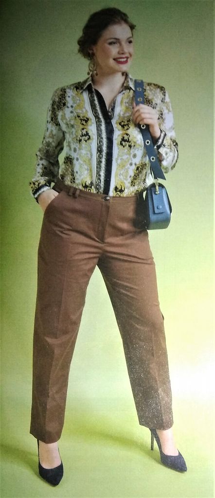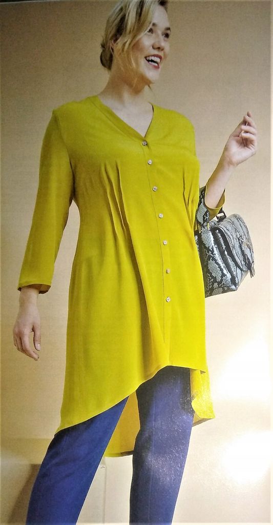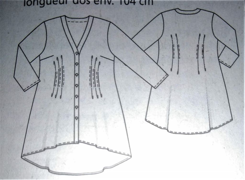 J’adore cette chemise très flatteuse pour la silhouette. Elle possède une encolure en V avec parement visible faisant office de patte de boutonnage. L’ourlet est plus long dans le dos que le devant. Les manches sont de longueur 7/8éme. Les séries de pinces sur l’endroit façon nervures allongent la silhouette. Elle va de la taille 44 au 56.