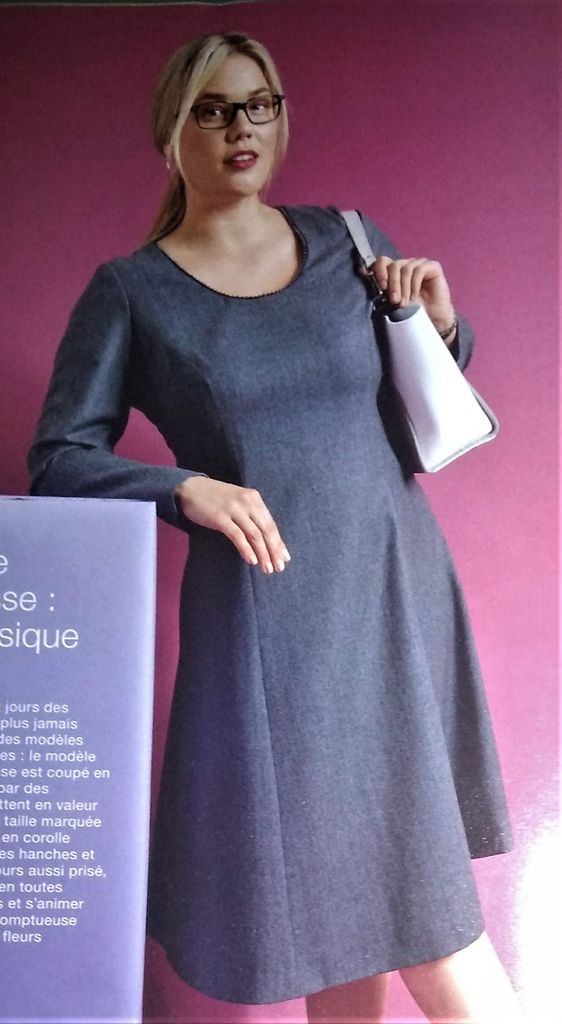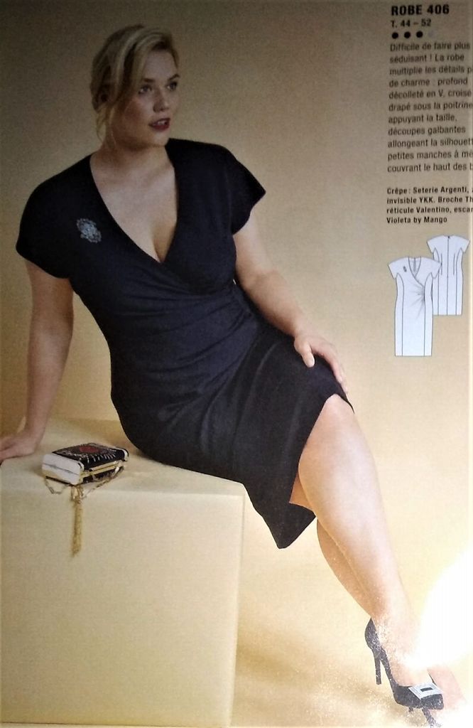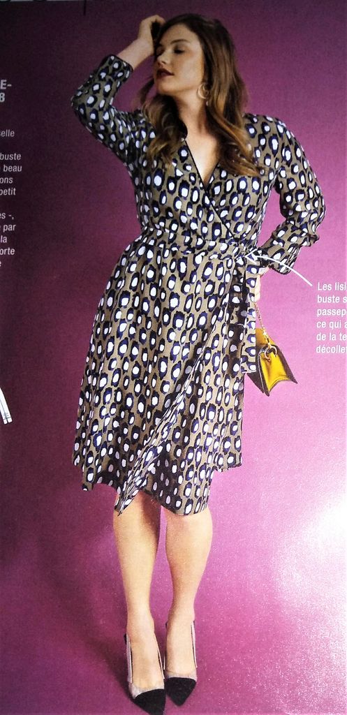 Voici une robe que je trouve superbe! L’indémodable robe portefeuille! Le buste croisé en V profond est sublimé par un passepoil contrastant et garni d’un petit col montant. La jupe est évasée tout en souplesse. Elle va de la taille 44 au 52.