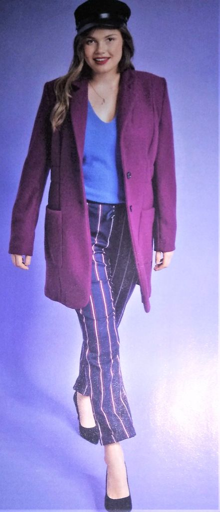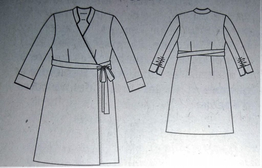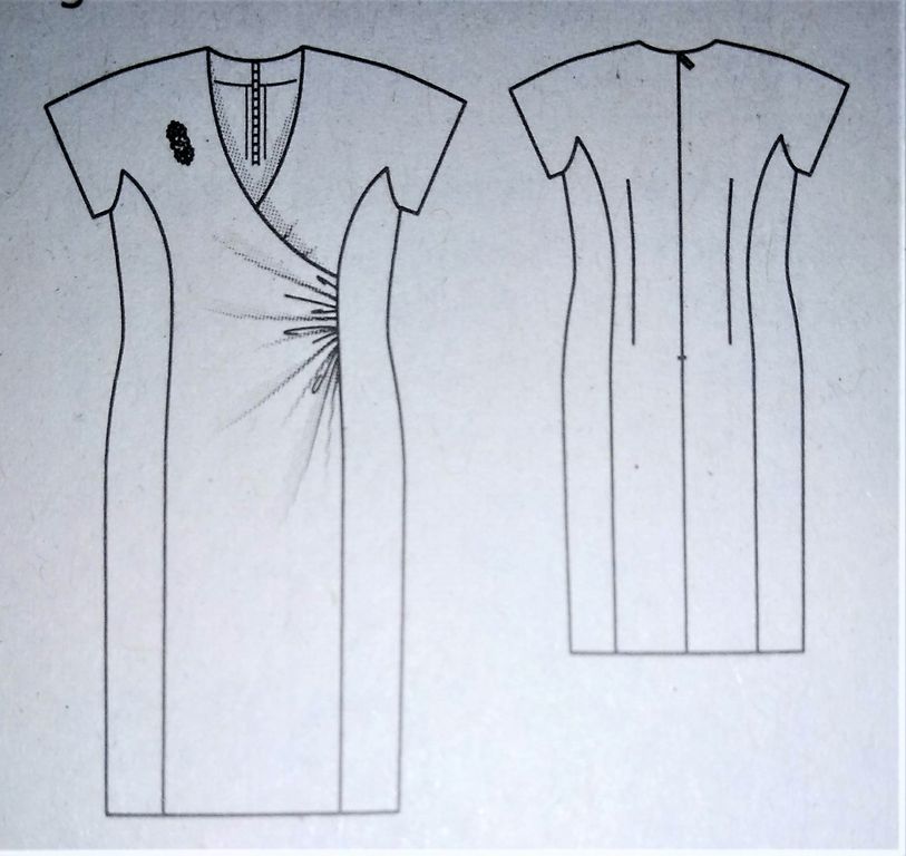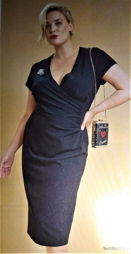 Et celle ci! C’est une tuerie! Elle est de forme fourreau mais avec un buste croisé mais aussi drapé. Les découpes princesses galbent la silhouette et se terminent sur des mancherons coupés à même. Elle va de la taille 44 au 52.