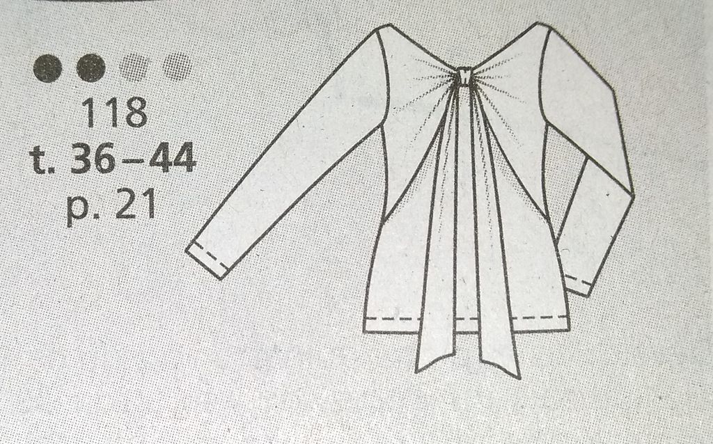 J’aime beaucoup cette blouse de forme cache-cœur. Elle est légèrement plus longue dans le dos. Le buste est orné de plis sur les pans. Elle est nouée à la taille à laide de deux liens. Le bas de la blouse forme une basque depuis la couture de taille. Elle va de la taille 36 au 44.