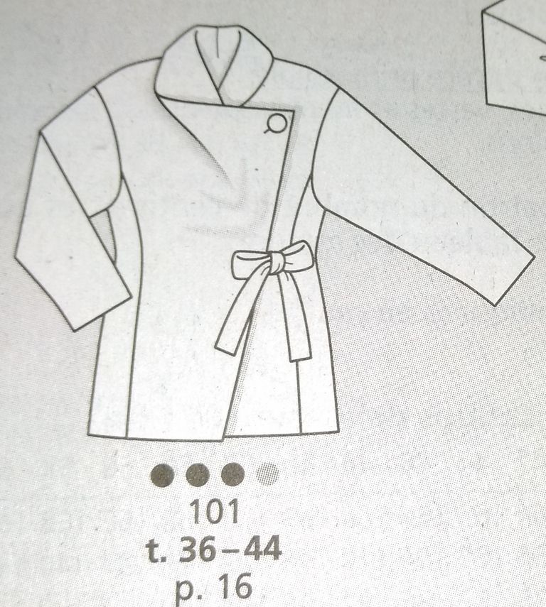 J’aime beaucoup cette veste. Plus particulièrement les différentes façons de la porter. Comme le montre les photos; fermée avec le bouton haut sur le col, ou le col à revers lâché et le pans asymétrique noué sur le côté. Elle inspire le confort et va de la taille 36 au 44.