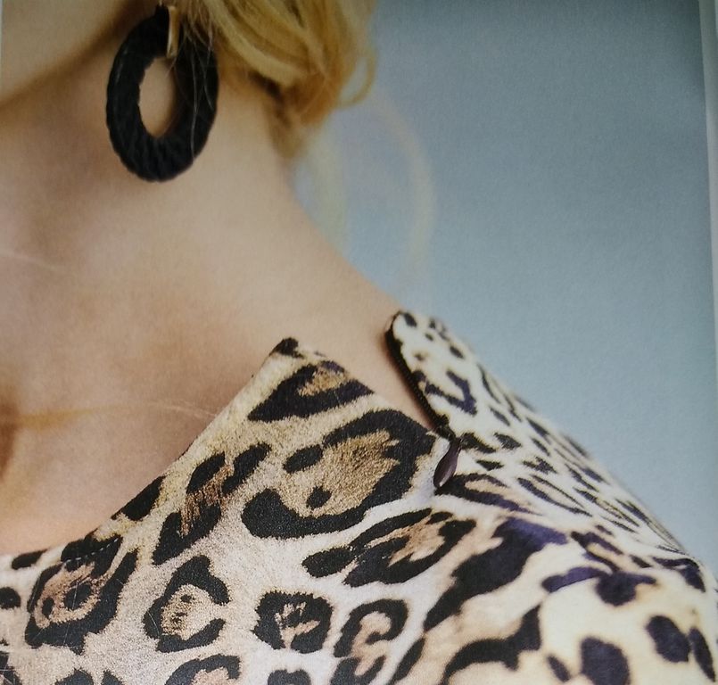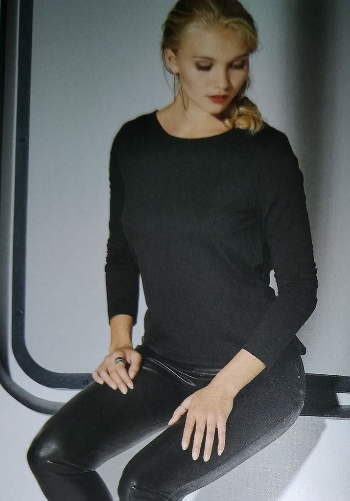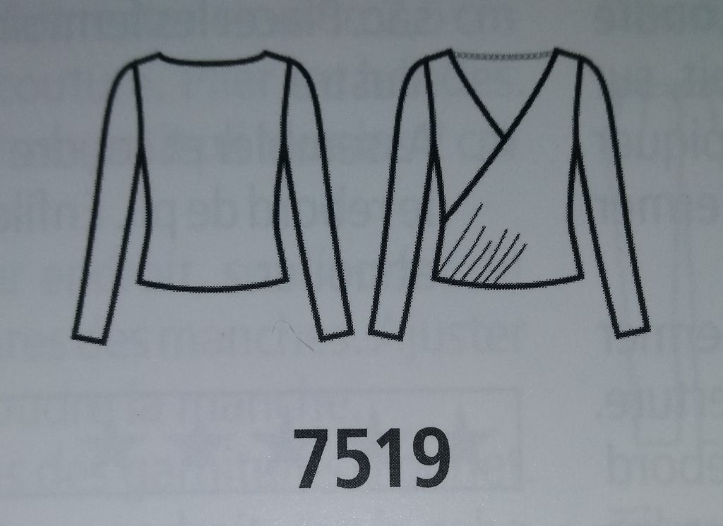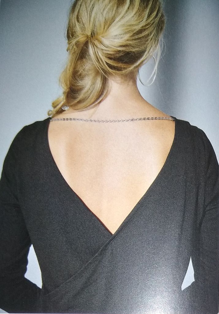 Mon premier coup de cœur est pour ce tee-shirt drapé. Le dos est tout simple avec des manche longues, et encolure ronde. Le dos lui est croisé, drapé et orné d’une chaine sur le haut de la profonde encolure en V. Il va de la taille 36 au 48.