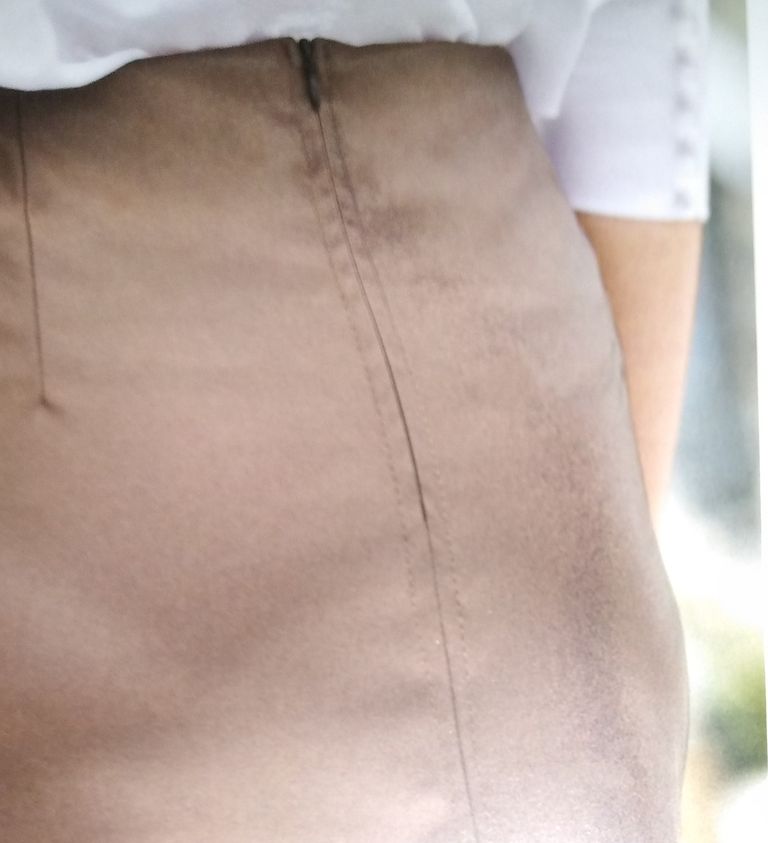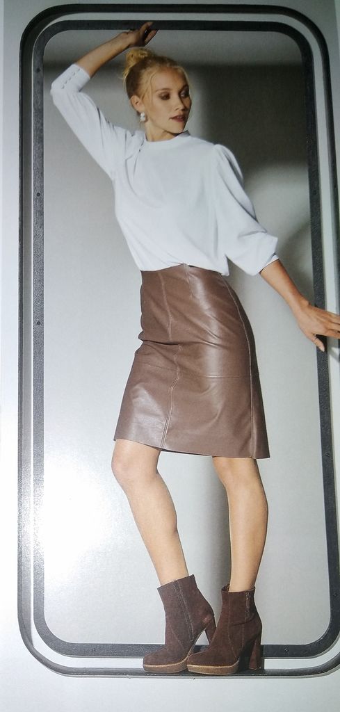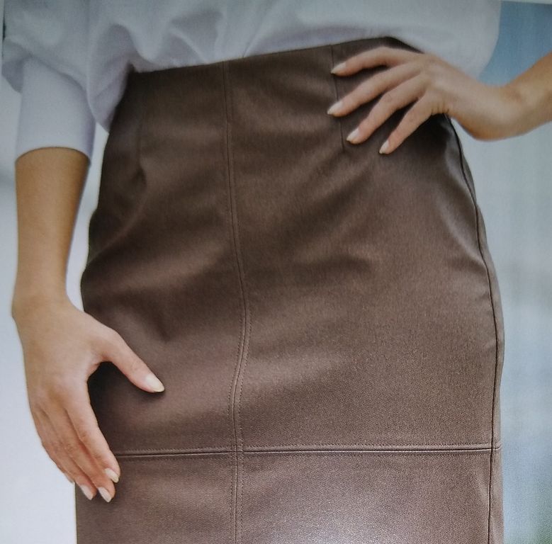 J’aime beaucoup aussi cette jupe en cuir. Le dos et le devant sont en 4 morceaux avec double surpiqures. Elle est droite, avec des pinces, une fermeture à glissière ainsi qu’une fente dans le dos pour plus d’aisance. Elle va de la taille 36 au 48.