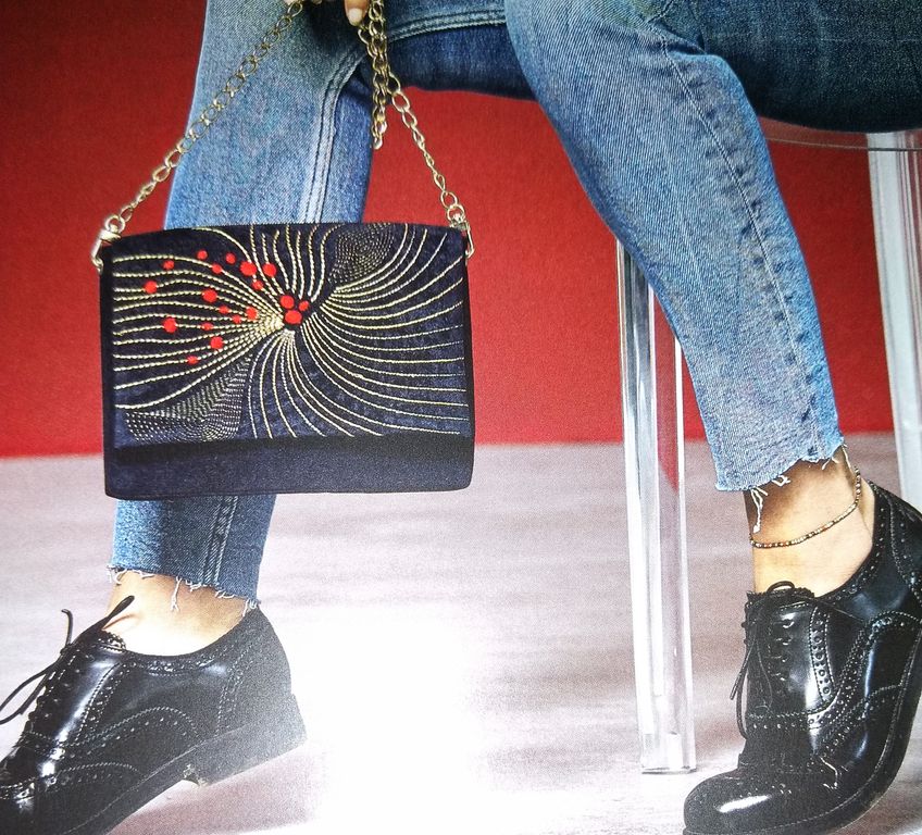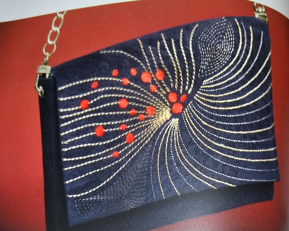 Voici une jolie pochette pour les fêtes ou les soirées. Le rabat est brodé, je trouve que les cercles rouges font trop penser à du houx, donc aux fêtes. Le fichier est à télécharger sur leur site. Lien en bas d’article. La chainette rajoute une touche de raffinement.